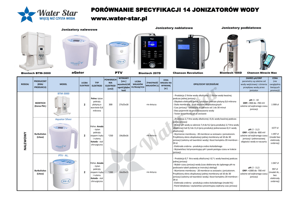 PORÓWNANIE SPECYFIKACJI 14 JONIZATORÓW WODY www