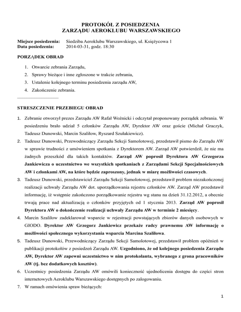 PROTOKÓŁ Z POSIEDZENIA ZARZĄDU AEROKLUBU WARSZAWSKIEGO Miejsce posiedzenia: Data posiedzenia: Siedziba Aeroklubu Warszawskiego, ul. Księżycowa 1 2014-03-31, godz. 18:30 PORZĄDEK OBRAD 1. Otwarcie zebrania Zarządu, 2. Sprawy bieżące i inne zgłoszone w trakcie zebrania, 3. Ustalenie kolejnego terminu posiedzenia zarządu AW, 4. Zakończenie zebrania. ––––––––––––––––– STRESZCZENIE PRZEBIEGU OBRAD 1. Zebranie otworzył prezes Zarządu AW Rafał Woźnicki i odczytał proponowany porządek zebrania. W posiedzeniu brało udział 5 członków Zarządu AW, Dyrektor AW oraz goście (Michał Graczyk, Tadeusz Dunowski, Marcin Szaliłow, Ryszard Szułakiewicz). 2. Tadeusz Dunowski, Przewodniczący Zarządu Sekcji Samolotowej, przedstawił pismo do Zarządu AW w sprawie trudności z umówieniem spotkania z Dyrektorem AW. Zarząd AW potwierdził, że nie ma żadnych przeszkód dla takich kontaktów. Zarząd AW poprosił Dyrektora AW Grzegorza Jankiewicza o uczestnictwo we wszystkich spotkaniach z Zarządami Sekcji Specjalnościowych AW i członkami AW, na które będzie zaproszony, jednak w miarę możliwości czasowych. 3. Tadeusz Dunowski, przedstawiciel Zarządu Sekcji Samolotowej, przedstawił problem niezakończonej realizacji uchwały Zarządu AW dot. uporządkowania rejestru członków AW. Zarząd AW przedstawił informację, iż wstępnie zakończono porządkowanie rejestru wg stanu na dzień 31.12.2012, a obecnie trwają prace nad aktualizacją o członków przyjętych od 1 stycznia 2013. Zarząd AW poprosił Dyrektora AW o dokończenie realizacji uchwały Zarządu AW w terminie 2 miesięcy. 4. Marcin Szaliłow zadeklarował wsparcie w rejestracji powstających zbiorów danych osobowych w GIODO. Dyrektor AW Grzegorz Jankiewicz przekaże radcy prawnemu AW informację o możliwości społecznego wykorzystania wsparcia Marcina Szaliłowa. 5. Tadeusz Dunowski, Przewodniczący Zarządu Sekcji Samolotowej, przedstawił problem opóźnień w publikacji protokołów z posiedzeń Zarządu AW. Uzgodniono, że od kolejnego posiedzenia Zarządu AW, Dyrektor AW zapewni uczestnictwo w nim protokolanta, wybranego z grona pracowników AW (tj. bez dodatkowych kosztów). 6. Uczestnicy posiedzenia Zarządu AW omówili konieczność ujednolicenia dostępu do części stron internetowych Aeroklubu Warszawskiego dostępnych po zalogowaniu. 7. W ramach omówienia spraw bieżących: 1 Rafał Woźnicki przedstawił informację po Kongresie Aeroklubu Polskiego, który odbył się 29.03.2014 r. Kongres zatwierdził sprawozdanie Zarządu AP i sprawozdanie finansowe AP za 2013 rok, natomiast odrzucił sprawozdanie Komisji Rewizyjnej AP, m.in. w związku z konfliktem Aeroklub Jeleniogórski – Karkonowskie Stowarzyszenie Szybowcowe. Następnie odbyły się wybory nowych Władz AW, w wyniku których Prezesem AP został ponownie Włodzimierz Skalik. Na 10 członków Zarządu AP wybrano 6 dotychczasowych członków oraz 4 nowych członków, w tym 3 członków Aeroklubu Warszawskiego – Adama Paskę, Marcina Kwiatosza i Stanisława Jaźnickiego. W dalszej części obrad wybrano nową Komisję Rewizyjną AP, arbitrów dyscyplinarnych oraz wprowadzono niewielką zmianę w Statucie AP i Regulaminie Dyscyplinarnym AP. Rafał Woźnicki przedstawił status przygotowań do Warszawa Air Show Bemowo. Do dnia posiedzenia Aeroklub Warszawski nie posiada podpisanej umowy z CUL w sprawie wykorzystania lotniska Warszawa-Babice na potrzeby pokazów lotniczych. Obecnie CUL żąda od AW 200.000 zł netto za wykorzystanie lotniska na potrzeby imprezy, co jest kwotą nieakceptowalną dla AW. Bez podpisania tej umowy, Aeroklub Warszawski nie może finalizować rozmów ze sponsorami i władzami samorządowymi w sprawie finansowania imprezy. We wtorek 1 kwietnia ma się odbyć ostatnie spotkanie negocjacyjne z Dyrektorem CUL w sprawie warunków wykorzystania lotniska, od którego jest uzależniona decyzja w sprawie organizacji imprezy. Zarząd AW zdecydował o konieczności rozesłania autopilota oraz wywieszenia na briefingu samolotowym przypomnienia „o bezwzględnym obowiązku zgłaszania wszelkich uwag dot. stanu technicznego statków powietrznych AW”. Omówiono temat dbałości o czystość samolotów dostępnych w AW. Uzgodniono, iż za ogólną czystość samolotów odpowiadać będą pracownicy Aeroklubu Warszawskiego, jednak ze względu na szczupłość kadrową będziemy prosić i rekomendować instruktorom oraz pilotom czyszczenie samolotu (a w szczególności jego szyb) bezpośrednio po locie w celu doprowadzenia do stanu nie gorszego niż przed lotem – tzn. pilot ma otrzymać do lotu samolot czysty (za co odpowiada AW), a po locie ma oddać samolot czysty (za co odpowiada pilot). 8. Ustalono termin kolejnego zebrania Zarządu AW na 14.04.2014 godz. 18:30. (-) ___________________________ Piotr Maciejewski Sekretarz Zarządu Aeroklubu Warszawskiego (-) ___________________________ Rafał Woźnicki Prezes Zarządu Aeroklubu Warszawskiego 2