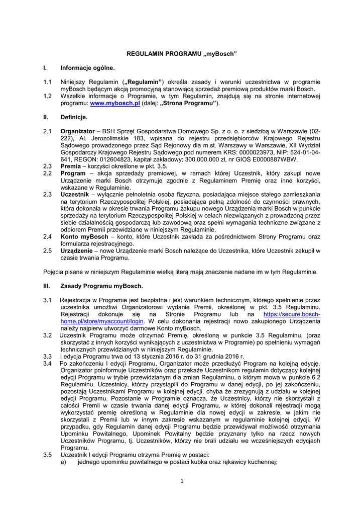 REGULAMIN PROGRAMU „myBosch” I. Informacje ogólne. 1.1 Niniejszy Regulamin („Regulamin”) określa zasady i warunki uczestnictwa w programie myBosch będącym akcją promocyjną stanowiącą sprzedaż premiową produktów marki Bosch. Wszelkie informacje o Programie, w tym Regulamin, znajdują się na stronie internetowej programu: www.mybosch.pl (dalej: „Strona Programu”). 1.2 II. Definicje. 2.1 Organizator – BSH Sprzęt Gospodarstwa Domowego Sp. z o. o. z siedzibą w Warszawie (02222), Al. Jerozolimskie 183, wpisana do rejestru przedsiębiorców Krajowego Rejestru Sądowego prowadzonego przez Sąd Rejonowy dla m.st. Warszawy w Warszawie, XII Wydział Gospodarczy Krajowego Rejestru Sądowego pod numerem KRS: 0000023973, NIP: 524-01-04641, REGON: 012604823, kapitał zakładowy: 300.000.000 zł, nr GIOŚ E0000887WBW. Premia – korzyści określone w pkt. 3.5. Program – akcja sprzedaży premiowej, w ramach której Uczestnik, który zakupi nowe Urządzenie marki Bosch otrzymuje zgodnie z Regulaminem Premię oraz inne korzyści, wskazane w Regulaminie. Uczestnik – wyłącznie pełnoletnia osoba fizyczna, posiadająca miejsce stałego zamieszkania na terytorium Rzeczypospolitej Polskiej, posiadająca pełną zdolność do czynności prawnych, która dokonała w okresie trwania Programu zakupu nowego Urządzenia marki Bosch w punkcie sprzedaży na terytorium Rzeczypospolitej Polskiej w celach niezwiązanych z prowadzoną przez siebie działalnością gospodarczą lub zawodową oraz spełni wymagania techniczne związane z odbiorem Premii przewidziane w niniejszym Regulaminie. Konto myBosch – konto, które Uczestnik zakłada za pośrednictwem Strony Programu oraz formularza rejestracyjnego. Urządzenie – nowe Urządzenie marki Bosch należące do Uczestnika, które Uczestnik zakupił w czasie trwania Programu. 2.3 2.2 2.3 2.4 2.5 Pojęcia pisane w niniejszym Regulaminie wielką literą mają znaczenie nadane im w tym Regulaminie. III. Zasady Programu myBosch. 3.1 Rejestracja w Programie jest bezpłatna i jest warunkiem technicznym, którego spełnienie przez uczestnika umożliwi Organizatorowi wydanie Premii, określonej w pkt. 3.5 Regulaminu. Rejestracji dokonuje się na Stronie Programu lub na https://secure.boschhome.pl/store/myaccount/login. W celu dokonania rejestracji nowo zakupionego Urządzenia należy najpierw utworzyć darmowe Konto myBosch. Uczestnik Programu może otrzymać Premię, określoną w punkcie 3.5 Regulaminu, (oraz skorzystać z innych korzyści wynikających z uczestnictwa w Programie) po spełnieniu wymagań technicznych przewidzianych w niniejszym Regulaminie. I edycja Programu trwa od 13 stycznia 2016 r. do 31 grudnia 2016 r. Po zakończeniu I edycji Programu, Organizator może przedłużyć Program na kolejną edycję. Organizator poinformuje Uczestników oraz przekaże Uczestnikom regulamin dotyczący kolejnej edycji Programu w trybie przewidzianym dla zmian Regulaminu, o którym mowa w punkcie 6.2 Regulaminu. Uczestnicy, którzy przystąpili do Programu w danej edycji, po jej zakończeniu, pozostają Uczestnikami Programu w kolejnej edycji, chyba że zrezygnują z udziału w kolejnej edycji Programu. Pozostanie w Programie oznacza, że Uczestnicy, którzy nie skorzystali z całości Premii w czasie trwania danej edycji Programu, w której dokonali rejestracji mogą wykorzystać premię określoną w Regulaminie dla nowej edycji w zakresie, w jakim nie skorzystali z Premii lub w innym zakresie wskazanym w regulaminie kolejnej edycji. W przypadku, gdy Regulamin danej edycji Programu będzie przewidywał możliwość otrzymania Upominku Powitalnego, Upominek Powitalny będzie przyznany tylko na rzecz nowych Uczestników Programu, tj. Uczestników, którzy nie brali udziału we wcześniejszych edycjach Programu. Uczestnik I edycji Programu otrzyma Premię w postaci: a) jednego upominku powitalnego w postaci kubka oraz rękawicy kuchennej; 3.2 3.3 3.4 3.5 1 możliwości jednorazowego darmowego skorzystania z jednej z poniższych usług serwisowych Organizatora Programu w odniesieniu do zakupionego Urządzenia. Pełny opis usług znajduje się na stronie http://www.bosch-home.pl/store/category/uslugi; Uczestnik może wybrać jedną z poniższych Usług: Podłączenie zmywarki (nr usługi 00999858) Pakiet zmywarka - pielęgnacja zmywarki (nr usługi 00999860) Podłączenie pralki (nr usługi 00999861) Pakiet pralka - pielęgnacja pralki (nr usługi 00999862) Odkamienienie i pielęgnacja ekspresu– (nr usługi 00999868) Odkamienienie i pielęgnacja piekarnika parowego (nr usługi 00999866) Pakiet okap – pielęgnacja okapu (nr usługi 00999869) Instruktaż z obsługi wybranego urządzenia (nr usługi 00999864) Usługę serwisową należy zamówić za pośrednictwem Call Center Serwisu pod numerem 1 801 191 534 . Każdemu Uczestnikowi przysługuje jedna, wybrana przez niego, bezpłatna usługa serwisowa przez czas uczestnictwa w Programie. c) objęcia zakupionego Urządzenia lub Urządzeń aktualnymi w chwili rejestracji Urządzenia w Programie MyBosch programami przedłużonej gwarancji na wybrane części lub całość urządzenia zgodnie z obowiązującymi w danej chwili zasadami. Szczegółowe informacje o aktualnie obowiązujących programach przedłużonej gwarancji na wybrane części lub całe urządzenia i zasadach jej udzielania, zawierające okres na jaki gwarancja jest przedłużona i w jakim zakresie oraz warunkach tej gwarancji dostępne są na stronie http://www.bosch-home.pl/promocje.html. Korzyści opisane powyżej nie podlegają wymianie na żadne inne świadczenia. Organizator oświadcza, że wartość Premii nie przekracza kwoty 760 zł brutto. 3.6 Uczestnik Programu ma również możliwość skorzystania z 10% rabatu na akcesoria, części zamienne i środki do czyszczenia i pielęgnacji urządzeń w firmowym sklepie online Organizatora Programu dostępnym pod adresem www.bosch-home.pl/store. Szczegółowe informacje odnośnie z