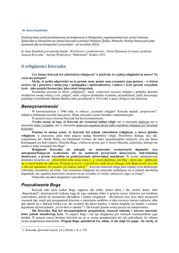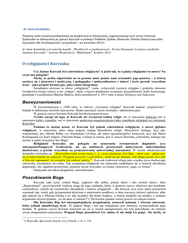dr Anna Kamińska Poniższy tekst został przedstawiony na konferencji w Oświęcimiu, organizowanej m.in. przez Centrum Żydowskie w Oświęcimiu pt. Janusz Korczak w pamięci Polaków, Żydów, Niemców. Pamięć historyczna jako wyzwanie dla teraźniejszości i przyszłości - we wrześniu 2012r. dr Anna Kamińska jest autorką książki „Wrażliwość a podmiotowość. Teoria Emanuela Levinasa i praktyka Janusza Korczaka”. Instytut Wydawniczy "Maksimum". Kraków 2012. O religijności Korczaka Czy Janusz Korczak był człowiekiem religijnym? A jeżeli tak, to o jakiej religijności tu mowa? Na czym ona polegała? Myślę, że próba odpowiedzi na to pytanie może pomóc nam zrozumieć jego postawę - w której zawiera się i pisarstwo i medycyna, i pedagogika i społecznikostwo, i śmierć i życie (przede wszystkim życie – jako projekt formacyjny, jako całość integralna). Świadomie używam tu słowa „religijność”, niem. religiosität (uczucie religijne i praktyka dawania świadectwa swojej wiary), a nie „religia”, niem. religion (konkretne wyznanie, przynależność, kult), korzystając poniekąd z rozróżnienia Martina Bubera, które przedstawił w 1913 roku w pracy Religion und Judentum. Bezwyznaniowość W kwestionariuszu z 1940 roku, w rubryce „wyznanie religijne” Korczak napisał „mojżeszowe”. Jednak ta deklaracja niewiele nam powie. Miała znaczenie czysto formalne i administracyjne. W gruncie rzeczy bowiem Korczak był bezwyznaniowcem. Trzeba zacząć od tego, że Korczak nie wyznawał żadnej religii: ani w znaczeniu doktryny ani w znaczeniu kultu i rytuałów, ani w znaczeniu społeczno-organizacyjnym (jako wspólnoty religijnej czy instytucji Kościoła). Pomimo to można uznać, że Korczak był jednak człowiekiem religijnym, a nawet głęboko religijnym, w znaczeniu, jakie temu pojęciu nadają filozofowie religii, filozofowie dialogu, tacy jak, wspomniany już, Martin Buber czy Emmanuel Lévinas, ale także egzystencjaliści teistyczni, tacy jak Søren Kierkegaard czy Karl Jaspers. Filozofia Boga, o której tu mowa, jest w istocie filozofią „człowieka, którego nie można w pełni zrozumieć bez Boga”. Religijność Korczaka nie polegała na uznawaniu zewnętrznych dogmatów (czy antropomorfizujących wyobrażeń), ale na osobistych przeżyciach mistycznych, indywidualnej duchowości, a przede wszystkim na praktykowaniu uniwersalnej moralności. W swoim młodzieńczym dzienniku stwierdza on: „Stworzyłem sobie nową wiarę […], czysto duchową. Jest Bóg – mówi ona – jakim jest, na to umysł ludzki nie odpowie. Postępuj uczciwie i czyń dobrze, módl się nie dlatego, żeby Boga prosić, lecz aby o Nim nie zapomnieć, bo wszędzie Go widzieć należy”1. Korczak traktował religię jako cząstkę życia duchowego człowieka, niezależnie od wieku. Tak rozumiana religijność nie oznaczała zamknięcia się w ramach określonej dogmatyki, ale, zupełnie przeciwnie, otwarcie się na wszystko, co święte i przeżycie „tego, co święte”. Oznaczała ona także pragnienie i poszukiwanie. Poszukiwanie Boga Korczak całe życie szukał Boga, najpierw dla siebie, potem także i dla swoich dzieci. Jako „Bogoiskatiel”, przywiązywał większą wagę do tego szukania, które w gruncie rzeczy właściwe jest każdemu człowiekowi, aniżeli do rozmaitości obrządków i kultów religijnych – dla których nota bene także przejawiał szacunek (np. wtedy gdy przypominał dzieciom o zmówieniu modlitwy w dniu rocznicy śmierci rodziców, albo gdy spierał się z Maryną Falską o to, aby urządzić dla dzieci kaplicę, w której mogłyby się modlić, a zamiast argumentu używał pytania: „co im dasz w zamian?”). Do kwestii pytania wrócę jeszcze na samym końcu. Dla Korczaka Bóg był niezaspokajalnym pragnieniem, oznaczał tęsknotę i wieczne marzenie, które jednak umożliwiają życie. To pojęcie Boga i ten typ religijności jest istotnym wyznacznikiem jego działań. W gruncie rzeczy bowiem kierował się on w swoim postępowaniu nie tyle potrzebami, ile właśnie owym pragnieniem-marzeniem. Pragnął Boga, poszukiwał Go, mimo, iż nie mógł Go pojąć. Ale myślę, że 1 J. Korczak, Spowiedź motyla, [w:] Dzieła, t. 6, s. 133. można uznać, iż Korczak swoim poszukiwaniem nadał Bogu sens. [Jak stwierdza filozof religii, E. Lévinas: „Nieskończoność we mnie” oznacza ludzką myśl szukającą Boga. „Myślę, że Bóg nie ma sensu poza poszukiwaniem Boga”2.] Oczywiście, trzeba dodać, że to poszukiwanie jest dla Korczaka także źródłem wewnętrznego dramatu, prowokuje wiele sprzecznych pytań, generuje światopogląd zbudowany na paradoksach. „Za wiele wiesz, aby wierzyć, za mało, aby wiarę utraconą odzyskać, a nie wierzyć i kochać nie umiesz, i cierpisz” 3. A jednak, mimo wszystko Korczak jest przekonany, że człowiek jest tym bardziej człowiekiem, im więcej pragnie, to znaczy, gdy uznaje moralne prawo do wybiegania poza istniejące uwarunkowania, prawo do odmowy przystosowania, do przekraczania ograniczeń rzeczywistości. To poszukiwanie oznacza więc także zdolność do buntu i odrzucenia idei „Boga ekonomicznego”. Odrzucenie idei „Boga ekonomicznego” Posługuję się tutaj sformułowaniem filozofa religii E. Lévinasa, ponieważ myślę, że pomaga ono głębiej zrozumieć religijność Korczaka, unikając zarazem tego, przed czym, swoim eseju Żywe rozwiązanie, przestrzega Andrzej Menzwel, czyli „udziecinniania Korczaka”, zamykania go w dziecinnym pokoju, jak „w domu niewoli”. Trzeba wyjaśnić, że Bóg Korczaka to nie jest „Bóg ekonomiczny”, Bóg nadprzyrodzonych mocy, „Bóg jako sędzia”, który każe i wynagradza, Bóg jako antropomorficzny wytwór ludzkiej wyobraźni i narzędzie realizacji własnych potrzeb. To nie jest ten „prymitywny Bóg, który rozdaje nagrody, wymierza kary lub przebacza grzechy, i w swej dobroci traktuje ludzi jak wieczn
