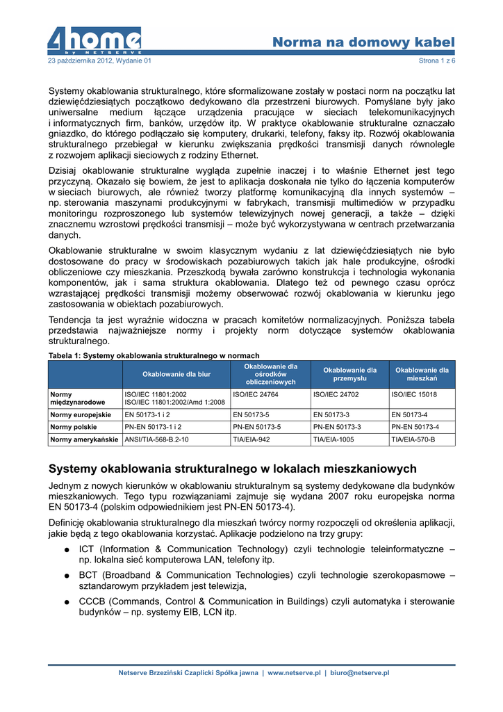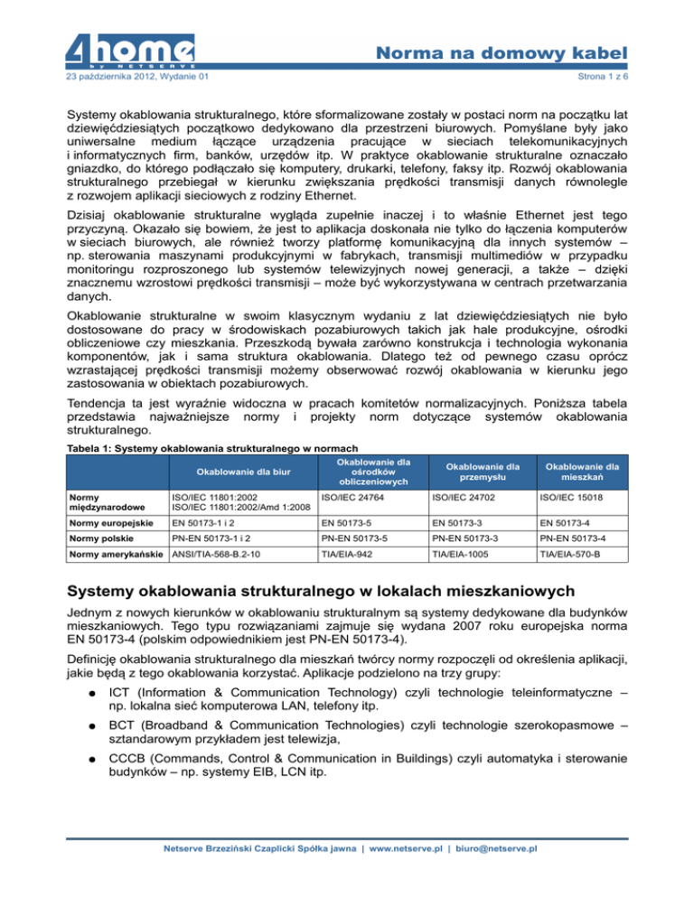 Norma na domowy kabel 23 października 2012, Wydanie 01 Strona 1 z 6 Systemy okablowania strukturalnego, które sformalizowane zostały w postaci norm na początku lat dziewięćdziesiątych początkowo dedykowano dla przestrzeni biurowych. Pomyślane były jako uniwersalne medium łączące urządzenia pracujące w sieciach telekomunikacyjnych i informatycznych firm, banków, urzędów itp. W praktyce okablowanie strukturalne oznaczało gniazdko, do którego podłączało się komputery, drukarki, telefony, faksy itp. Rozwój okablowania strukturalnego przebiegał w kierunku zwiększania prędkości transmisji danych równolegle z rozwojem aplikacji sieciowych z rodziny Ethernet. Dzisiaj okablowanie strukturalne wygląda zupełnie inaczej i to właśnie Ethernet jest tego przyczyną. Okazało się bowiem, że jest to aplikacja doskonała nie tylko do łączenia komputerów w sieciach biurowych, ale również tworzy platformę komunikacyjną dla innych systemów – np. sterowania maszynami produkcyjnymi w fabrykach, transmisji multimediów w przypadku monitoringu rozproszonego lub systemów telewizyjnych nowej generacji, a także – dzięki znacznemu wzrostowi prędkości transmisji – może być wykorzystywana w centrach przetwarzania danych. Okablowanie strukturalne w swoim klasycznym wydaniu z lat dziewięćdziesiątych nie było dostosowane do pracy w środowiskach pozabiurowych takich jak hale produkcyjne, ośrodki obliczeniowe czy mieszkania. Przeszkodą bywała zarówno konstrukcja i technologia wykonania komponentów, jak i sama struktura okablowania. Dlatego też od pewnego czasu oprócz wzrastającej prędkości transmisji możemy obserwować rozwój okablowania w kierunku jego zastosowania w obiektach pozabiurowych. Tendencja ta jest wyraźnie widoczna w pracach komitetów normalizacyjnych. Poniższa tabela przedstawia najważniejsze normy i projekty norm dotyczące systemów okablowania strukturalnego. Tabela 1: Systemy okablowania strukturalnego w normach Okablowanie dla biur Okablowanie dla ośrodków obliczeniowych Okablowanie dla przemysłu Okablowanie dla mieszkań Normy międzynarodowe ISO/IEC 11801:2002 ISO/IEC 11801:2002/Amd 1:2008 ISO/IEC 24764 ISO/IEC 24702 ISO/IEC 15018 Normy europejskie EN 50173-1 i 2 EN 50173-5 EN 50173-3 EN 50173-4 Normy polskie PN-EN 50173-1 i 2 PN-EN 50173-5 PN-EN 50173-3 PN-EN 50173-4 TIA/EIA-942 TIA/EIA-1005 TIA/EIA-570-B Normy amerykańskie ANSI/TIA-568-B.2-10 Systemy okablowania strukturalnego w lokalach mieszkaniowych Jednym z nowych kierunków w okablowaniu strukturalnym są systemy dedykowane dla budynków mieszkaniowych. Tego typu rozwiązaniami zajmuje się wydana 2007 roku europejska norma EN 50173-4 (polskim odpowiednikiem jest PN-EN 50173-4). Definicję okablowania strukturalnego dla mieszkań twórcy normy rozpoczęli od określenia aplikacji, jakie będą z tego okablowania korzystać. Aplikacje podzielono na trzy grupy: ● ICT (Information & Communication Technology) czyli technologie teleinformatyczne – np. lokalna sieć komputerowa LAN, telefony itp. ● BCT (Broadband & Communication Technologies) czyli technologie szerokopasmowe – sztandarowym przykładem jest telewizja, ● CCCB (Commands, Control & Communication in Buildings) czyli automatyka i sterowanie budynków – np. systemy EIB, LCN itp. Netserve Brzeziński Czaplicki Spółka jawna | www.netserve.pl | [email protected] Norma na domowy kabel 23 października 2012, Wydanie 01 Strona 2 z 6 Dla każdej z tych grup określono właściwą strukturę systemu okablowania, media transmisyjne, interfejsy, wydajność kanałów oraz inne szczegóły. Struktura okablowania mieszkaniowego dla aplikacji ICT i BCT Struktura okablowania dla aplikacji z grup ICT oraz BCT jest jednakowa. Poniższy rysunek przedstawia dwa warianty tej struktury. Wariant z jednym Dystrybutorem Domowym przeznaczony jest dla domów jednorodzinnych. Jest to typowa topologia gwiazdy, gdzie punkt centralny promieniście jest połączony z różnego typu gniazdami. Wariant drugi, który zawiera dodatkowo Dystrybutory Wtórne przeznaczony jest dla większych budynków np. wielorodzinnych. Wtedy w każdym mieszkaniu może znaleźć się lokalny Dystrybutor Wtórny. Rysunek 1: Struktura okablowania mieszkaniowego dla aplikacji ICT i BCT Źródło: EN 50173-4 Dystrybutor Domowy HD (Home Distributor) można uznać za serce systemu. Jest to zestaw urządzeń oraz osprzętu dedykowany do obsługi jednego budynku. Zakończone tam są kable biegnące od wszystkich gniazd w budynku, Dystrybutorów Wtórnych (jeśli są wykorzystywane), a także zespołów anten telewizyjnych oraz sieci zewnętrznych (linie telefoniczne, telewizja CATV itp.). W Dystrybutorze Domowym następuje wymiana, mieszanie i udostępnianie wszelkich sygnałów płynących w systemie. W Dystrybutorze Domowym instaluje się urządzenia aktywne sieci LAN (rutery, przełączniki), telefoniczne centralki abonenckie, osprzęt telewizyjny – np. multiswitche, rozgałęźniki czy wzmacniacze, a także osprzęt niezbędny do zakończenia kabli i zarządzania połączeniami. Wtórny Dystrybutor Domowy SHD (Secondary Home Distributor) pełni w pewnej części większego budynku takie same funkcje jak Dystrybutor Domowy w domu jednorodzinnym. Zakończone tam są kable biegnące od wszystkich gniazd w obsługiwanej strefie (najczęściej mieszkaniu) oraz z Dystrybutora Domowego HD. Dystrybutor Wtórny udostępnia podłączonym abonentom sygnały, które otrzymuje z HD, zapewnia łączność pomiędzy abonentami w strefie oraz łączność z innymi strefami poprzez HD. Gniazdo Telekomunikacyjne TO (Telecommunication Outlet) jest to zakończenie 4-parowego okablowania skrętkowego – najczęściej RJ45. Służy do podłączania urządzeń pracujących w sieci LAN (komputery, drukarki itp.) oraz telefonicznej. Gniazdo Szerokopasmowe BO (Broadcast Outlet) to najczęściej zakończenie kabla koncentrycznego, czyli typowe gniazdo telewizyjne (chociaż no