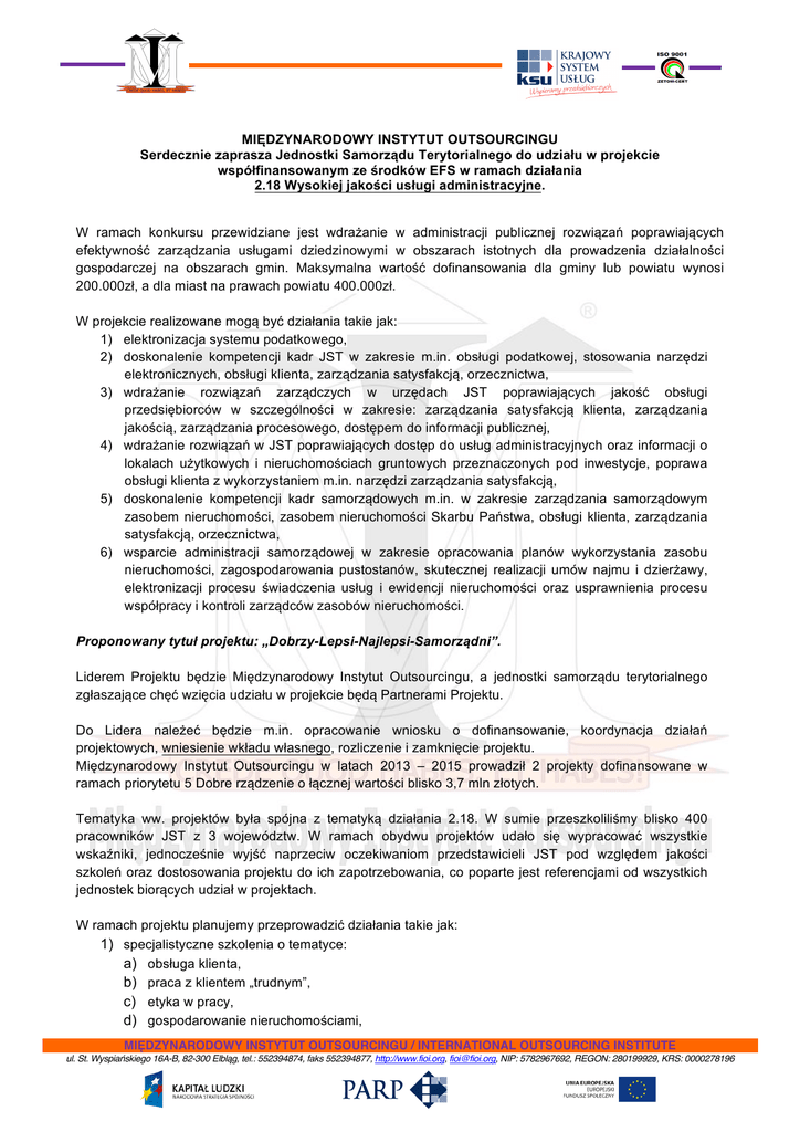 MIĘDZYNARODOWY INSTYTUT OUTSOURCINGU Serdecznie zaprasza Jednostki Samorządu Terytorialnego do udziału w projekcie współfinansowanym ze środków EFS w ramach działania 2.18 Wysokiej jakości usługi administracyjne. W ramach konkursu przewidziane jest wdrażanie w administracji publicznej rozwiązań poprawiających efektywność zarządzania usługami dziedzinowymi w obszarach istotnych dla prowadzenia działalności gospodarczej na obszarach gmin. Maksymalna wartość dofinansowania dla gminy lub powiatu wynosi 200.000zł, a dla miast na prawach powiatu 400.000zł. W projekcie realizowane mogą być działania takie jak: 1) elektronizacja systemu podatkowego, 2) doskonalenie kompetencji kadr JST w zakresie m.in. obsługi podatkowej, stosowania narzędzi elektronicznych, obsługi klienta, zarządzania satysfakcją, orzecznictwa, 3) wdrażanie rozwiązań zarządczych w urzędach JST poprawiających jakość obsługi przedsiębiorców w szczególności w zakresie: zarządzania satysfakcją klienta, zarządzania jakością, zarządzania procesowego, dostępem do informacji publicznej, 4) wdrażanie rozwiązań w JST poprawiających dostęp do usług administracyjnych oraz informacji o lokalach użytkowych i nieruchomościach gruntowych przeznaczonych pod inwestycje, poprawa obsługi klienta z wykorzystaniem m.in. narzędzi zarządzania satysfakcją, 5) doskonalenie kompetencji kadr samorządowych m.in. w zakresie zarządzania samorządowym zasobem nieruchomości, zasobem nieruchomości Skarbu Państwa, obsługi klienta, zarządzania satysfakcją, orzecznictwa, 6) wsparcie administracji samorządowej w zakresie opracowania planów wykorzystania zasobu nieruchomości, zagospodarowania pustostanów, skutecznej realizacji umów najmu i dzierżawy, elektronizacji procesu świadczenia usług i ewidencji nieruchomości oraz usprawnienia procesu współpracy i kontroli zarządców zasobów nieruchomości. Proponowany tytuł projektu: „Dobrzy-Lepsi-Najlepsi-Samorządni”. Liderem Projektu będzie Międzynarodowy Instytut Outsourcingu, a jednostki samorządu terytorialnego zgłaszające chęć wzięcia udziału w projekcie będą Partnerami Projektu. Do Lidera należeć będzie m.in. opracowanie wniosku o dofinansowanie, koordynacja działań projektowych, wniesienie wkładu własnego, rozliczenie i zamknięcie projektu. Międzynarodowy Instytut Outsourcingu w latach 2013 – 2015 prowadził 2 projekty dofinansowane w ramach priorytetu 5 Dobre rządzenie o łącznej wartości blisko 3,7 mln złotych. Tematyka ww. projektów była spójna z tematyką działania 2.18. W sumie przeszkoliliśmy blisko 400 pracowników JST z 3 województw. W ramach obydwu projektów udało się wypracować wszystkie wskaźniki, jednocześnie wyjść naprzeciw oczekiwaniom przedstawicieli JST pod względem jakości szkoleń oraz dostosowania projektu do ich zapotrzebowania, co poparte jest referencjami od wszystkich jednostek biorących udział w projektach. W ramach projektu planujemy przeprowadzić działania takie jak: 1) specjalistyczne szkolenia o tematyce: a) obsługa klienta, b) praca z klientem „trudnym”, c) etyka w pracy, d) gospodarowanie nieruchomościami, MIĘDZYNARODOWY INSTYTUT OUTSOURCINGU / INTERNATIONAL OUTSOURCING INSTITUTE ul. St. Wyspiańskiego 16A-B, 82-300 Elbląg, tel.: 552394874, faks 552394877, http://www.fioi.org, [email protected], NIP: 5782967692, REGON: 280199929, KRS: 0000278196 e) f) g) h) i) j) k) l) 2) 3) 4) 5) 6) 7) zagospodarowanie przestrzenne, zarządzanie finansami w JST, postępowanie z konfliktami interesów, ustalanie podatków i opłat lokalnych, zarządzanie procesowe, kwantyfikacja celów, zarządzanie satysfakcją, Kodeks Postępowania Administracyjnego, oraz inne tematy zaproponowane przez Przedstawicieli JST, doskonalenie kadr JST poprzez udział pracowników w studiach podyplomowych takich jak: a) samorząd terytorialny i rozwój lokalny, b) zarządzanie nieruchomościami, c) szacowanie nieruchomości, d) rachunkowość budżetowa, e) podatki i opłaty lokalne, warsztaty, szkolenia oraz doradztwo w zakresie opracowywania planów rewitalizacji (produktem będzie dokument „Program rewitalizacji dla Gminy”) – zgodnie z Ustawą z dnia 9 października 2015 roku o rewitalizacji Gminy musza posiadać wdrożony program rewitalizacji – przepisy weszły w życie w dniu 01 stycznia 2016 roku, zakup oprogramowania do obsługi podatków, nieruchomości wraz z niezbędnymi szkoleniami z zakresu oprogramowania, wdrożenie wymagań Rozporządzenia Rady Ministrów z dnia 12 kwietnia 2012 r. w sprawie Krajowych Ram Interoperacyjności, minimalnych wymagań dla rejestrów publicznych i wymiany informacji w postaci elektronicznej oraz minimalnych wymagań dla systemów teleinformatycznych (Dz. U. 2012, pozycja 526), wypełnianie wymagań obowiązuje wszystkie JST od dnia 31 maja 2015 roku, ponowna ocena standingu urzędu z zastosowaniem metody CAF, opracowanie i wdrożenie w JST minimalnego zakresu zasad (procedur) współpracy z inwestorem, rozwiązań podnoszących atrakcyjność inwestycyjną JST, w tym określenie zasad przygotowywania, aktualizacji i upowszechniania informacji dot. oferty inwestycyjnej. Na obecnym etapie przygotowywania projektu przewidujemy także inne zadania – zaproponowane przez Partnerów, wg indywidualnych potrzeb wpisujących się w tematykę poddziałania 2.18. Ekspertem wiodącym w zakresie doskonalenia JST w naszym projekcie będzie autorytet uznany w skali międzynarodowej Pan Marek Jefremienko-Przyłubski, autor i wykonawca innowacyjnych rozwiązań zarządczych, szkoleń oraz dokumentacji strategicznej dla administracji rządowej i samorządowej. W celu przystąpienia do projektu prosimy o wypełnienie deklaracji uczestnictwa (w załączeniu). Więcej informacji udzielamy pod numerem telefonu 55 239 48 74, e-mailowo: [email protected]. Zgłoszenia chęci udziału w projekcie prosimy przesyłać drogą e-mailową: [email protected] Zapr