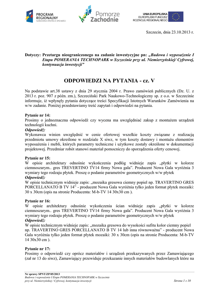 Szczecin, dnia 23.10.2013 r. Dotyczy: Przetargu nieograniczonego na zadanie inwestycyjne pn: „Budowa i wyposażenie I Etapu POMERANIA TECHNOPARK w Szczecinie przy ul. Niemierzyńskiej/ Cyfrowej, kontynuacja inwestycji” ODPOWIEDZI NA PYTANIA - cz. V Na podstawie art.38 ustawy z dnia 29 stycznia 2004 r. Prawo zamówień publicznych (Dz. U. z 2013 r. poz. 907 z późn. zm.), Szczeciński Park Naukowo-Technologiczny sp. z o.o. w Szczecinie informuje, iż wpłynęły pytania dotyczące treści Specyfikacji Istotnych Warunków Zamówienia na w/w zadanie. Poniżej przedstawiamy treść zapytań i odpowiedzi na pytania. Pytanie nr 14: Prosimy o jednoznaczna odpowiedź czy wycena ma uwzględniać zakup z montażem urządzeń technologii kuchni. Odpowiedź: Wykonawca winien uwzględnić w cenie ofertowej wszelkie koszty związane z realizacją przedmiotu umowy określone w rozdziale X siwz, w tym koszty dostawy i montażu elementów wyposażenia i mebli, których parametry techniczne i użytkowe zostały określone w dokumentacji projektowej. Przedmiar robót stanowi materiał pomocniczy do sporządzenia oferty cenowej. Pytanie nr 15: W opisie architektury odnośnie wykończenia podłóg widnieje zapis „płytki w kolorze ciemnoszarym.. gres TREVERTINO TV14 firmy Nowa gala”. Producent Nowa Gala wyróżnia 3 wymiary tego rodzaju płytek. Proszę o podanie parametrów geometrycznych w/w płytek Odpowiedź: W opisie technicznym widnieje zapis: „mozaika gresowa ciemny popiel np. TRAVERTINO GRES PORCELLANATO B TV 14” - producent Nowa Gala wyróżnia tylko jeden format płytek mozaiki: 30 x 30cm (opis na stronie Producenta: M-b-TV 14 30x30 cm ). Pytanie nr 16: W opisie architektury odnośnie wykończenia ścian widnieje zapis „płytki w kolorze ciemnoszarym.. gres TREVERTINO TV14 firmy Nowa gala”. Producent Nowa Gala wyróżnia 3 wymiary tego rodzaju płytek. Proszę o podanie parametrów geometrycznych w/w płytek Odpowiedź: W opisie technicznym widnieje zapis: „mozaika gresowa do wysokości sufitu kolor ciemny popiel np. TRAVERTINO GRES PORCELLANATO B TV 14 lub inna równoważna” - producent Nowa Gala wyróżnia tylko jeden format płytek mozaiki: 30 x 30cm (opis na stronie Producenta: M-b-TV 14 30x30 cm ). Pytanie nr 17: Prosimy o odpowiedź czy oprócz materiałów i urządzeń przekazywanych przez Zamawiającego (zał nr 13 do siwz), Zamawiający przewiduje przekazanie innych materiałów budowlanych które na Nr sprawy SPNT/ZP/05/2013 Budowa i wyposażenie I Etapu POMERANIA TECHNOPARK w Szczecinie przy ul. Niemierzyńskiej / Cyfrowej, kontynuacja inwestycji Strona 1 z 10 obiekcie pozostawił wcześniejszy wykonawca. Jeżeli nie to kto ma ponieść koszt wywozu i ewentualnej utylizacji tych materiałów? Odpowiedź: Zamawiający przedstawił wykaz materiałów będących przedmiotem przekazania nieodpłatnego, wybranemu Wykonawcy – w Załączniku nr 13 do siwz. Zamawiający dokona uzupełniającej modyfikacji Załącznika Nr 13 polegajacej na uzupełnieniu wykazu elementów systemu wentylacji. Dostawa pozostałych materiałów i urządzeń, niezbędnych do wykonania przedmiotu zamówienia leży po stronie Wykonawcy. Pytanie nr 18: Prosimy o odpowiedź czy Inwestor przewidział wynagrodzenie dodatkowe za prace naprawcze po poprzednim Wykonawcy elementów błędnie wykonanych a w chwili obecnej ukrytych (np. nieszczelności pokrycia dachowego, błędnie wykonania izolacji Hali Garażowej itp., w chwili obecnej jesteśmy po okresie letnich wakacji gdzie nie występowały duże opady natomiast na wiosnę po roztopach takie błędy mogą być ujawnione). Odpowiedź: Zamawiający określił w siwz przedmiot zamówienia tj. zakres robót budowlanych, w sposób zgodny z wymogami art. 31 ustawy prawo zamówień publicznych, w zakresie określonym w Rozporządzeniu Ministra Transportu, Budownictwa i Gospodarki Morskiej z dnia 27 kwietnia 2012 r. w sprawie szczegółowego zakresu i formy projektu budowlanego (Dz.U. z 2012 r. poz. 462). Zasady i warunki zmian zakresu robót określono we wzorze umowy (kontraktu), m.in. w subklauzuli 13.1. Warunków szczególnych Kontraktu. Pytanie nr 19: Prosimy o informację czy Inwestor świadom jest iż dokumentacja udostępniona na stronie Zamawiającego jest na tyle obszerna, iż bardzo trudne jest w tak krótkim czasie zapoznanie się z dokumentacją oraz rzetelne określenie zakresu prac koniecznych do wykonania. W związku z powyższym prosimy o przeniesienie terminu składania ofert. Odpowiedź: Zamawiający dokona modyfikacji siwz w zakresie dotyczącym terminów: wniesienia wadium oraz terminu składania i otwarcia ofert, ustalając odpowiednio: - termin wniesienia wadium: 31.10.2013 r. godz. 9:30 - termin składania ofert: 31.10.2013 r. godz. 9:30 - termin otwarcia ofert: 31.10.2013 r. godz. 10:00. Pytanie nr 20: Teletechnika. System CCTV: Przekazane przedmiary robót nie obejmują pozycji związanych z programowaniem rejestratorów cyfrowych, konfiguracja i programowaniem kamer oraz prac związanych z integracja systemu CCTV z BMS i KD. W jaki sposób ująć prace z tym związane w ofercie? Odpowiedź: W wycenie należy ująć programowanie ww. urządzeń. Zamawiający dokona modyfikacji przedmiotu zamówienia w zakresie przedmiarów. Ponadto, Zamawiający stwierdza że przedmiary robót stanowią jedynie materiał pomocniczy do sporządzenia oferty cenowej. Pytanie nr 21: Teletechnika. System CCTV: Przedmiar nie przewiduje dostawy mebli przystosowanych do zabudowy monitorów i jednostek komputerowych operatorów systemów CCTV, KD, SSWiN, BMS. W jaki sposób ująć prace z tym związane w ofercie? Prosimy o uzupełnienie przedmiaru o niezbędne pozycje. Nr sprawy SPNT/ZP/05/2013 Budowa i wyposażenie I Etapu POMERANIA TECHNOPARK w Szczecinie przy ul. Niemierzyńskiej / Cyfrowej, kontynuacja inwestycji Strona 2 z 10 Odpowiedź: Dostawa mebli przystosowanych do zabudowy monitorów i jednostek komputerowych objęta zostanie odrębnym postępowa