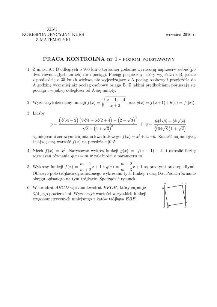 XLVI KORESPONDENCYJNY KURS Z MATEMATYKI wrzesień 2016 r. PRACA KONTROLNA nr 1 - poziom podstawowy 1. Z miast A i B odległych o 700 km o tej samej godzinie wyruszają naprzeciw siebie (po dwu równoległych torach) dwa pociągi. Pociąg pospieszny, który wyjeżdża z B, jedzie z prędkością o 35 km/h większą niż wyjeżdżający z A pociąg osobowy i przyjeżdża do A godzinę wcześniej niż pociąg osobowy osiąga B. Z jakimi prędkościami poruszają się pociągi i w jakiej odległości od A się minęły. 2. Wyznaczyć dziedziny funkcji f (x) = 3. Liczby √ 3 p= √ 3 54 − 2 s |x − 1| − 4 oraz g(x) = f (x + 1) i h(x) = f (|x|). x+2 √ √ 3 9 4+632+4 − 2− 3 √ 2 √ 3+ 1+ 3 1√ 1√ 64 3 8 + 8 3 64 i q= q √ √ 3 64 8 1 + 2 są miejscami zerowym trójmianu kwadratowego f (x) = x2 +ax+b. Znaleźć najmniejszą i największą wartość f (x) na przedziale [0, 5]. 4. Niech f (x) = x2 . Narysować wykres funkcji g(x) = |f (x − 1) − 4| i określić liczbę rozwiązań równania g(x) = m w zależności o parametru m. m+2 m−1 x + 1 i g(x) = x + 1 są prostymi prostopadłymi. m+2 m−3 Obliczyć pole trójkata ograniczonego wykresami tych funkcji i osią Ox. Podać równanie okręgu opisanego na tym trójkącie. Sporządzić rysunek. 5. Wykresy funkcji f (x) = D 6. W kwadrat ABCD wpisano kwadrat EF GH, który zajmuje 3/4 jego powierzchni. Wyznaczyć wartości wszystkich funkcji trygonometrycznych mniejszego z kątów trójkąta EBF. G C H F A E B PRACA KONTROLNA nr 1 - poziom rozszerzony 1. Statek wyrusza (z biegiem rzeki) z przystani A do odległej o 140 km przystani B. Po upływie 1 godziny wyrusza za nim łódź motorowa, dopędza statek w połowie drogi, po czym wraca do przystani A w tym samym momencie, w którym statek przybija do przystani B. Wyznaczyć prędkość statku i prędkość łodzi w wodzie stojącej, wiedząc, że prędkość nurtu rzeki wynosi 4 km/godz. 1 i wyznaczyć jej dziedzinę oraz zbiór wartox ści. Podać wzór funkcji h(x), której wykres jest symetryczny do wykresu f (x) względem punktu (0, 0). Określić liczbę rozwiązań równania f (x) = m w zależności o parametru m. 2. Narysować wykres funkcji f (x) = min x3 , 3. Dla jakich wartości rzeczywistego parametru p równanie (p − 1)x2 − (p + 1)x − 1 = 0 ma dwa pierwiastki tego samego znaku odległe co najwyżej o 1? m x + b są prostymi prostopadłymi, m−1 a pole trójkata ograniczonego wykresami tych funkcji i osią Ox jest równe polu trójkąta ograniczonego tymi wykresami i osią Oy. Wyznaczyć wzory funkcji f i g i obliczyć pole rozważanych trójkątów. Sporządzić rysunek. 4. Wykresy funkcji f (x) = (m − 1)x + 1 i g(x) = 5. Obliczyć wartości p= q 1 √ √ 3 14 log9 21 − log √ 3 3 4 . 19 − 8 3 − 26 − 15 3 i q = log9 8 + log√3 12 q ax + b , wiedząc, że jest cx + d on symetryczny względem punktu (p, q) i przechodzi przez punkt (0, 0). Następnie wyznaczyć wzór i narysować wykres funkcji f (x) = 6. Punkt D dzieli bok AB trójkąta równobocznego ABC w stosunku 2:1. Wyznaczyć stosunek długości promienia okręgu wpisanego w trójkąt ADC do długości promienia okręgu wpisanego w trójkąt DBC. Rozwiązania (rękopis) zadań z wybranego poziomu prosimy nadsyłać do 28 września 2016r. na adres: Wydział Matematyki Politechnika Wrocławska Wybrzeże Wyspiańskiego 27 50-370 WROCŁAW. Na kopercie prosimy koniecznie zaznaczyć wybrany poziom! (np. poziom podstawowy lub rozszerzony). Do rozwiązań należy dołączyć zaadresowaną do siebie kopertę zwrotną z naklejonym znaczkiem, odpowiednim do wagi listu. Prace niespełniające podanych warunków nie będą poprawiane ani odsyłane. Adres internetowy Kursu: http://www.im.pwr.edu.pl/kurs