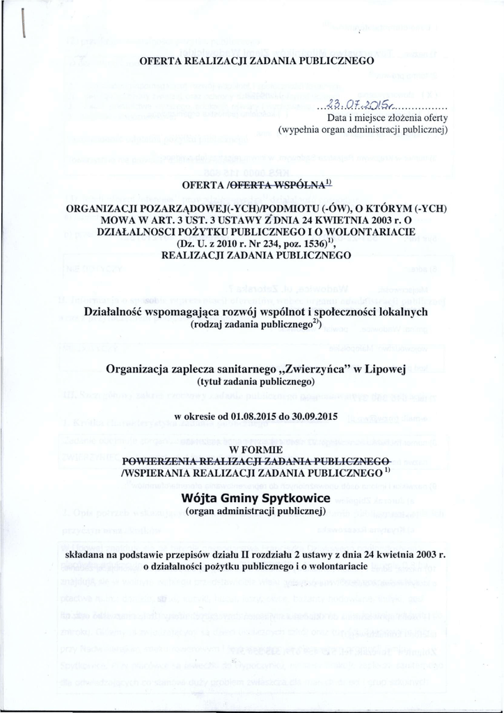 OFERTA REALIZACJIZADANIA PUBLICZNEGO • ..M.:.O.h.iDI.S^. D a t a i miejsce złożenia oferty (wypełnia o r g a n a d m i n i s t r a c j i publicznej) O F E R T A / O F E R T A WSPÓLNA^^ O R G A N I Z A C J I P O Z A R Z Ą D O W E J ( - Y C H ) / P O D M I O T U (-ÓW), O K T Ó R Y M (-YCH) M O W A W A R T . 3 U S T . 3 U S T A W Y Z D N I A 24 K W I E T N I A 2003 r. O DZIAŁALNOŚCI POŻYTKU PUBLICZNEGO I O WOLONTARIACIE (Dz. U . z 2010 r. N r 234, poz. 1536)^\ REALIZACJI ZADANIA PUBLICZNEGO Działalność wspomagająca rozwój wspólnot i społeczności lokalnych (rodzaj zadania publicznego^^) Organizacja zaplecza sanitarnego „Zwierzyńca" w Lipowej (tytuł zadania publicznego) w okresie od 01.08.2015 do 30.09.2015 W FORMIE POWIERZENIA REALIZACJIZADANIA PUBLICZNEGO AYSPIERANIA REALIZACJI ZADANIA P U B L I C Z N E G O Wójta Gminy Spytkowice (organ administracji publicznej) składana na podstawie przepisów działu II rozdziału 2 ustawy z d n i a 24 kwietnia 2003 r. I ' o działalności pożytku publicznego i o wolontariacie str •4.- , I. Dane oferenta/oferentów ' ' 1) nazwa: Towarzystwo Miłośników Ziemi Wadowickiej . 2) forma prawna:"*^ ( X ) stowarzyszenie ( ) fundacja ( ) kościelna osoba prawna ( ) kościelna jednostka organizacyjna ( ) spółdzielnia socjalna ( ) inna 3) numer w Krajowym Rejestrze Sądowym, w innym rejestrze lub ewidencji:^^ KRSOOOO 115 606 4) data wpisu, rejestracji lub utworzenia:^' 5) n r N I P : 12.12.1971 r. 551-22-62-013 . nr R E G O N : 072137527 6) adres: Miejscowość: Wadowice, ul. Zatorska 7. dzielnica lub inna jednostka pomocnicza:^' gmina: Wadowice, powiat®'wadowicki , , ^ ' województwo: Małopolskie kod pocztowy: 34-100 7) tel.: 515 356 317 e-mail: t m z w @ w p . p l poczta: Wadowice. ^ ::i>'\\ : rU) faks: www.tmzwadowice.pl 8) numer rachunku bankowego: 92 1240 4197 1111 0000 4692 1439 nazwa banku: P E K A O S A O/Wadowice. 9) nazwiska i imiona osób upoważnionych do reprezentowania oferenta/oferentów^': a) J u r c z a k Z b i g n i e w b) Bąk J a n c) Krystyna R z e s z o w s k a 10) nazwa, adres i telefon kontaktowy jednostki organizacyjnej bezpośrednio wykonującej zadanie, o którym mowa w ofercie^'. Nie dotyczy . ^ 11) osoba upoważniona d o składania wyjaśnień dotyczących oferty (imię i n a z w i s k o oraz nr telefonu k o n t a k t o w e g o ) Zbigniew Jurczak, tel. 519 459 679, 515 356 317 12) p r z e d m i o t działalności pożytku p u b l i c z n e g o : a) działalność nieodpłatna pożytku p u b l i c z n e g o 1. działalności wspomagającej rozwój wspólnot i społeczności lokalnych; 2. ekologii i ochrony zwierząt oraz ochrony dziedzictwa przyrodniczego; 3. nauki, szkolnictwa wyższego, edukacji, oświaty i wychowania; 4. turystyki i krajoznawstwa; b) działalność odpłatna pożytku p u b l i c z n e g o Towarzystwo nie prowadzi działalności odpłatnej 13) jeżeli oferent /oferenoi^^ prowadzi/prowadząc^ działalność gospodarczą: a) n u m e r w p i s u d o rejestru przedsiębiorców b) p r z e d m i o t działalności gospodarczej NIE D O T Y C Z Y - ' < - II. Informacja o sposobie reprezentacji oferentów wobec organu administracji publicznej wraz z przytoczeniem podstawy prawnej NIE D O T Y C Z Y III. Szczegółowy zakres rzeczowy zadania publicznego proponowanego do realizacji 1. Krótka charakterystyka zadania publicznego Zadanie o b e j m u j e z o r g a n i z o w a n i e i w y k o n a n i e zaplecza s a n i t a r n e g o w obiekcie p n . Z W I E R Z Y N I E C , w Lipowej, ul. L i p o w a 8 g m i n a S p y t k o w i c e 2. Opis potrzeb wskazujących na konieczność wykonania zadania publicznego, opis ich przyczyn oraz skutków W Lipowej z n a j d u j e się na terenie g o s p o d a r s t w a Franciszka D z i a ł o w e g o o g ó l n o d o s t ę p n a placówka e d u k a c y j n o t u r y s t y c z n a o nazwie Z W I E R Z Y N I E C . Na o g r o d z o n y m terenie 0,8 ha z n a j d u j Ą s i ę w w o l n y m w y b i e g u przedstawiciele wielu g a t u n k ó w zwierząt g o s p o d a r s k i c h I ptactwa m.in.: daniele, struś, kucyki, hucuł, kozy, o w c e , b a ż a n t y h o d o w l a n e . Indyki, gęsi itp.,itp. Z w i e r z y n i e c j e s t ogólnie d o s t ę p n y do zwiedzania codziennie, nieodpłatnie o d świtu do z m r o k u . G ł ó w n y m i z w i e d z a j ą c y m i s ą dzieci okolicznych szkół o r a z turyści. Zwierzyniec leży przy N a d w i ś l a ń s k i m szlaku r o w e r o w y m I j e s t atrakcyjnym e l e m e n t e m promocji G m i n y Spytkowice. Przy p l a c ó w c e są ł a w e c z k i do w y p o c z y n k u , niestety brakuje zaplecza sanitarnego dla o d w i e d z a j ą c y c h c o s t a n o w i d u ż y problem zwłaszcza dla m a ł y c h dzieci i grup szkolnych 3. Opis grup adresatów zadania publicznego Dzieci i dorośli oraz turyści o d w i e d z a j ą c y Zwierzyniec i korzystający z Nadwiślańskiego szlaku r o w e r o w e g o i ścieżki s p a c e r o w e j . 4. Uzasadnienie potrzeby dofinansowania z dotacji inwestycji związanych z realizacją zadania publicznego, w szczególności ze wskazaniem w j a k i sposób przyczyni się to do podwyższenia standardu realizacji zadania/^^ 5. Informacja, czy w ciągu ostatnich 5 lat oferent/oferenci^^ otrzymał/otrzymali^^ dotację na dofinansowanie podaniem inwestycji inwestycji, które związanych zostały z realizacją dofinansowane, zadania publicznego z organu który udzielił dofinansowania oraz daty otrzymania dotacji NIE D O T Y C Z Y 6. Zakładane cele realizacji zadania publicznego oraz sposób ich realizacji Celem j e s t podniesienie j a k o ś c i działalności edukacyjnej I promocyjnej placówki Zwierzyniec w Lipowej. Zadanie będzie realizowane p o p r z e z s k o n s t r u o w a n i e i p o s a d o w i e n i e s e z o n o w e g o zaplecza sanitarnego, w y p o s a ż o n e g o w d w a sanitariaty oraz u m y w a l k ę . 7. Miejsce realizacji zadania publicznego Gospodarstwo Franciszka D