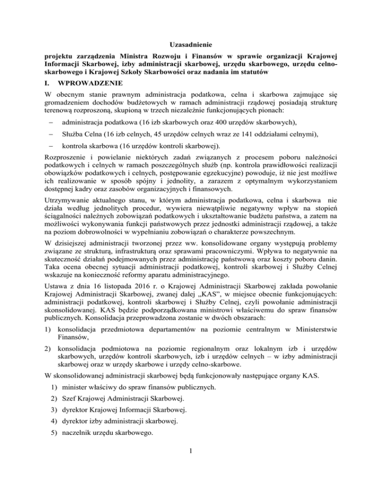 Uzasadnienie projektu zarządzenia Ministra Rozwoju i Finansów w sprawie organizacji Krajowej Informacji Skarbowej, izby administracji skarbowej, urzędu skarbowego, urzędu celnoskarbowego i Krajowej Szkoły Skarbowości oraz nadania im statutów I. WPROWADZENIE W obecnym stanie prawnym administracja podatkowa, celna i skarbowa zajmujące się gromadzeniem dochodów budżetowych w ramach administracji rządowej posiadają strukturę terenową rozproszoną, skupioną w trzech niezależnie funkcjonujących pionach: administracja podatkowa (16 izb skarbowych oraz 400 urzędów skarbowych), Służba Celna (16 izb celnych, 45 urzędów celnych wraz ze 141 oddziałami celnymi), kontrola skarbowa (16 urzędów kontroli skarbowej). Rozproszenie i powielanie niektórych zadań związanych z procesem poboru należności podatkowych i celnych w ramach poszczególnych służb (np. kontrola prawidłowości realizacji obowiązków podatkowych i celnych, postępowanie egzekucyjne) powoduje, iż nie jest możliwe ich realizowanie w sposób spójny i jednolity, a zarazem z optymalnym wykorzystaniem dostępnej kadry oraz zasobów organizacyjnych i finansowych. Utrzymywanie aktualnego stanu, w którym administracja podatkowa, celna i skarbowa nie działa według jednolitych procedur, wywiera niewątpliwie negatywny wpływ na stopień ściągalności należnych zobowiązań podatkowych i ukształtowanie budżetu państwa, a zatem na możliwości wykonywania funkcji państwowych przez jednostki administracji rządowej, a także na poziom dobrowolności w wypełnianiu zobowiązań o charakterze powszechnym. W dzisiejszej administracji tworzonej przez ww. konsolidowane organy występują problemy związane ze strukturą, infrastrukturą oraz sprawami pracowniczymi. Wpływa to negatywnie na skuteczność działań podejmowanych przez administrację państwową oraz koszty poboru danin. Taka ocena obecnej sytuacji administracji podatkowej, kontroli skarbowej i Służby Celnej wskazuje na konieczność reformy aparatu administracyjnego. Ustawa z dnia 16 listopada 2016 r. o Krajowej Administracji Skarbowej zakłada powołanie Krajowej Administracji Skarbowej, zwanej dalej „KAS”, w miejsce obecnie funkcjonujących: administracji podatkowej, kontroli skarbowej i Służby Celnej, czyli powołanie administracji skonsolidowanej. KAS będzie podporządkowana ministrowi właściwemu do spraw finansów publicznych. Konsolidacja przeprowadzona zostanie w dwóch obszarach: 1) konsolidacja przedmiotowa departamentów na poziomie centralnym w Ministerstwie Finansów, 2) konsolidacja podmiotowa na poziomie regionalnym oraz lokalnym izb i urzędów skarbowych, urzędów kontroli skarbowych, izb i urzędów celnych – w izby administracji skarbowej oraz w urzędy skarbowe i urzędy celno-skarbowe. W skonsolidowanej administracji skarbowej będą funkcjonowały następujące organy KAS. 1) minister właściwy do spraw finansów publicznych. 2) Szef Krajowej Administracji Skarbowej. 3) dyrektor Krajowej Informacji Skarbowej. 4) dyrektor izby administracji skarbowej. 5) naczelnik urzędu skarbowego. 1 6) naczelnik urzędu celno-skarbowego. Organy Krajowej Administracji Skarbowej będą realizowały swoje zadania przy pomocy następujących jednostek organizacyjnych, które będą podlegały Szefowi KAS: 1) komórki organizacyjne urzędu obsługującego ministra; 2) Krajowa Informacja Skarbowa; 3) izby administracji skarbowej; 4) urzędy skarbowe; 5) urzędy celno-skarbowe; 6) Krajowa Szkoła Skarbowości; 7) Centrum Informatyki KAS. Krajowa Szkoła Skarbowości będzie realizowała zadania w zakresie kształcenia i doskonalenia zawodowego kadr KAS oraz kadr innych jednostek organizacyjnych podległych ministrowi właściwemu do spraw finansów publicznych lub przez niego nadzorowanych, w tym Ministerstwa Finansów. Zapotrzebowanie na powstanie Krajowej Szkoły Skarbowości występuje już od początku transformacji polskiej administracji podatkowej i celnej i wynika z potrzeby specjalistycznego przygotowywania do zawodu oraz ciągłego doszkalania. II. AKTUALNA ORGANIZACJA JEDNOSTEK ADMINISTRACJI PODATKOWEJ, SŁUŻBY CELNEJ I KONTROLI SKARBOWEJ 1. Jednostki administracji podatkowej Organizację izb i urzędów skarbowych oraz szczegółowe zakresy zadań realizowanych przez komórki organizacyjne tych jednostek określa zarządzenie Nr 15 Ministra Finansów z 5 marca 2015 r. w sprawie organizacji urzędów i izb skarbowych oraz nadania im statutów (Dz. Urz. Min. Fin. poz. 15, z późn. zm.), wydane na podstawie art. 5 ust. 10 ustawy o urzędach i izbach skarbowych. Od momentu wdrożenia z dniem 1 kwietnia 2015 r. konsolidacji procesów pomocniczych realizowanych w izbach i urzędach skarbowych, izba skarbowa wraz z podległymi urzędami skarbowymi w sprawach organizacyjno-finansowych, w tym z zakresu prawa pracy stanowi jednostkę organizacyjną, której kierownikiem jest dyrektor izby skarbowej. Wewnętrzną strukturę organizacyjną izb skarbowych statut izby skarbowej, stanowiący załącznik nr 1 do zarządzenia nr 15, który przewiduje, że struktura organizacyjna izb skarbowych dzieli się na piony organizacyjne obejmujące komórki organizacyjne realizujące zbliżone procesy podstawowe i pomocnicze. Statut urzędu skarbowego stanowiący załącznik nr 4 do zarządzenia Nr 15. określa strukturę oraz zadania komórek organizacyjnych. W skład wyznaczonych izb i urzędów skarbowych wchodzą komórki organizacyjne realizujące zadania o charakterze centralnym na rzecz izb skarbowych i urzędów skarbowych. Zakres i sposób realizacji ich zadań określają koncepcje funkcjonowania poszczególnych centrów. 2. Jednostki Służby Celnej Organizację izb i urzędów celnych oraz szczegółowe zakresy zadań realizowanych przez komórki organizacyjne tych jednostek określa zarządzenie Nr 61 Ministra Finansów z dnia 18 września 2015 r. w sprawie nadania statutów izbom celnym i urzędom celnym (Dz. Urz. Min. Fin. poz.