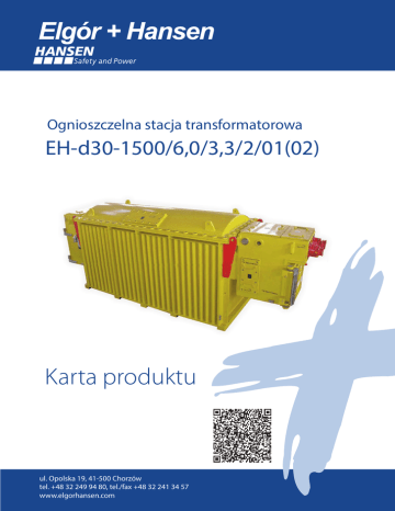 Ognioszczelna stacja transformatorowa EH-d30-1500/6,0/3,3/2/01(02) Karta produktu ul. Opolska 19, 41-500 Chorzów tel. +48 32 249 94 80, tel./fax +48 32 241 34 57 www.elgorhansen.com CECHY CHARAKTERYSTYCZNE Stacja transformatorowa typu EH-d30-1500/6,0/3,3/2/01 (EH-d30-1500/6,0/3,3/2/02) jest elektrycznym urządzeniem zasilającym w wykonaniu przeciwwybuchowym i zgodnie z polskimi przepisami wykonawczymi Prawa Geologicznego i Górniczego może być instalowana w podziemnych wyrobiskach górniczych kopalń niemetanowych i metanowych ze stopniem zagrożenia metanowego „a”, „b”, „c” oraz w wyrobiskach klasy „A” i „B” zagrożenia wybuchem pyłu węglowego. Konstrukcja opracowana została zgodnie z wymaganiami dyrektywy 94/9/WE (ATEX). Certyfikat zgodności predestynuje stosowanie stacji w pomieszczeniach z atmosferą wybuchową grupy I kategorii M2. Zastosowane zabezpieczenia elektroenergetyczne oraz przyjęty system sterowania i współpracy z blokadami technologicznymi z wykorzystaniem obwodów iskrobezpiecznych, pozwalają na bezpieczną współpracę z urządzeniami zasilającymi maszyny górnicze. Stacja transformatorowa przystosowana jest do podłączenia układu transmisji danych umożliwiającego odczyt informacji technologicznych i ich przesył na powierzchnię kopalni (np. do dyspozytora). Układ transmisji danych umożliwia między innymi przesył informacji na temat wartości prądów i napięć odpływów oraz informacji o stanach zakłóceniowych. Ognioszczelna stacja transformatorowa wyposażona jest także w wewnętrzny układ transmisji danych, za pomocą którego informacje o aktualnym stanie pracy podzespołów stacji transformatorowej, są przesyłane magistralą cyfrową oraz wizualizowane na jego wyświetlaczu. Na wyświetlaczu można obserwować parametry pracy stacji transformatorowej, stan zabezpieczeń i przekaźników oraz wartości mierzonych wielkości elektrycznych. BUDOWA Stacja transformatorowa składa się z trzech segmentów budowy ognioszczelnej: • górnego napięcia z trzema przedziałami ognioszczelnymi, wyposażonymi w odłącznik izolacyjny; zabezpieczenie nadmiarowoprądowe oraz łącznik załączający transformator główny i przyłączowy • transformatora, w której umieszczono transformator suchy, • dolnego napięcia, z dwoma przedziałami ognioszczelnymi wyposażonymi w uziemnik szybki, obwody kontroli i sterowania, zabezpieczenia upływowe oraz nadmiarowo-prądowe oraz przyłączowe. Komory są bezpośrednio ze sobą połączone przy pomocy ognioszczelnych złączy kołnierzowych, a ich współpraca zapewnia prawidłowe działanie w układzie stacji transformatorowej. Budowa segmentowa stacji z podziałem na komory i przedziały ognioszczelne połączone z sobą zapewnia: • separację ogólnokopalnianej sieci rozdzielczej z instalacjami oddziałowymi, • zasilanie odbiorników w kopalnianych instalacjach oddziałowych, • ochronę od skutków zwarć i przeciążeń po stronie górnego i dolnego napięcia, • ochronę od skutków pracy przy obniżonym stanie izolacji po stronie dolnego napięcia. Stacja transformatorowa może być instalowana w pomieszczeniach przewietrzanych prądem powietrza odprowadzanego do szybu wydechowego lub w pomieszczeniach z wentylacją odrębną. Stacja jest przystosowana do transportu kołowego (po szynach) lub z wykorzystaniem kolejki podwieszanej. Do podwieszania na kolejce służą uchwyty transportowe stacji wyróżnione kolorem czerwonym oraz specjalne strzemiona, które nie są standardowym wyposażeniem stacji. OPIS DZIAŁANIA Stacja transformatorowa wyposażona jest w dwa odpływy po stronie DN, które zapewniają zasilanie odbiorników napięciem 3300V. Każdy z odpływów wyposażony jest w zabezpieczenie nadmiarowoprądowe, chroniące od skutków zwarcia, przeciążenia i asymetrii obciążeń. Ochrona od skutków pracy przy obniżonej i/lub uszkodzonej izolacji zasilanej instalacji realizowana jest przez zastosowanie zabezpieczenia upływowo - blokującego i centralnego. Łącznik po stronie GN, na który działają wszystkie zabezpieczenia stacji, załącza transformator główny. Odłącznik izolacyjny po stronie GN pozwala na uzyskanie widocznej bezpiecznej przerwy izolacyjnej. W takim położeniu odłącznika, dzięki zastosowaniu blokady, istnieje możliwość otwarcia przedziałów aparaturowych w stanie beznapięciowym. www.elgorhansen.com Ognioszczelna stacja transformatorowa EH-d30-1500/6,0/3,3/2/01(02) DANE TECHNICZNE Moc znamionowa 1500kVA Napięcie znamionowe pierwotne 6000V Napięcie znamionowe wtórne 3300V Zakres regulacji przekładni (w stanie beznapięciowym) ± 5% Prąd znamionowy pierwotny 144,3A Prąd znamionowy wtórny 262,4A Grupa połączeń Dyn5 (Yyn0) Napięcie zwarcia 4,5% Straty biegu jałowego 3200W Straty obciążeniowe 8200W Częstotliwość znamionowa 50 Hz Chłodzenie AN Zwarciowa zdolność łączenia (6kV) 10kA, cosφ=0,2 Klasa izolacji transformatora H Maksymalna temperatura otoczenia + 40° C Ilość odpływów 2 Prąd ciągły pojedynczego odpływu ≤ 315A Masa bez zestawu kołowego 7900kg Masa z zestawem kołowym 8400kg Prześwit zestawu kołowego 130 mm F24.2 - przekaźnik ziemnozwarciowy Q21 - uziemnik szybki ZK21 - przekaźnik separująco kontrolny F24.1c - centralne zabezpieczenie upływowe F24.1b - zabezpieczenie upływowe blokujące F23.1, F23.2 - przekaźnik nadmiarowoprądowy -------- Q21 V lub ZK21 F24.2 ZK21 F24.1b F24.1c Q11 - odłącznik izolacyjny F12 - wkładka bezpiecznikowa T12 - transformator potrzeb własnych K11 - łącznik strony F11 - wtórny przekaźnik nadmiarowoprądowy T - transformator suchy Q11 -odłącznik izolacyjny F12 - wkładka bezpiecznikowa T12 - transformator potrzeb własnych K11 - łącznik strony DN F11 - wtórny przekaźnik nadmiarowoprądowy T - transformator suchy F24.2 - przekaźnik ziemnozwarciowy Q21 - uziemnik szybki ZK21 - przekaźnik separująco kontrolny F24.1c - centralne zabezpieczenie up