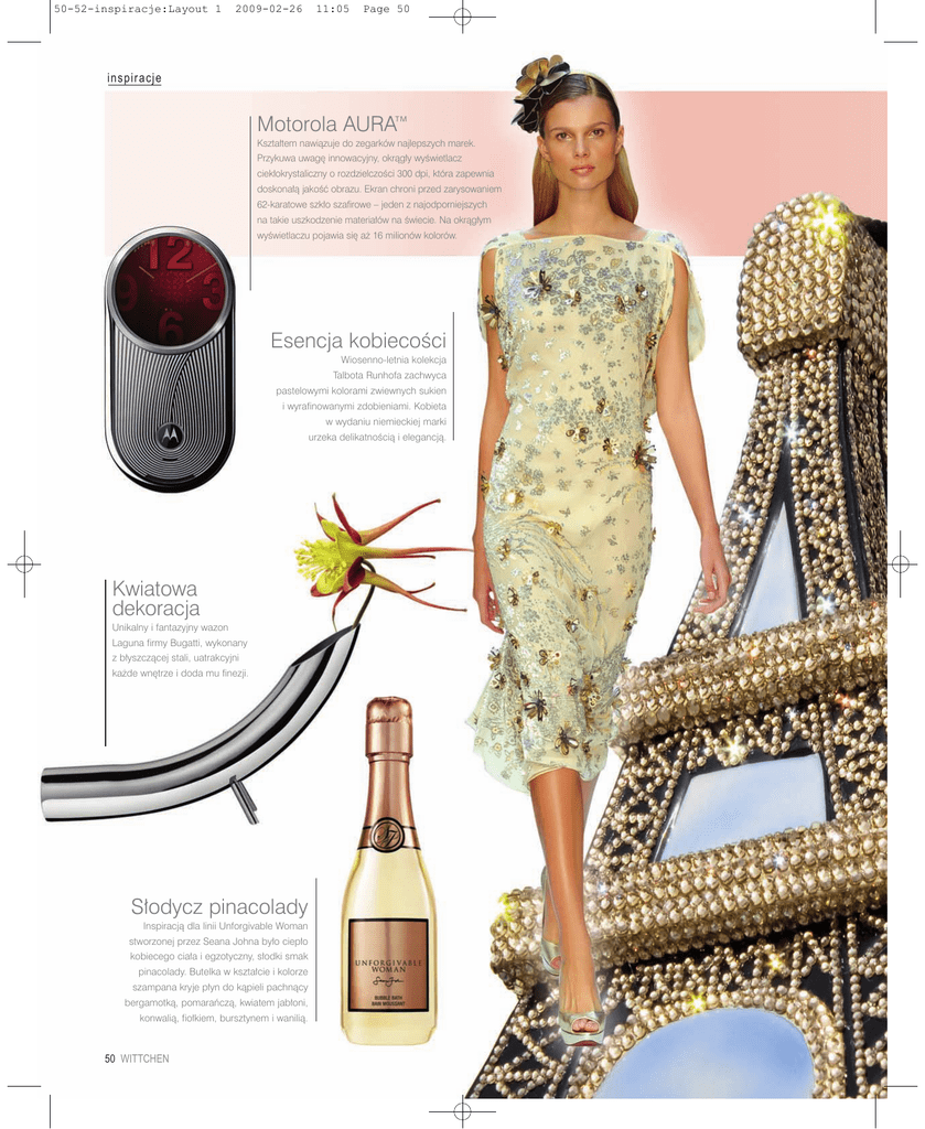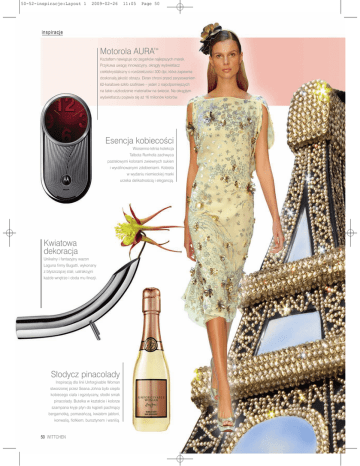 50-52-inspiracje:Layout 1 2009-02-26 11:05 Page 50 inspiracje Motorola AURA™ Kształtem nawiązuje do zegarków najlepszych marek. Przykuwa uwagę innowacyjny, okrągły wyświetlacz ciekłokrystaliczny o rozdzielczości 300 dpi, która zapewnia doskonałą jakość obrazu. Ekran chroni przed zarysowaniem 62-karatowe szkło szafirowe – jeden z najodporniejszych na takie uszkodzenie materiałów na świecie. Na okrągłym wyświetlaczu pojawia się aż 16 milionów kolorów. Esencja kobiecości Wiosenno-letnia kolekcja Talbota Runhofa zachwyca pastelowymi kolorami zwiewnych sukien i wyrafinowanymi zdobieniami. Kobieta w wydaniu niemieckiej marki urzeka delikatnością i elegancją. Kwiatowa dekoracja Unikalny i fantazyjny wazon Laguna firmy Bugatti, wykonany z błyszczącej stali, uatrakcyjni każde wnętrze i doda mu finezji. Słodycz pinacolady Inspiracją dla linii Unforgivable Woman stworzonej przez Seana Johna było ciepło kobiecego ciała i egzotyczny, słodki smak pinacolady. Butelka w kształcie i kolorze szampana kryje płyn do kąpieli pachnący bergamotką, pomarańczą, kwiatem jabłoni, konwalią, fiołkiem, bursztynem i wanilią. 50 WITTCHEN 50-52-inspiracje:Layout 1 2009-02-20 17:11 Page 51 Pamięć absolutna MP3 bez słuchawek Nowy odtwarzacz MP3 CREATIVE ZEN STONE PLUS ma wbudowany głośnik, dzięki czemu Przenośna pamięć USB uwalnia nas od słuchawek. Ponadto jest zamknięta w gustownym wyposażony w radio FM, dyktafon, zegar/stoper. naszyjniku zdobionym Zmieści się w nim do tysiąca utworów. Wyróżnia kryształem Swarovskiego się zaokrąglonym i wyprofilowanym kształtem to doskonały prezent nie naturalnie pasującym do dłoni. tylko dla miłośniczek informatyki. Wieża Eiffla pod ręką Projektantka Timmy Woods stworzyła torebki dla bohaterek kinowej wersji „Seksu w wielkim mieście”. Furorę zrobiła m.in. ta w kształcie wieży Eiffla dla Carrie Bradshaw. Dr Irena Eris INCENTIVE Napinający krem przeciwzmarszczkowy Wykonana z lekkiego na dzień SPF 20 idealnie nadaje się do drewna i zawieszona codziennej pielęgnacji każdego rodzaju na jedwabnym pasku skóry dojrzałej, stanowi doskonałą bazę torebka była zapinana na złoty zatrzask, wyłożona podszewką i wyposażona pod makijaż. Wyraźnie spłyca i zmniejsza zmarszczki, rewelacyjnie odżywia i nawilża skórę. w wewnętrzną kieszeń na telefon. Filmową wersję pokryto dodatkowo kryształami Swarovskiego. Nie tylko dla małych dam Kolekcja porcelanowych lalek domu mody Lanvin inspirowana jest klasycznymi projektami francuskiej marki. Filigranowe figurki ozdobią każde pomieszczenie. Ocean Lounge To najnowszy zapach Escady z limitowanej edycji Fashion Fragrance. Doskonale oddaje nastrój błogich, letnich chwil. Łączy dominujące nuty owocowe z delikatnymi akcentami kwiatowymi, tworząc świeży, nowoczesny zapach przywodzący na myśl letnią atmosferę. WITTCHEN 51 50-52-inspiracje:Layout 1 2009-02-20 17:12 Page 52 inspiracje Czas dla sztuki Szwedzki urok Wśród bogatej oferty zegarków marki Stonowana nonszalancja to Hublot te z limitowanej serii Art główna cecha stylu marki Collection mogą z powodzeniem J. Lindeberg. Nowoczesny design uchodzić za małe dzieła sztuki. i wysoka jakość sprawiają, że Tarcze ozdobiono złoconymi, ręcznie projekty szybko znajdują wiernych rzeźbionymi wizerunkami zwierząt. klientów wśród mężczyzn ceniących sportową elegancję. Strictly Private Ekstrawagancki nowy zapach BALDESSARINI – do jego powstania zainspirował ekskluzywny świat konesera oraz niezaspokojona żądza otaczania się wyrafinowanym luksusem. Zachwyca w nim połączenie aromatycznej bazylii, orzeźwiającej bergamotki, róży i słodyczy crème brûlée. Styl i elegancja The Beat to nowy, świeży, drzewny zapach Burberry. Łączy on subtelną elegancję z niewątpliwym stylem. Zwraca uwagę ostry aromat czarnego pieprzu i pobudzająca woń liści fiołka. Metal i drewno Duch i siła 52 WITTCHEN Nowa kolumna podłogowa Thiela ma ponad 120 cm wysokości. W jej Nowy kosmetyk DKNYMEN kojarzy się konstrukcji obok pięknych, drewnianych z siłą i duchem mężczyzny i jego miasta. paneli bocznych wyróżniają się także Odświeżający żel po goleniu doskonale elementy metalowe. Z aluminium nawilża skórę – idealnie sprawdza się wykonano bowiem cały front oraz w podróży i po codziennym treningu. półokrągłą górną ściankę.
