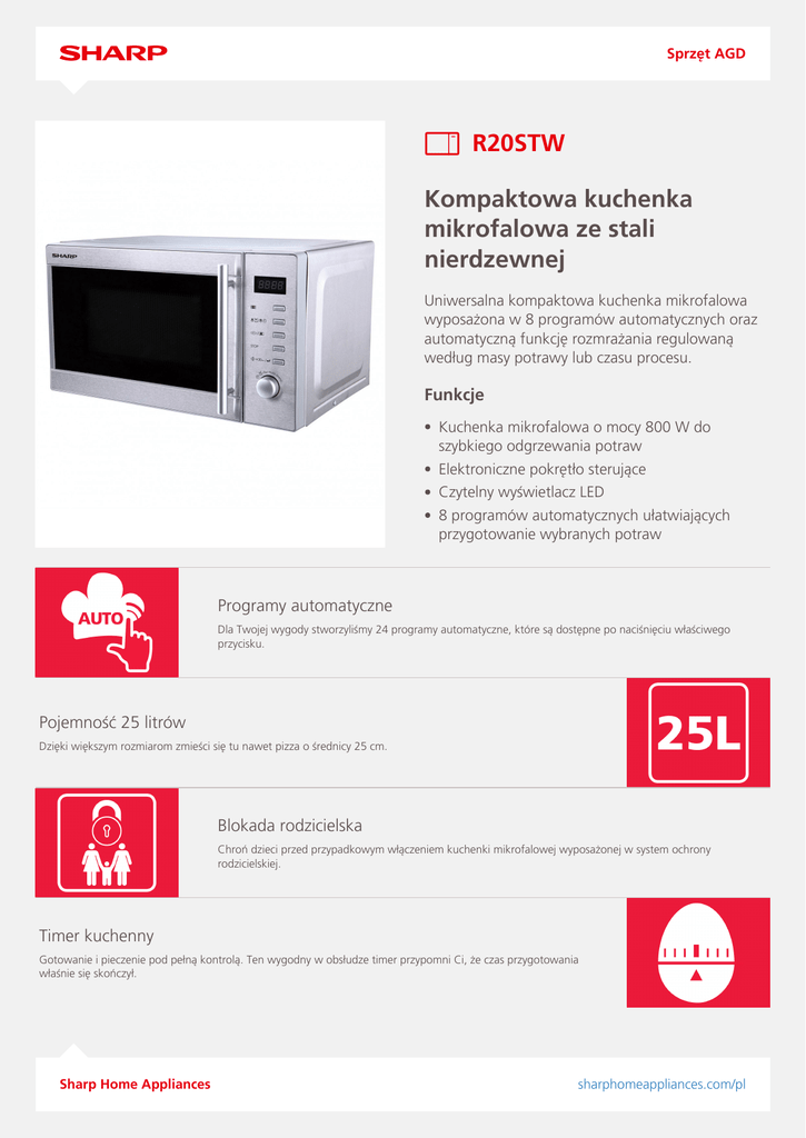 Sprzęt AGD R20STW Kompaktowa kuchenka mikrofalowa ze stali nierdzewnej Uniwersalna kompaktowa kuchenka mikrofalowa wyposażona w 8 programów automatycznych oraz automatyczną funkcję rozmrażania regulowaną według masy potrawy lub czasu procesu. Funkcje Kuchenka mikrofalowa o mocy 800 W do szybkiego odgrzewania potraw Elektroniczne pokrętło sterujące Czytelny wyświetlacz LED 8 programów automatycznych ułatwiających przygotowanie wybranych potraw Programy automatyczne Dla Twojej wygody stworzyliśmy 24 programy automatyczne, które są dostępne po naciśnięciu właściwego przycisku. Pojemność 25 litrów Dzięki większym rozmiarom zmieści się tu nawet pizza o średnicy 25 cm. Blokada rodzicielska Chroń dzieci przed przypadkowym włączeniem kuchenki mikrofalowej wyposażonej w system ochrony rodzicielskiej. Timer kuchenny Gotowanie i pieczenie pod pełną kontrolą. Ten wygodny w obsłudze timer przypomni Ci, że czas przygotowania właśnie się skończył. Sharp Home Appliances sharphomeappliances.com/pl Sprzęt AGD Kluczowe cechy Automatyczne programy pieczenia ciasta Nie Zegar Tak Przycisk "Info" Nie Przycisk "Język" Nie Funkcja plus 1 minuta / +30s No / Yes Kolor kuchenki Stainless steel Automatyczne programy gotowania i rozmrażania 8 Korekcja ustawień (WIĘCEJ/MNIEJ) Nie Materiał, z którego wykonane jest wnętrze kuchenki Grey paint Tryb pracy połączonej: grill (kwarcowy i w podczerwieni) Nie Automatyczne programy przygotowania pizzy Nie Tryb pracy połączonej: termoobieg + mikrofale No Funkcja podgrzewania Nie Timer (maks. podawanie minut i sekund) 95/00 Średnica talerza obrotowego w cm / materiał 25.5 / Glass Pojemność komory (w litrach) 20 Zakres regulacji temperatury termoobiegu (°C) – Tryb pracy połączonej: grill (kwarcowy lub w podczerwieni) + mikrofale Nie Tryb oszczędzania energii Tak Menu FUN lub automatyczne programy do zakąsek – Sharp Home Appliances sharphomeappliances.com/pl Sprzęt AGD Moc wyjściowa Moc wyjściowa (W) 800 Poziomy mocy mikrofal 5 Termoobieg (W) – Grill kwarcowy (W) – Grill w podczerwieni (W) – Waga (kg) 10.5 kg Mocy, zużycia i napięcia Bezpiecznik źródła zasilania/wyłącznik obwodu (A) 10 Wymiary i waga Wymiary wewnętrzne (szer.) x (wys.) x (gł.) mm 306 x 208.2 x 306.6 Wymiary zewnętrzne (szer.) x (wys.) x (gł.) mm 439.5 x 258 x 355 Wyposażenie Wysoki ruszt Nie Kwadratowa półka Nie Niski ruszt Nie Kwadratowy pojemnik Nie European article number Kod EAN Sharp Home Appliances Powered by TCPDF (www.tcpdf.org) 4974019768694 sharphomeappliances.com/pl