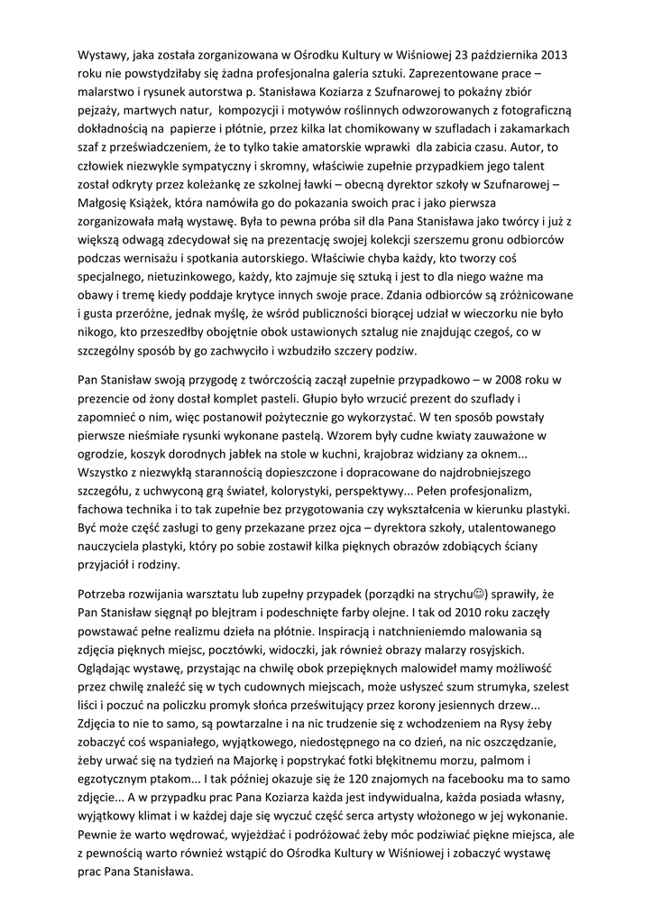 Wystawy, jaka została zorganizowana w Ośrodku Kultury w Wiśniowej 23 października 2013 roku nie powstydziłaby się żadna profesjonalna galeria sztuki. Zaprezentowane prace – malarstwo i rysunek autorstwa p. Stanisława Koziarza z Szufnarowej to pokaźny zbiór pejzaży, martwych natur, kompozycji i motywów roślinnych odwzorowanych z fotograficzną dokładnością na papierze i płótnie, przez kilka lat chomikowany w szufladach i zakamarkach szaf z przeświadczeniem, że to tylko takie amatorskie wprawki dla zabicia czasu. Autor, to człowiek niezwykle sympatyczny i skromny, właściwie zupełnie przypadkiem jego talent został odkryty przez koleżankę ze szkolnej ławki – obecną dyrektor szkoły w Szufnarowej – Małgosię Książek, która namówiła go do pokazania swoich prac i jako pierwsza zorganizowała małą wystawę. Była to pewna próba sił dla Pana Stanisława jako twórcy i już z większą odwagą zdecydował się na prezentację swojej kolekcji szerszemu gronu odbiorców podczas wernisażu i spotkania autorskiego. Właściwie chyba każdy, kto tworzy coś specjalnego, nietuzinkowego, każdy, kto zajmuje się sztuką i jest to dla niego ważne ma obawy i tremę kiedy poddaje krytyce innych swoje prace. Zdania odbiorców są zróżnicowane i gusta przeróżne, jednak myślę, że wśród publiczności biorącej udział w wieczorku nie było nikogo, kto przeszedłby obojętnie obok ustawionych sztalug nie znajdując czegoś, co w szczególny sposób by go zachwyciło i wzbudziło szczery podziw. Pan Stanisław swoją przygodę z twórczością zaczął zupełnie przypadkowo – w 2008 roku w prezencie od żony dostał komplet pasteli. Głupio było wrzucić prezent do szuflady i zapomnieć o nim, więc postanowił pożytecznie go wykorzystać. W ten sposób powstały pierwsze nieśmiałe rysunki wykonane pastelą. Wzorem były cudne kwiaty zauważone w ogrodzie, koszyk dorodnych jabłek na stole w kuchni, krajobraz widziany za oknem... Wszystko z niezwykłą starannością dopieszczone i dopracowane do najdrobniejszego szczegółu, z uchwyconą grą świateł, kolorystyki, perspektywy... Pełen profesjonalizm, fachowa technika i to tak zupełnie bez przygotowania czy wykształcenia w kierunku plastyki. Być może część zasługi to geny przekazane przez ojca – dyrektora szkoły, utalentowanego nauczyciela plastyki, który po sobie zostawił kilka pięknych obrazów zdobiących ściany przyjaciół i rodziny. Potrzeba rozwijania warsztatu lub zupełny przypadek (porządki na strychu☺) sprawiły, że Pan Stanisław sięgnął po blejtram i podeschnięte farby olejne. I tak od 2010 roku zaczęły powstawać pełne realizmu dzieła na płótnie. Inspiracją i natchnieniemdo malowania są zdjęcia pięknych miejsc, pocztówki, widoczki, jak również obrazy malarzy rosyjskich. Oglądając wystawę, przystając na chwilę obok przepięknych malowideł mamy możliwość przez chwilę znaleźć się w tych cudownych miejscach, może usłyszeć szum strumyka, szelest liści i poczuć na policzku promyk słońca prześwitujący przez korony jesiennych drzew... Zdjęcia to nie to samo, są powtarzalne i na nic trudzenie się z wchodzeniem na Rysy żeby zobaczyć coś wspaniałego, wyjątkowego, niedostępnego na co dzień, na nic oszczędzanie, żeby urwać się na tydzień na Majorkę i popstrykać fotki błękitnemu morzu, palmom i egzotycznym ptakom... I tak później okazuje się że 120 znajomych na facebooku ma to samo zdjęcie... A w przypadku prac Pana Koziarza każda jest indywidualna, każda posiada własny, wyjątkowy klimat i w każdej daje się wyczuć część serca artysty włożonego w jej wykonanie. Pewnie że warto wędrować, wyjeżdżać i podróżować żeby móc podziwiać piękne miejsca, ale z pewnością warto również wstąpić do Ośrodka Kultury w Wiśniowej i zobaczyć wystawę prac Pana Stanisława.