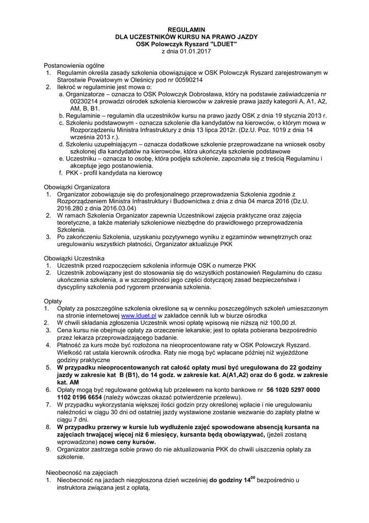 REGULAMIN DLA UCZESTNIKÓW KURSU NA PRAWO JAZDY OSK Polowczyk Ryszard "LDUET" z dnia 01.01.2017 Postanowienia ogólne 1. Regulamin określa zasady szkolenia obowiązujące w OSK Polowczyk Ryszard zarejestrowanym w Starostwie Powiatowym w Oleśnicy pod nr 00590214 2. Ilekroć w regulaminie jest mowa o: a. Organizatorze – oznacza to OSK Polowczyk Dobrosława, który na podstawie zaświadczenia nr 00230214 prowadzi ośrodek szkolenia kierowców w zakresie prawa jazdy kategorii A, A1, A2, AM, B, B1. b. Regulaminie – regulamin dla uczestników kursu na prawo jazdy OSK z dnia 19 stycznia 2013 r. c. Szkoleniu podstawowym - oznacza szkolenie dla kandydatów na kierowców, o którym mowa w Rozporządzeniu Ministra Infrastruktury z dnia 13 lipca 2012r. (Dz.U. Poz. 1019 z dnia 14 września 2013 r.). d. Szkoleniu uzupełniającym – oznacza dodatkowe szkolenie przeprowadzane na wniosek osoby szkolonej dla kandydatów na kierowców, która ukończyła szkolenie podstawowe e. Uczestniku – oznacza to osobę, która podjęła szkolenie, zapoznała się z treścią Regulaminu i akceptuje jego postanowienia. f. PKK - profil kandydata na kierowcę Obowiązki Organizatora 1. Organizator zobowiązuje się do profesjonalnego przeprowadzenia Szkolenia zgodnie z Rozporządzeniem Ministra Infrastruktury i Budownictwa z dnia z dnia 04 marca 2016 (Dz.U. 2016.280 z dnia 2016.03.04) 2. W ramach Szkolenia Organizator zapewnia Uczestnikowi zajęcia praktyczne oraz zajęcia teoretyczne, a także materiały szkoleniowe niezbędne do prawidłowego przeprowadzenia Szkolenia. 3. Po zakończeniu Szkolenia, uzyskaniu pozytywnego wyniku z egzaminów wewnętrznych oraz uregulowaniu wszystkich płatności, Organizator aktualizuje PKK Obowiązki Uczestnika 1. Uczestnik przed rozpoczęciem szkolenia informuje OSK o numerze PKK 2. Uczestnik zobowiązany jest do stosowania się do wszystkich postanowień Regulaminu do czasu ukończenia szkolenia, a w szczególności jego części dotyczącej zasad bezpieczeństwa i dyscypliny szkolenia pod rygorem przerwania szkolenia. Opłaty 1. Opłaty za poszczególne szkolenia określone są w cenniku poszczególnych szkoleń umieszczonym na stronie internetowej www.lduet.pl w zakładce cennik lub w biurze ośrodka 2. W chwili składania zgłoszenia Uczestnik wnosi opłatę wpisową nie niższą niż 100,00 zł. 3. Cena kursu nie obejmuje opłaty za orzeczenie lekarskie; jest to opłata pobierana bezpośrednio przez lekarza przeprowadzającego badanie. 4. Płatność za kurs może być rozłożona na nieoprocentowane raty w OSK Polowczyk Ryszard. Wielkość rat ustala kierownik ośrodka. Raty nie mogą być wpłacane później niż wyjeżdżone godziny praktyczne 5. W przypadku nieoprocentowanych rat całość opłaty musi być uregulowana do 22 godziny jazdy w zakresie kat B (B1), do 14 godz. w zakresie kat. A(A1,A2) oraz do 6 godz. w zakresie kat. AM 6. Opłaty mogą być regulowane gotówką lub przelewem na konto bankowe nr 56 1020 5297 0000 1102 0196 6654 (należy wówczas okazać potwierdzenie przelewu). 7. W przypadku wykorzystania większej ilości godzin przy określonej wpłacie i nie uregulowaniu należności w ciągu 30 dni od ostatniej jazdy wystawione zostanie wezwanie do zapłaty płatne w ciągu 7 dni. 8. W przypadku przerwy w kursie lub wydłużenie zajęć spowodowane absencją kursanta na zajęciach trwającej więcej niż 6 miesięcy, kursanta będą obowiązywać, (jeżeli zostaną wprowadzone) nowe ceny kursów. 9. Organizator zastrzega sobie prawo do nie aktualizowania PKK do chwili uiszczenia opłaty za szkolenie. Nieobecność na zajęciach 00 1. Nieobecność na jazdach niezgłoszona dzień wcześniej do godziny 14 bezpośrednio u instruktora związana jest z opłatą, 2. Opłata za 1 godzinę nieobecności wynosi 50% ceny za godzinę praktyczną obowiązującą w danym czasie; 3. Opłata ta nie dotyczy uzasadnionych nieobecności. Dyscyplina Szkolenia 1. O dopuszczeniu Uczestnika do części praktycznej decyduje zakończenie wszystkich zajęć teoretycznych zakończonych pozytywnym wynikiem egzaminu wewnętrznego. 2. Kurs kończy się egzaminem praktycznym zgodnie z Rozporządzeniem Ministra Infrastruktury z dnia 13 lipca 2012r. (Dz.U. Poz. 1019 z dnia 14 września 2013 r.). 3. O dopuszczeniu Uczestnika do Wewnętrznego Egzaminu Praktycznego decyduje instruktor prowadzący 4. Wewnętrzny Egzamin Praktyczny przeprowadza instruktor prowadzący lub instruktor wyznaczony przez kierownika Ośrodka. 5. Po pozytywnym zaliczeniu Wewnętrznego Egzaminu Praktycznego Uczestnik uznany jest za osobę przygotowaną do podejścia do Egzaminu Państwowego. 6. Po zakończeniu z wynikiem pozytywnym części egzaminu praktycznego kierownik kursu aktualizuje PKK 7. Każda godzina odbytych zajęć teoretycznych i praktycznych zostaje wpisana do karty przeprowadzonych zajęć i potwierdzona podpisem instruktora i Uczestnika. 8. W przypadku zakończenia egzaminu wewnętrznego z wynikiem negatywnym instruktor prowadzący ustala wraz z osobą szkoloną, na podstawie wypełnionego arkusza przebiegu części praktycznej egzaminu wewnętrznego, dalszy zakres szkolenia niezbędny do uzyskania wszystkich umiejętności. 9. Uczestnik szkolenia ma prawo w każdej chwili zmienić instruktora. Przerwanie Szkolenia 1. Uczestnik może przerwać Szkolenie w dowolnym momencie. 2. Zwrot wniesionej opłaty może być dokonany wyłącznie po okazaniu oryginału dowodu wpłaty. 3. W przypadku rezygnacji z kursu OSK Polowczyk Dobrosława zwraca tylko niewykorzystaną część wpłaconej kwoty za kurs. KWOTA = wpłata - 300 zł(szkolenie teoretyczne) – (cena kursu * ilość wyjeżdżonych godzin/30 (kat.B-30, kat A-20,kat.AM-10) Przepisy porządkowe 1. Korzystanie z pomocy naukowych Organizatora takich jak: stanowiska komputerowe, sala wykładowa i pojazdy nauki jazdy dozwolone jest wyłącznie pod nadzorem pracowników Organizatora, wykładowcy lub instruktora. 2. Palenie tytoniu na sali wykładowej l