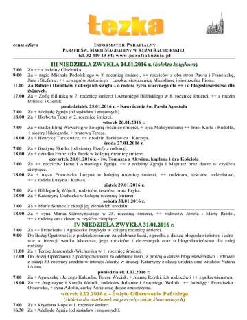 cena: ofiara 7.00 9.00 11.00 17.00 7.00 18.00 7.00 18.00 7.00 18.00 7.00 18.00 7.00 18.00 7.00 I NFORMATOR PARAFIALNY PARAFII ŚW. MARII MAGDALENY W KUŹNI RACIBORSKIEJ tel. 32 419 13 54; www.parafiakuźnia.pl III NIEDZIELA ZWYKŁA 24.01.2016 r. (kolekta kolędowa) Za ++ z rodziny Olschinka. Za + męża Michała Podolskiego w 8. rocznicę śmierci, ++ rodziców z obu stron Pawła i Franciszkę, Jana i Stefanię, ++ szwagrów Antoniego i Leszka, siostrzenicę Mirosławę i siostrzeńca Piotra. Za Babcie i Dziadków z okazji ich święta – o radość życia wiecznego dla ++ i o błogosławieństwo dla żyjących. Za + Zofię Bilińską w 7. rocznicę śmierci i Antoniego Bilińskiego w 8. rocznicę śmierci, ++ z rodzin Biliński i Cieślik. poniedziałek 25.01.2016 r. - Nawrócenie św. Pawła Apostoła Za + Adelajdę Zgraja (od sąsiadów i znajomych). Za + Herberta Tatuś w 2. rocznicę śmierci. wtorek 26.01.2016 r. Za + matkę Elmę Wawersig w kolejną rocznicę śmierci, + ojca Maksymiliana ++ braci Kurta i Rudolfa, + siostrę Hildegardę, + bratową Teresę. Za + Henrykę Turkiewicz, ++ z rodzin Turkiewicz i Kurzeja. środa 27.01.2016 r. Za + Grażynę Skórka (od siostry Józefy z rodziną). Za + dziadka Franciszka Jacek w kolejną rocznicę śmierci. czwartek 28.01.2016 r. - św. Tomasza z Akwinu, kapłana i dra Kościoła Za ++ rodziców Irenę i Antoniego Zgraja, ++ z rodziny Zgraja i Majnusz oraz dusze w czyśćcu cierpiące. Za + męża Franciszka Luzyna w kolejną rocznicę śmierci, ++ rodziców, teściów, rodzeństwo, ++ z rodzin Luzyna i Kubica. piątek 29.01.2016 r. Za + Hildegardę Wójcik, rodziców, teściów, brata Eryka. Za + Katarzynę Cichocką w kolejną rocznicę śmierci. sobota 30.01.2016 r. Za + Marię Sonnek z okazji jej ziemskich urodzin. --------------------------------------------------------------------------------------------------------------------------------------------------------------------------------------------------------------------------------------------------------------------------------------------------------------------------------- 18.00 Za + syna Marka Górczyńskiego w 25. rocznicę śmierci, ++ rodziców Józefa i Martę Riedel, ++ z rodziny oraz dusze w czyśćcu cierpiące. 7.00 9.00 IV NIEDZIELA ZWYKŁA 31.01.2016 r. Za ++ Franciszka i Agnieszkę Przybyła w kolejną rocznicę śmierci. Do Bożej Opatrzności z podziękowaniem za odebrane łaski, z prośbą o dalsze błogosławieństwo i zdrowie w intencji wnuka Mateusza, jego rodziców i chrzestnych oraz o błogosławieństwo dla całej rodziny. 11.00 Za + Teresę Jarzombek-Wichurską w 1. rocznicę śmierci. 17.00 Do Bożej Opatrzności z podziękowaniem za odebrane łaski, z prośbą o dalsze błogosławieństwo i zdrowie z okazji 50. rocznicy urodzin w intencji Jolanty, w intencji Katarzyny z okazji urodzin oraz wnuków Natana i Alana. poniedziałek 1.02.2016 r. 7.00 Za + Agnieszkę i Jerzego Kalemba, Teresę Wycisk, + Joannę Rzytki, ich rodziców i ++ z pokrewieństwa. 18.00 Za ++ Augustynę i Karola Wolnik, rodziców Juliannę i Antoniego Wolnik, ++ Jadwigę i Franciszka Olszówka, + syna Adolfa, córkę Annę oraz dusze opuszczone. wtorek 2.02.2016 r. - Święto Ofiarowania Pańskiego (zbiórka do skarbonek na potrzeby sióstr klauzurowych) 7.00 Za + Krystiana Stopa w 1. rocznicę śmierci. 16.30 Za + Adelajdę Zgraja (od sąsiadów i znajomych). 18.00 Za + matkę Teresę Szczepaniak w rocznicę ziemskich urodzin, + ojca Antoniego w kolejną rocznicę śmierci oraz dusze w czyśćcu cierpiące. środa 3.02.2016 r. - św. Błażeja 7.00 Za ++ Martę i Pawła Dyrbuś, ++ siostry Gertrudę i Marię, + szwagra Pawła i + teścia. 18.00 Do Bożej Opatrzności z podziękowaniem za odebrane łaski, z prośbą o dalsze błogosławieństwo i zdrowie z okazji 90. rocznicy urodzin w intencji Jadwigi Ochmanek oraz o błogosławieństwo dla całej rodziny. czwartek 4.02.2016 r. (pierwszy czwartek miesiąca) 7.00 Za + Stefanię Ropiak w 1. rocznicę śmierci, + ojca Mieczysława Ropiak, ++ z pokrewieństwa. 17.15 Nabożeństwo ku czci św. Jana Pawła II. 18.00 1) W intencji próśb i podziękowań za wstawiennictwem św. Jana Pawła II. Za rodziny naszej Parafii, za dzieci i młodzież, za żyjących i ++ kapłanów i siostry zakonne oraz o nowe powołania do służby w Kościele. 2) Za + Weronikę Ernst w kolejną rocznicę ziemskich urodzin, za ++ jej rodziców i teściów. piątek 5.02.2016 r. - św. Agaty, dziewicy i męczennicy (pierwszy piątek miesiąca) 7.00 1) Za żyjących i ++ czcicieli Najświętszego Serca Pana Jezusa. 2) Za ++ Jana i Anastazję Mitrenga, synów Izydora i Bernarda, + Martę Mrozek. 18.00 Za + Łucję Jacek, + Emanuela Zgraja, ++ z pokrewieństwa i dusze w czyśćcu cierpiące. sobota 6.02.2016 r. - św. Męczenników Japońskich Pawła Miki i Towarzyszy (pierwsza sobota miesiąca) 7.00 1) Msza Św. z Godzinkami (wymiana tajemnic różańcowych). W intencji żyjących i ++ czcicieli NMP. 2) Za + ojca Pawła Kosteczko w kolejną rocznicę śmierci oraz + matkę Hildegardę. 18.00 Za + mamę Kunegundę Zawada w kolejną rocznicę śmierci, + ojca Aleksandra, ++ bratanków Adasia i Karolinę, dziadków z obu stron, ++ rodzin Zawada, Smoleń, Gąsior, Rapacz i dusze w czyśćcu cierpiące. V NIEDZIELA ZWYKŁA 7.02.2016 r. 7.00 (w j. niemieckim) Za + Magdalenę Kurzeja (od sąsiadów i znajomych). 9.00 Za + Teresę Lazar w 1. rocznicę śmierci oraz + Stanisława Lazar w 15. rocznicę śmierci. 11.00 Za ++ rodziców Danielę i Józefa Jędras, brata Józefa, teściów Cecylię i Władysława Pustelnik, ++ z pokrewieństwa. 15.30 Chrzty i Roczki: Paulina Aleksandra Janosz. 17.00 Za + Edytę Stanek w 30. dzień po śmierci. poniedziałek 8.02.2016 r. 7.00 Za ++ Stefanię i Michała Mleczko. 18.00 Za + Edwarda Marut w kolejną rocznicę śmierci oraz za ++ rodziców i dziadków. wtorek 9.02.2016 r. 7.00 Za + Zofię Janik w rocznicę śmierci i ziemskich urodzin