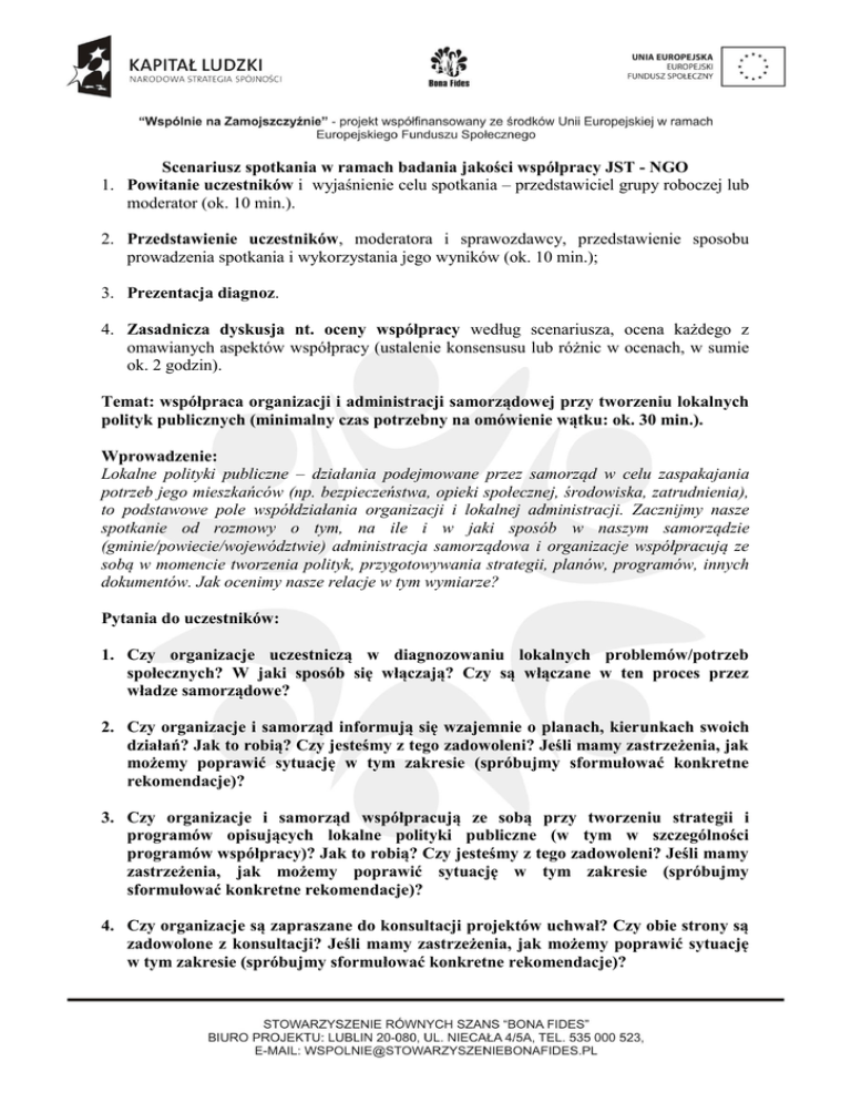 Scenariusz spotkania w ramach badania jakości współpracy JST - NGO 1. Powitanie uczestników i wyjaśnienie celu spotkania – przedstawiciel grupy roboczej lub moderator (ok. 10 min.). 2. Przedstawienie uczestników, moderatora i sprawozdawcy, przedstawienie sposobu prowadzenia spotkania i wykorzystania jego wyników (ok. 10 min.); 3. Prezentacja diagnoz. 4. Zasadnicza dyskusja nt. oceny współpracy według scenariusza, ocena każdego z omawianych aspektów współpracy (ustalenie konsensusu lub różnic w ocenach, w sumie ok. 2 godzin). Temat: współpraca organizacji i administracji samorządowej przy tworzeniu lokalnych polityk publicznych (minimalny czas potrzebny na omówienie wątku: ok. 30 min.). Wprowadzenie: Lokalne polityki publiczne – działania podejmowane przez samorząd w celu zaspakajania potrzeb jego mieszkańców (np. bezpieczeństwa, opieki społecznej, środowiska, zatrudnienia), to podstawowe pole współdziałania organizacji i lokalnej administracji. Zacznijmy nasze spotkanie od rozmowy o tym, na ile i w jaki sposób w naszym samorządzie (gminie/powiecie/województwie) administracja samorządowa i organizacje współpracują ze sobą w momencie tworzenia polityk, przygotowywania strategii, planów, programów, innych dokumentów. Jak ocenimy nasze relacje w tym wymiarze? Pytania do uczestników: 1. Czy organizacje uczestniczą w diagnozowaniu lokalnych problemów/potrzeb społecznych? W jaki sposób się włączają? Czy są włączane w ten proces przez władze samorządowe? 2. Czy organizacje i samorząd informują się wzajemnie o planach, kierunkach swoich działań? Jak to robią? Czy jesteśmy z tego zadowoleni? Jeśli mamy zastrzeżenia, jak możemy poprawić sytuację w tym zakresie (spróbujmy sformułować konkretne rekomendacje)? 3. Czy organizacje i samorząd współpracują ze sobą przy tworzeniu strategii i programów opisujących lokalne polityki publiczne (w tym w szczególności programów współpracy)? Jak to robią? Czy jesteśmy z tego zadowoleni? Jeśli mamy zastrzeżenia, jak możemy poprawić sytuację w tym zakresie (spróbujmy sformułować konkretne rekomendacje)? 4. Czy organizacje są zapraszane do konsultacji projektów uchwał? Czy obie strony są zadowolone z konsultacji? Jeśli mamy zastrzeżenia, jak możemy poprawić sytuację w tym zakresie (spróbujmy sformułować konkretne rekomendacje)? 5. Jak wygląda współpraca między samorządem a miejscowymi organizacjami pozarządowymi przy wdrażaniu polityk publicznych? Czy jesteśmy z tego zadowoleni? Jeśli mamy zastrzeżenia, jak możemy poprawić sytuację w tym zakresie (spróbujmy sformułować konkretne rekomendacje)? Temat: współpraca organizacji i administracji samorządowej przy realizacji lokalnych polityk publicznych (minimalny czas potrzebny na omówienie wątku: ok. 40 min). Wprowadzenie: Współpraca przy tworzeniu polityk publicznych powinna przekładać się na współpracę przy ich realizacji. Ta polega na wykonywaniu różnego rodzaju zadań publicznych w celu zaspokajania potrzeb i rozwiązywania lokalnych problemów lokalnych społeczności. Czy w naszym samorządzie organizacje biorą udział w wykonywaniu zadań publicznych? Czy samorząd zleca im wykonywanie takich zadań? Na ile współpraca przy wdrażaniu polityk publicznych wykracza poza finansowanie zadań? Jak ocenimy nasze relacje w tym wymiarze? Pytania do uczestników: 6. Czy samorząd zleca organizacjom realizację zadań publicznych? W jakich dziedzinach? Jak zlecanie wygląda w praktyce? Czy jesteśmy z tego zadowoleni? Jeśli mamy zastrzeżenia, jak możemy poprawić sytuację w tym zakresie (spróbujmy sformułować konkretne rekomendacje)? 7. Czy organizacje i samorząd współpracują ze sobą w inny sposób niż tylko na zasadzie zlecania zadań/udzielania wsparcia finansowego? W jaki sposób? Czy jesteśmy zadowoleni z tej współpracy? Jeśli mamy zastrzeżenia, jak możemy poprawić sytuację w tym zakresie (spróbujmy sformułować konkretne rekomendacje)? 8. Czy organizacje i administracja samorządowa zawierają trwalsze, stałe stosunki na okoliczność realizacji lokalnych polityk i zadań publicznych? Jaki ma to związek z inicjatywą lokalną? W jaki sposób? Czy jesteśmy zadowoleni z tej współpracy? Jeśli mamy zastrzeżenia, jak możemy poprawić sytuację w tym zakresie (spróbujmy sformułować konkretne rekomendacje)? 9. Czy realizacja lokalnych polityk publicznych jest wspólnie oceniana? Jeśli tak, to czy organizacje uczestniczą w tej ocenie? Czy jesteśmy z tego zadowoleni? Jeśli mamy zastrzeżenia, jak możemy poprawić sytuację w tym zakresie (spróbujmy sformułować konkretne rekomendacje)? Temat: Tworzenie warunków do współpracy i aktywności organizacji (minimalny czas potrzebny na omówienie wątku: ok. 20 min). Wprowadzenie: Po to, aby współpraca przy tworzeniu i wdrażaniu polityk publicznych była w ogóle możliwa, muszą istnieć ku temu warunki. Na tym polu odpowiedzialność spoczywa głównie na samorządzie, który powinien te warunki kreować, sprzyjając samoorganizacji obywateli, wspierając współdziałanie i integrację środowisk pozarządowych. Jak ocenimy współpracę między organizacjami a samorządem na tym polu? Pytania do uczestników: 10. Czy samorząd wspiera organizacje pozarządowe w systematyczny sposób – tworząc dla nich różnego rodzaju stałe, stabilne rozwiązania? Czy te rozwiązania rzeczywiście funkcjonują? Czy jesteśmy z nich zadowoleni? Jeśli mamy zastrzeżenia, jak możemy poprawić sytuację w tym zakresie (spróbujmy sformułować konkretne rekomendacje)? 11. Czy samorząd wspiera integrację środowisk pozarządowych na swoim terenie? Czy jesteśmy z nich zadowoleni? Jeśli mamy zastrzeżenia, jak możemy poprawić sytuację w tym zakresie (spróbujmy sformułować konkretne rekomendacje)? 12. Kończąc nasze spotkanie, spróbujmy odpowiedzieć sobie na jeszcze jedno pytanie: na ile w naszym sam