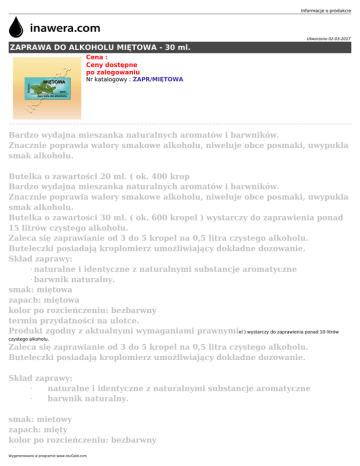 Informacje o produkcie Utworzono 02-03-2017 ZAPRAWA DO ALKOHOLU MIĘTOWA - 30 ml. Cena : Ceny dostępne po zalogowaniu Nr katalogowy : ZAPR/MIĘTOWA Bardzo wydajna mieszanka naturalnych aromatów i barwników. Znacznie poprawia walory smakowe alkoholu, niweluje obce posmaki, uwypukla smak alkoholu. Butelka o zawartości 20 ml. ( ok. 400 krop Bardzo wydajna mieszanka naturalnych aromatów i barwników. Znacznie poprawia walory smakowe alkoholu, niweluje obce posmaki, uwypukla smak alkoholu. Butelka o zawartości 30 ml. ( ok. 600 kropel ) wystarczy do zaprawienia ponad 15 litrów czystego alkoholu. Zaleca się zaprawianie od 3 do 5 kropel na 0,5 litra czystego alkoholu. Buteleczki posiadają kroplomierz umożliwiający dokładne dozowanie. Skład zaprawy: · naturalne i identyczne z naturalnymi substancje aromatyczne · barwnik naturalny. smak: miętowa zapach: miętowa kolor po rozcieńczeniu: bezbarwny termin przydatności na ulotce. Produkt zgodny z aktualnymi wymaganiami prawnymiel ) wystarczy do zaprawienia ponad 10 litrów czystego alkoholu. Zaleca się zaprawianie od 3 do 5 kropel na 0,5 litra czystego alkoholu. Buteleczki posiadają kroplomierz umożliwiający dokładne dozowanie. Skład zaprawy: · naturalne i identyczne z naturalnymi substancje aromatyczne · barwnik naturalny. smak: mietowy zapach: mięty kolor po rozcieńczeniu: bezbarwny Wygenerowano w programie www.oscGold.com termin przydatności na ulotce. Produkt zgodny z aktualnymi wymaganiami prawnymi. Dostępne opcje ZAPRAWA DO ALKOHOLU MIĘTOWA - 30 ml. » Pojemność: 30 ml, 1L (+Ceny dostępne po zalogowaniu).