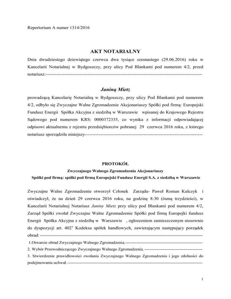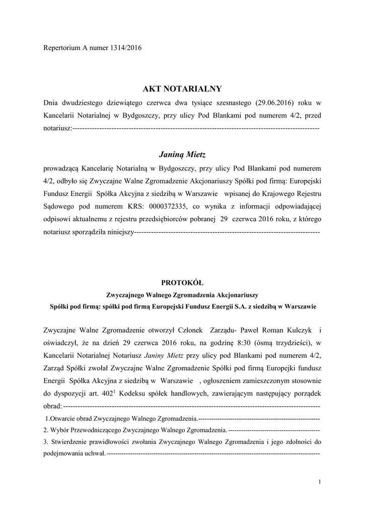 Repertorium A numer 1314/2016 AKT NOTARIALNY Dnia dwudziestego dziewiątego czerwca dwa tysiące szesnastego (29.06.2016) roku w Kancelarii Notarialnej w Bydgoszczy, przy ulicy Pod Blankami pod numerem 4/2, przed notariusz:----------------------------------------------------------------------------------------------------- Janiną Mietz prowadzącą Kancelarię Notarialną w Bydgoszczy, przy ulicy Pod Blankami pod numerem 4/2, odbyło się Zwyczajne Walne Zgromadzenie Akcjonariuszy Spółki pod firmą: Europejski Fundusz Energii Spółka Akcyjna z siedzibą w Warszawie wpisanej do Krajowego Rejestru Sądowego pod numerem KRS: 0000372335, co wynika z informacji odpowiadającej odpisowi aktualnemu z rejestru przedsiębiorców pobranej 29 czerwca 2016 roku, z którego notariusz sporządziła niniejszy---------------------------------------------------------------------------- PROTOKÓŁ Zwyczajnego Walnego Zgromadzenia Akcjonariuszy Spółki pod firmą: spółki pod firmą Europejski Fundusz Energii S.A. z siedzibą w Warszawie Zwyczajne Walne Zgromadzenie otworzył Członek Zarządu- Paweł Roman Kulczyk i oświadczył, że na dzień 29 czerwca 2016 roku, na godzinę 8:30 (ósmą trzydzieści), w Kancelarii Notarialnej Notariusz Janiny Mietz przy ulicy pod Blankami pod numerem 4/2, Zarząd Spółki zwołał Zwyczajne Walne Zgromadzenie Spółki pod firmą Europejki fundusz Energii Spółka Akcyjna z siedzibą w Warszawie , ogłoszeniem zamieszczonym stosownie do dyspozycji art. 4021 Kodeksu spółek handlowych, zawierającym następujący porządek obrad: ---------------------------------------------------------------------------------------------------------1.Otwarcie obrad Zwyczajnego Walnego Zgromadzenia.--------------------------------------------------------2. Wybór Przewodniczącego Zwyczajnego Walnego Zgromadzenia. ------------------------------------------3. Stwierdzenie prawidłowości zwołania Zwyczajnego Walnego Zgromadzenia i jego zdolności do podejmowania uchwał. ---------------------------------------------------------------------------------------------------- 1 4. Podjęcie uchwały w sprawie odstąpienia od wyboru komisji skrutacyjnej i powierzenie liczenia głosów Przewodniczącemu Zwyczajnego Walnego Zgromadzenia. --------------------------------------------5. Przyjęcie porządku obrad. --------------------------------------------------------------------------------------------6.Rozpatrzenie sprawozdania Zarządu z działalności Spółki za okres od 01.01.2015r. do 31.12.2015r. i podjęcie uchwały w sprawie zatwierdzenia sprawozdania Zarządu z działalności Spółki za okres od 01.01.2015r. do 31.12.2015r. -------------------------------------------------------------------------------------------7. Rozpatrzenie jednostkowego sprawozdania finansowego Spółki za okres od 01.01.2015r. do 31.12.2015r. i podjęcie uchwały w sprawie zatwierdzenia jednostkowego sprawozdania finansowego Spółki za okres od 01.01.2015r. do 31.12.2015r. -------------------------------------------------------------------8.Podjęcie uchwały w sprawie pokrycia straty za rok obrotowy 2015. ----------------------------------------9.Rozpatrzenie sprawozdania Zarządu z działalności grupy kapitałowej Spółki za okres od 01.01.2015r. do 31.12.2015r. i podjęcie uchwały w sprawie zatwierdzenia sprawozdania Zarządu z działalności grupy kapitałowej Spółki za okres od 01.01.2015r. do 31.12.2015r. ---------------------------10.Rozpatrzenie skonsolidowanego sprawozdania finansowego grupy kapitałowej Spółki za okres od 01.01.2015r. do 31.12.2015r. i podjęcie uchwały w sprawie zatwierdzenia skonsolidowanego sprawozdania finansowego grupy kapitałowej Spółki za okres od 01.01.2015r. do 31.12.2015r. --------11. Podjęcie uchwały w sprawie zatwierdzenia sprawozdania Rady Nadzorczej z jej działalności w 2015r. oraz z wyników oceny: sprawozdania zarządu z działalności Spółki za rok obrotowy 2015; sprawozdania zarządu z działalności grupy kapitałowej Spółki za rok obrotowy 2015; jednostkowego sprawozdania finansowego Spółki za rok obrotowy 2015; skonsolidowanego sprawozdania finansowego grupy kapitałowej za rok obrotowy 2015r.; wniosku Zarządu co do pokrycia straty za rok obrotowy 2015. ------------------------------------------------------------------------------------------------------------12.Podjęcie uchwały w sprawie udzielenia absolutorium Członkowi Zarządu z wykonywania przez niego obowiązków w 2015 roku. ---------------------------------------------------------------------------------------13. Podjęcie uchwał w sprawie udzielenia absolutorium Członkom Rady Nadzorczej z wykonania przez nich obowiązków w 2015 roku. -------------------------------------------------------------------------------14. Podjęcie uchwały w sprawie podwyższenia kapitału zakładowego w drodze emisji akcji serii H, realizowanej w ramach subskrypcji zamkniętej z zachowaniem prawa poboru dotychczasowych akcjonariuszy na dzień 7 sierpnia 2016 (dzień prawa poboru) oraz wprowadzenia akcji serii H do obrotu w alternatywnym systemie obrotu prowadzonym przez Giełdę Papierów Wartościowych w Warszawie S.A. pod nazwą NewConnect oraz zmiany Statutu Spółki.---------------------------------------15. Zamknięcie obrad Zwyczajnego Walnego Zgromadzenia. ---------------------------------------------------- 2 Do punktu 2 porządku obrad: -------------------------------------------------------------------------Na przewodniczącego Zwyczajnego Walnego Zgromadzenia Paweł Roman Kulczyk zaproponował swoją kandydaturę ----------------------------------------------------------------------- UCHWAŁA NR 1 Zwyczajnego Walnego Zgromadzenia spółki pod firmą Europejski Fundusz Energii S.A. z siedzibą w Warszawie z dnia 29 czerwca 2016 r. w sprawie wyboru Przewodniczącego Zwyczajnego Walnego Zgromadzenia Działając na podstawie art. 409 § 1 Kodeksu spółek handlowych uchwala się co nas