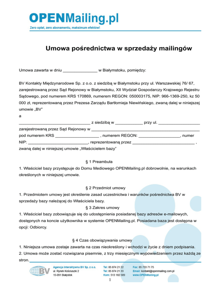 Umowa pośrednictwa w sprzedaży mailingów Umowa zawarta w dniu _______________ w Białymstoku, pomiędzy: BV Kontakty Międzynarodowe Sp. z o.o. z siedzibą w Białymstoku przy ul. Warszawskiej 76/ 67, zarejestrowaną przez Sąd Rejonowy w Białymstoku, XII Wydział Gospodarczy Krajowego Rejestru Sądowego, pod numerem KRS 170869, numerem REGON: 050003175, NIP: 966-1369-250, kz 50 000 zł, reprezentowaną przez Prezesa Zarządu Bartłomieja Niewińskiego, zwaną dalej w niniejszej umowie „BV” a _______________________________ z siedzibą w ____________ przy ul. __________________ zarejestrowaną przez Sąd Rejonowy w _______________________________________________ pod numerem KRS ___________________ , numerem REGON: __________________, numer NIP: __________________________, reprezentowaną przez ___________________________ , zwaną dalej w niniejszej umowie „Właścicielem bazy” § 1 Preambuła 1. Właściciel bazy przystępuje do Domu Mediowego OPENMailing.pl dobrowolnie, na warunkach określonych w niniejszej umowie. § 2 Przedmiot umowy 1. Przedmiotem umowy jest określenie zasad uczestnictwa i warunków pośrednictwa BV w sprzedaży bazy należącej do Właściciela bazy. § 3 Zakres umowy 1. Właściciel bazy zobowiązuje się do udostępnienia posiadanej bazy adresów e-mailowych, dostępnych na koncie użytkownika w systemie OPENMailing.pl. Posiadana baza jest dostępna w opcji: Odbiorcy. § 4 Czas obowiązywania umowy 1. Niniejsza umowa zostaje zawarta na czas nieokreślony i wchodzi w życie z dniem podpisania. 2. Umowa może zostać rozwiązana pisemnie, z trzy miesięcznym wypowiedzeniem przez każdą ze stron. 1 3. Zlecenia wysyłek e-mailingów reklamowych do bazy odbiorców Właściciela bazy będą realizowane do dnia ewentualnego końca obowiązywania umowy na warunkach określonych w niniejszej umowie. § 5 Obowiązki BV 1. W ramach niniejszej umowy BV zobowiązuje się do następujących działań: 1. Pośrednictwa w sprzedaży posiadanej przez Właściciela bazy – bazy adresów emailowych. 2. Obsługi technicznej wysyłanych kampanii e-mailingowych 3. Pozyskiwanie odbiorców zainteresowanych bazą Właściciela i odpowiednia selekcja tematyki wysyłanych mailingów . 4. Właściciel bazy nie zostanie obciążony żadnymi kosztami obsługi technicznej. § 6 Obowiązki Właściciela bazy 1. W ramach niniejszej umowy Właściciel bazy zobowiązuje się do następujących działań: 1. Oświadczenia, iż baza posiadana przez Właściciela bazy jest jego własnością, a odbiorcy bazy e-mailowej wyrazili zgodę na otrzymywanie wiadomości. Oświadczenie stanowi Załącznik nr 1 do niniejszej umowy. 2. Udostępnienie BV bazy odbiorców będącą w posiadaniu Właściciela, na użytek pośrednictwa w sprzedaży mailingów i realizacji zakupionych przez Klientów mailingów. 3. Udzielenie BV nieodwołalnego do czasu wygaśnięcia lub rozwiązania niniejszej umowy, pełnomocnictwa do sprzedaży mailingów reklamowych do bazy Właściciela bazy. § 7 Wyłączenie odpowiedzialności 1. BV nie bierze odpowiedzialności za treść i kształt reklam wysyłanych w e-mailingach reklamowych, a w szczególności treści niezgodnych z polskim prawem lub naruszających prawnie chroniony interes osób trzecich. 2. BV nie bierze odpowiedzialności za zaspokojenie wszelkich roszczeń z tytułu praw autorskich do materiałów tworzących reklamę w szczególności: zdjęcia, informacje, materiały tekstowe. 3. Strony nie ponoszą odpowiedzialności za opóźnione w świadczeniu usług spowodowane siłą wyższą, m.in. czynnikami takimi jak.: awarie sieci telekomunikacyjnej, operatora sieci publicznej. Powyższe czynniki zobowiązują strony do przesunięcia terminu świadczenia usług do czasu usunięcia przeszkód. 2 § 8 Realizacja kampanii e-mailingowych 1. BV realizuje wysyłki e-mailingów do bazy Właściciela, na podstawie uzgodnionych z Właścicielem bazy warunkach. 2. Warunki sprzedażowe uzgodnione są w Załączniku nr 2 do niniejszej umowy 3. Przed rezerwacją i sprzedażą wysyłki do bazy Właściciela, osoba wyznaczona do kontaktu ze strony BV, skontaktuje się z Właścicielem bazy w celu: - uzgodnienia terminu wysyłki, - uzyskania zgody Właściciela na wysyłkę konkretnej tematycznie kreacji, - ustalenie wysokości kwoty za mailing sprzedażowy, na podstawie ustaleń zawartych w Załączniku nr 2. 4. Akceptacja planowanej wysyłki nie podlega odwołaniu przez Właściciela bazy. § 9 Wstrzymanie realizacji zlecenia 1. Sprzedaż mailingów za pośrednictwem OPENMailing.pl odbywać się będzie na warunkach ustalanych przez BV, z uwzględnieniem wszelkich ustaleń z Właścicielem bazy. 2. BV nie może sprzedać wysyłki mailingu do bazy po cenie niższej niż minimalnie ustalona cena w Załączniku nr 2. § 10 Wynagrodzenia i płatności 1. Właściciel bazy otrzyma wynagrodzenie od BV za każdą wysyłkę sprzedażową zleconą przez Klienta BV. 2. Należność wobec Właściciela bazy, BV będzie regulowała na podstawie faktury VAT wystawionej przez Właściciela bazy. Faktury VAT będą wystawiane przez Właściciela bazy na podstawie zleceń przekazanych Właścicielowi bazy przy każdorazowym zamówieniu e-mailingu sprzedażowego. 3. Faktury VAT regulowane będą z terminem płatności – 30 dni od daty wystawienia. 4. Faktury VAT wystawiane będą ostatniego dnia miesiąca kalendarzowego. 5. Świadczenia regulowane będą przelewem bankowym, na konto podane w Załączniku nr 2, w terminie 30 dni od otrzymania Faktury VAT od Właściciela bazy. § 11 Postanowienia końcowe 1. Do umowy nie zostały zawarte żadne dodatkowe ustalenia ustne. 2. Prawa i obowiązki wynikające z niniejszej umowy przechodzą na ewentualnych następców prawnych, za zgodą obu stron umowy. 3 3. Każda ze stron zobowiązuje się do zachowania w tajemnicy wszelkich danych i informacji drugiej strony, stanowiących jej tajemnicę w rozumieniu Umowy o zwalczaniu nieuczciwej konkur