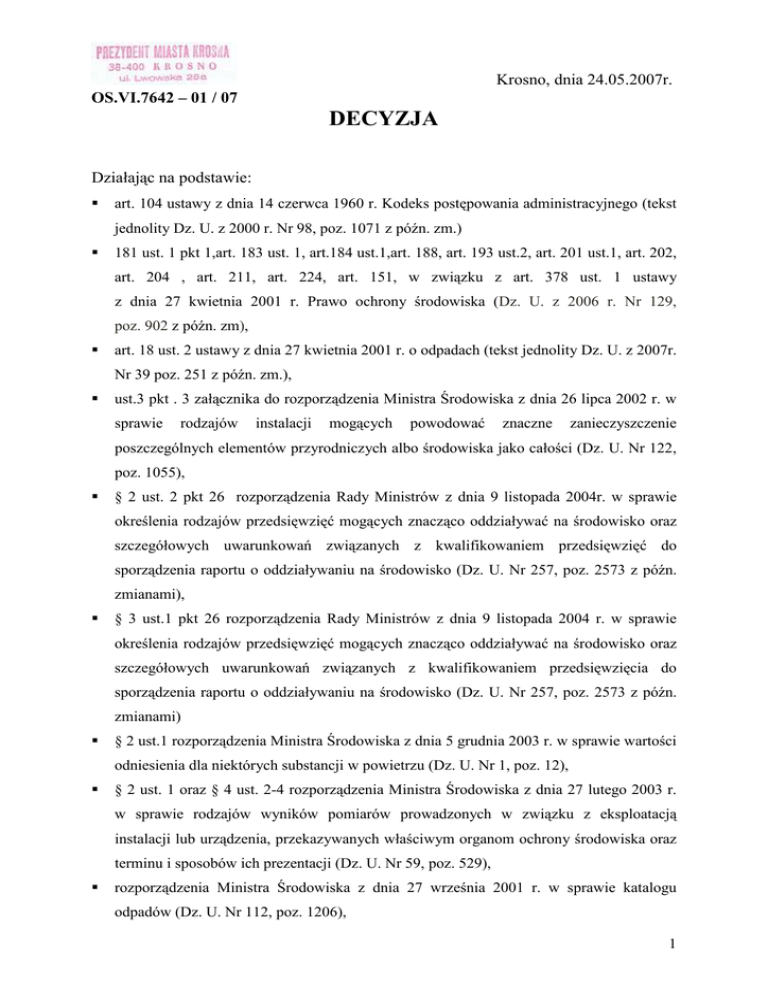 Krosno, dnia 24.05.2007r. OS.VI.7642 – 01 / 07 DECYZJA Działając na podstawie: art. 104 ustawy z dnia 14 czerwca 1960 r. Kodeks postępowania administracyjnego (tekst jednolity Dz. U. z 2000 r. Nr 98, poz. 1071 z późn. zm.) 181 ust. 1 pkt 1,art. 183 ust. 1, art.184 ust.1,art. 188, art. 193 ust.2, art. 201 ust.1, art. 202, art. 204 , art. 211, art. 224, art. 151, w związku z art. 378 ust. 1 ustawy z dnia 27 kwietnia 2001 r. Prawo ochrony środowiska (Dz. U. z 2006 r. Nr 129, poz. 902 z późn. zm), art. 18 ust. 2 ustawy z dnia 27 kwietnia 2001 r. o odpadach (tekst jednolity Dz. U. z 2007r. Nr 39 poz. 251 z późn. zm.), ust.3 pkt . 3 załącznika do rozporządzenia Ministra Środowiska z dnia 26 lipca 2002 r. w sprawie rodzajów instalacji mogących powodować znaczne zanieczyszczenie poszczególnych elementów przyrodniczych albo środowiska jako całości (Dz. U. Nr 122, poz. 1055), § 2 ust. 2 pkt 26 rozporządzenia Rady Ministrów z dnia 9 listopada 2004r. w sprawie określenia rodzajów przedsięwzięć mogących znacząco oddziaływać na środowisko oraz szczegółowych uwarunkowań związanych z kwalifikowaniem przedsięwzięć do sporządzenia raportu o oddziaływaniu na środowisko (Dz. U. Nr 257, poz. 2573 z późn. zmianami), § 3 ust.1 pkt 26 rozporządzenia Rady Ministrów z dnia 9 listopada 2004 r. w sprawie określenia rodzajów przedsięwzięć mogących znacząco oddziaływać na środowisko oraz szczegółowych uwarunkowań związanych z kwalifikowaniem przedsięwzięcia do sporządzenia raportu o oddziaływaniu na środowisko (Dz. U. Nr 257, poz. 2573 z późn. zmianami) § 2 ust.1 rozporządzenia Ministra Środowiska z dnia 5 grudnia 2003 r. w sprawie wartości odniesienia dla niektórych substancji w powietrzu (Dz. U. Nr 1, poz. 12), § 2 ust. 1 oraz § 4 ust. 2-4 rozporządzenia Ministra Środowiska z dnia 27 lutego 2003 r. w sprawie rodzajów wyników pomiarów prowadzonych w związku z eksploatacją instalacji lub urządzenia, przekazywanych właściwym organom ochrony środowiska oraz terminu i sposobów ich prezentacji (Dz. U. Nr 59, poz. 529), rozporządzenia Ministra Środowiska z dnia 27 września 2001 r. w sprawie katalogu odpadów (Dz. U. Nr 112, poz. 1206), 1 §5 rozporządzenia Ministra Gospodarki, Pracy i Polityki Społecznej z dnia 2 lipca 2003 r.w sprawie zasadniczych wymagań dla urządzeń uŜywanych na zewnątrz pomieszczeń w zakresie emisji hałasu do środowiska (Dz. U. Nr 138, poz. 1316), §4 i §5 rozporządzenie Ministra Środowiska z dnia 29 lipca 2004 r. w sprawie dopuszczalnych poziomów hałasu w środowisku (Dz. U. Nr 178 poz. 1841), § 2 rozporządzenia Ministra Środowiska z dnia 6 czerwca 2002 r. w sprawie dopuszczalnych poziomów niektórych substancji w powietrzu, alarmowych poziomów niektórych substancji w powietrzu oraz marginesów tolerancji dla dopuszczalnych poziomów niektórych substancji (Dz. U. Nr 87, poz. 796), art. 128 ust.1 ustawy z dnia 18 lipca 2001 r. Prawo wodne (jednolity tekst Dz.U. Nr 239 z 2005 r., poz. 2019) art. 10 ustawy z dnia 7 czerwca 2001 r. o zbiorowym zaopatrzeniu w wodę i zbiorowym odprowadzaniu ścieków (Dz. U. Nr 72, poz. 747 z późn. zmianami), § 8 rozporządzenia Ministra Infrastruktury z dnia 20 lipca 2002 r. w sprawie sposobu realizacji obowiązków dostawców ścieków przemysłowych oraz warunków wprowadzania ścieków do urządzeń kanalizacyjnych (Dz. U. Nr 129 poz. 1108 z późn. zmianami.), po rozpatrzeniu wniosku z dnia 28.09.2005 r. znak: DB/510/2006 - KROSGLASS Spółka .Akcyjna z siedzibą 38 – 400 Krosno, ul. Tysiąclecia 17, w sprawie wydania pozwolenia zintegrowanego dla instalacji do produkcji włókna szklanego oraz po przeprowadzeniu rozprawy administracyjnej; orzekam udzielić dla KROSGLASS S.A. z siedzibą 38-400 Krosno, ul. Tysiąclecia 17, Regon 370497790 pozwolenia zintegrowanego na prowadzenie instalacji do produkcji włókna szklanego oraz określam: I. Rodzaj i parametry instalacji oraz rodzaj prowadzonej działalności. 1. Rodzaj instalacji oraz rodzaj prowadzonej działalności. Zakład KROSGLASS S.A. będzie eksploatował instalację do produkcji włókna szklanego o zdolności produkcyjnej ponad 20 ton wytopu na dobę 2 2. Parametry urządzeń i instalacji istotne z punktu widzenia przeciwdziałania zanieczyszczeniom. 2.1. Parametry instalacji. W skład instalacji do produkcji włókna szklanego o łącznej wydajności 11 712 Mg/rok wchodzić będą następujące urządzenia i obiekty: Linia produkcyjna wanny szklarskiej Nr 25 i Nr 26 (o łącznej wydajności 11 712 Mg/rok) Linia produkcyjna wanny szklarskiej Nr 25 i Nr 26 obejmuje następujące węzły: - magazyn surowców szklarskich - zestawiarnia - wanna nr 25 i nr 26 - homogenizacja wanny nr 25 i nr 26 - zasilacz wanny nr 25 i nr 26 - piec do suszenia włókna nr 1 i nr 2 - linia do formowania mat nr 1, nr 2 i nr 3 - oddział włókna ciętego - oddział włókna przewijanego 2.1.1.Parametry urządzeń - wanna nr 25 o powierzchni 13,7 m2 i maksymalnej zdolności wytopowej 1050 kg/m2/24h - wanna nr 26 o powierzchni 17 m2 i maksymalnej zdolności wytopowej 1100 kg/m2/24h - 56 stanowisk formujących, kaŜda o maksymalnej wydajności od 0,3 do 1,2 Mg/dobę - piece do suszenia o maksymalnej wydajności 32 Mg/dobę - linie do formowania mat o wydajności: - linia nr 1- maksimum 9 Mg/dobę - linia nr 2 – maksimum 12 Mg/dobę - linia nr 3 – maksimum 16,5 Mg/dobę - cięcie rowingu – jedna maszyna o maksymalnej wydajności 1,05 Mg/dobę - dwie maszyny do cięcia o maksymalnej wydajności kaŜda po 2,4 Mg/dobę - przewijanie rowingu – osiem maszyn o łącznej maksymalnej wydajności 6 Mg/dobę 2.1.2. Parametry procesów produkcyjnych prowadzonych w instalacji Podstawowym zadaniem instalacji będzie produkcja włókna szklanego ze szkła typu E (boroglino-krzemianowe). Produktem podstawowym uzyskiwanym z instalacji jest włókno szklane 3 w ilości ok. 11 700 Mg wytopu/rok, z którego w dalszej części