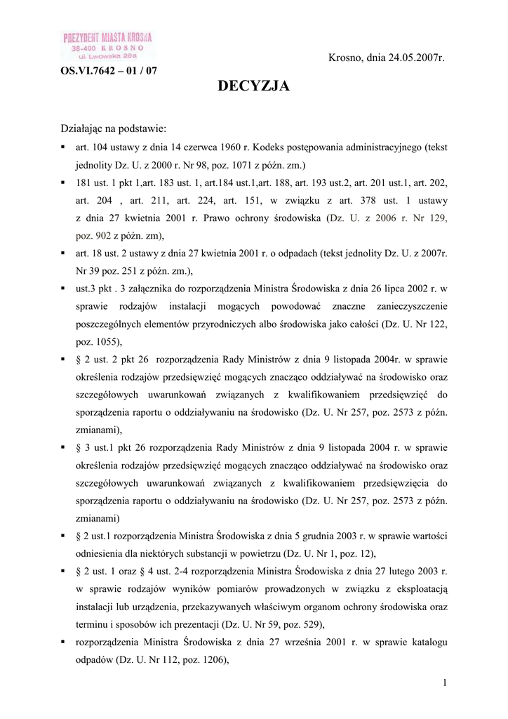 Pozwolenie zintegrowane dla KROSGLASS S.A.