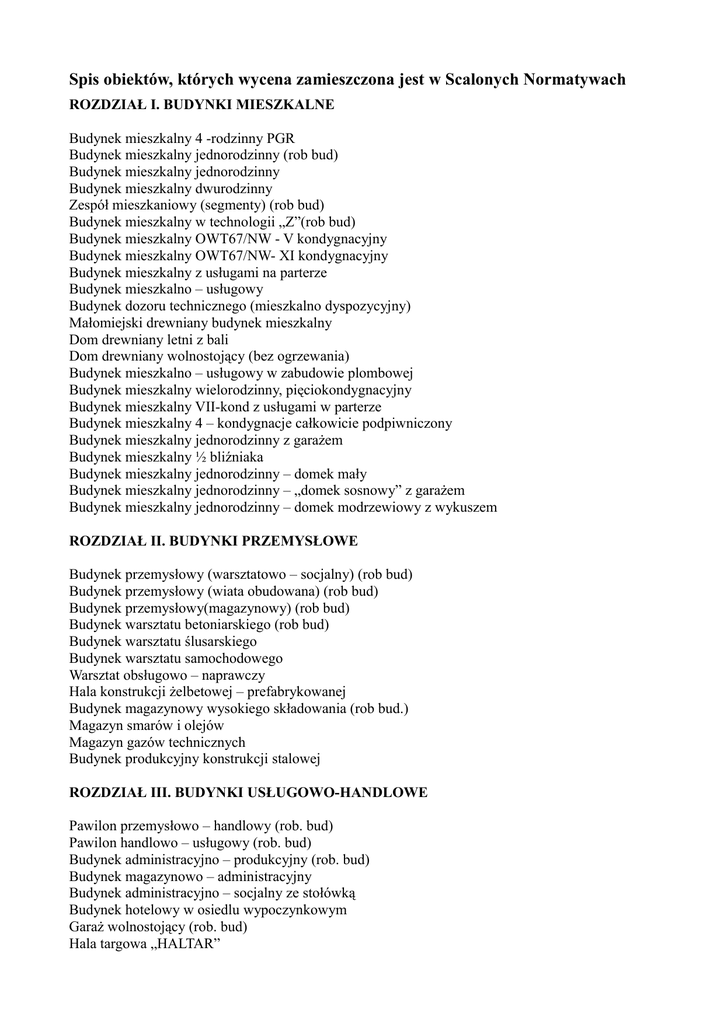 Spis obiektów, których wycena zamieszczona jest w Scalonych Normatywach ROZDZIAŁ I. BUDYNKI MIESZKALNE Budynek mieszkalny 4 -rodzinny PGR Budynek mieszkalny jednorodzinny (rob bud) Budynek mieszkalny jednorodzinny Budynek mieszkalny dwurodzinny Zespół mieszkaniowy (segmenty) (rob bud) Budynek mieszkalny w technologii „Z”(rob bud) Budynek mieszkalny OWT67/NW - V kondygnacyjny Budynek mieszkalny OWT67/NW- XI kondygnacyjny Budynek mieszkalny z usługami na parterze Budynek mieszkalno – usługowy Budynek dozoru technicznego (mieszkalno dyspozycyjny) Małomiejski drewniany budynek mieszkalny Dom drewniany letni z bali Dom drewniany wolnostojący (bez ogrzewania) Budynek mieszkalno – usługowy w zabudowie plombowej Budynek mieszkalny wielorodzinny, pięciokondygnacyjny Budynek mieszkalny VII-kond z usługami w parterze Budynek mieszkalny 4 – kondygnacje całkowicie podpiwniczony Budynek mieszkalny jednorodzinny z garażem Budynek mieszkalny ½ bliźniaka Budynek mieszkalny jednorodzinny – domek mały Budynek mieszkalny jednorodzinny – „domek sosnowy” z garażem Budynek mieszkalny jednorodzinny – domek modrzewiowy z wykuszem ROZDZIAŁ II. BUDYNKI PRZEMYSŁOWE Budynek przemysłowy (warsztatowo – socjalny) (rob bud) Budynek przemysłowy (wiata obudowana) (rob bud) Budynek przemysłowy(magazynowy) (rob bud) Budynek warsztatu betoniarskiego (rob bud) Budynek warsztatu ślusarskiego Budynek warsztatu samochodowego Warsztat obsługowo – naprawczy Hala konstrukcji żelbetowej – prefabrykowanej Budynek magazynowy wysokiego składowania (rob bud.) Magazyn smarów i olejów Magazyn gazów technicznych Budynek produkcyjny konstrukcji stalowej ROZDZIAŁ III. BUDYNKI USŁUGOWO-HANDLOWE Pawilon przemysłowo – handlowy (rob. bud) Pawilon handlowo – usługowy (rob. bud) Budynek administracyjno – produkcyjny (rob. bud) Budynek magazynowo – administracyjny Budynek administracyjno – socjalny ze stołówką Budynek hotelowy w osiedlu wypoczynkowym Garaż wolnostojący (rob. bud) Hala targowa „HALTAR” Budynek wielofunkcyjny (mieszkalny, biurowy, magazynowy) ROZDZIAŁ IV. BUDYNKI SŁUŻBY ZDROWIA I OŚWIATY Przychodnia rejonowa Dom Pomocy Społecznej Przedszkole 2-u oddziałowe Przedszkole 4-ro oddziałowe (rob. bud) Dom Dziecka dla 48 dzieci Przedszkole 4-ro oddziałowe Budynek wielofunkcyjny dla dzieci niepełnosprawnych Szkoła wraz z salą gimnastyczną Budynek rehabilitacyjny ROZDZIAŁ V. BUDYNKI WIEJSKIE Obora dla 8 krów z przychówkiem (rob. bud) Chlewnia o produkcji 300 tuczników (rob. bud) Kurnik dla 300 niosek (ściołowy) (rob. bud) Budynek inwentarski (rob.) Budynek gospodarczy z wysokim dachem (rob. bud) Stodoła 2 klepiskowa kryta blachą ocynkowaną (rob bud) Szklarnia do upraw parapetowych 9 x 30 m (rob bud) Budynek gospodarczy dla pracowników PGR Budynek ptaszarni ROZDZIAŁ VI. BUDOWLE Placyki gospodarcze Osłona śmietnika Zbiorniki wodociągowe o pojemności 2500 m3 Komin stalowy H = 30 m Myjnia samochodowa – płytowa Ogrodzenia Kanały sieci cieplnej Osadniki Studnie kopane i wiercone Ukształtowanie terenu Drogi o nawierzchni betonowej Drogi o nawierzchni z trylinki Drogi o nawierzchni z asfaltobetonu Drogi o nawierzchni z asfaltu lanego Drogi o nawierzchni z kostki betonowej Bauma Drogi o nawierzchni gruntowej (grunt piaszczysty) Drogi o nawierzchni gruntowej (grunt gliniasty) Drogi o nawierzchni żużlowej Drogi o nawierzchni żwirowej Drogi o nawierzchni z tłucznia kamiennego Drogi o nawierzchni z brukowca narzutowego Drogi o nawierzchni z kostki brukowej Drogi z płyt żelbet. prefabr-ażurow. Drogi z płyt żelbet. prefabr-pełnych Chodniki z płyt betonowych Chodniki o nawierzchni z asfaltobet. Chodniki o nawierzchni z asfaltu lanego Chodniki o nawierzchni z kostki betonowej Bauma Sieć wodociągowa magistralna Kanalizacja sanitarna magistralna Sieć magistralna centralnego ogrzewania Sieć gazowa rozdzielcza Przyłącze kanalizacyjne Przyłącze kanalizacji sanitarnej Przyłącze kanalizacji deszczowej Przyłącze kanalizacji deszczowej (rury betonowe Dn 200) Przyłącze wodociągowe Dn-40 Przyłącze gazowe Dn-50 Przyłącze elektryczne Przyłącze kablowe 4 x 120 mm2 Oświetlenie ulic i parkingów Osadnik na nieczystości 2-komorowy Zasilanie kablowe budynku kablem YKY 4 x 10 mm Poletko osadowe Komora zasuw Komora z kratą Zbiornik retencyjny (wyrównawczy) 2 x 100 m3 Studnia głębinowa (głęb. 60 m) Linia kablowa SN – 15 Kv Linia kablowa NN Sieć kanalizacji sanitarnej fi 200 mm Sieć cieplna z rur preizolowanych Wodociąg wiejski z rur PCV Mur oporowy o wysokości 3m, 5m żelbetowy monolityczny Zbiornik podziemny jednokomorowy na ścieki głębokość 4,5 m Komin wentylacyjny konstrukcji stalowej Dz = 377 mm Studzienka kanalizacyjna murowana kwasoodporna Sieć kanal. deszczowej z rur PCV Przyłącze gazu z rur PE fi 32 mm Odwodnienie terenu (rury kam fi 200, 300 oraz studz. ściek.) Linia kablowa SN (kabel 3x120 mm2) Bocznica kolejowa ROZDZIAŁ VII. Budynki inne Waga samochodowa 25 T i budynek wagowego Prefabrykowana stacja transformator Budynek przepompowni ścieków Portiernia Oczyszczalnia ścieków mechaniczno biologiczna Budynek ratusza miejskiego Hala sportowa Kryta pływalnia z basenami Miejska stacja transformatorowa (3 polowa) Miejska stacja transformatorowa (4 polowa) Rampa załadunkowa kryta Wiata magazyn butli gazów techn.