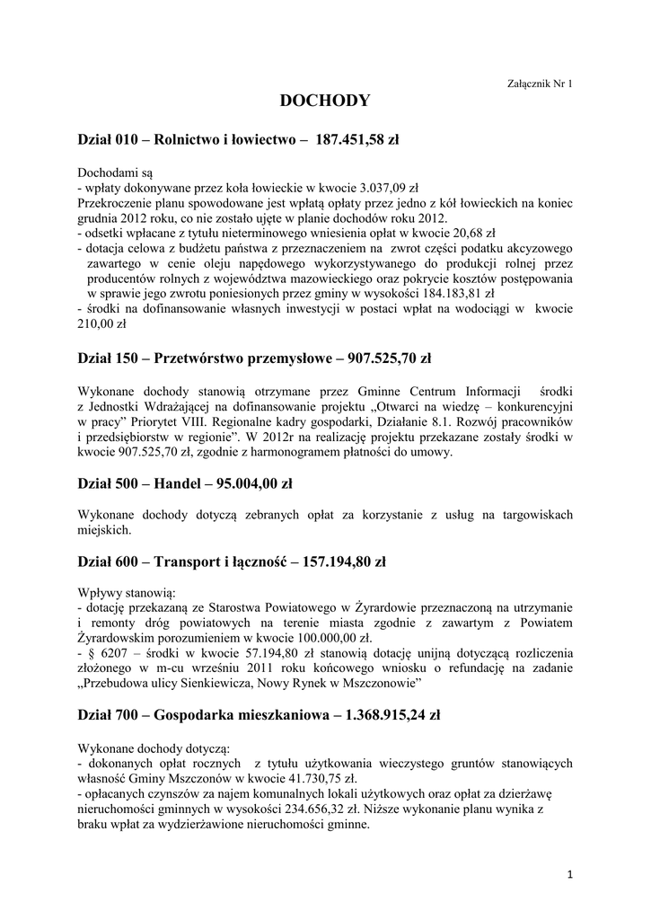 Załącznik Nr 1 DOCHODY Dział 010 – Rolnictwo i łowiectwo – 187.451,58 zł Dochodami są - wpłaty dokonywane przez koła łowieckie w kwocie 3.037,09 zł Przekroczenie planu spowodowane jest wpłatą opłaty przez jedno z kół łowieckich na koniec grudnia 2012 roku, co nie zostało ujęte w planie dochodów roku 2012. - odsetki wpłacane z tytułu nieterminowego wniesienia opłat w kwocie 20,68 zł - dotacja celowa z budżetu państwa z przeznaczeniem na zwrot części podatku akcyzowego zawartego w cenie oleju napędowego wykorzystywanego do produkcji rolnej przez producentów rolnych z województwa mazowieckiego oraz pokrycie kosztów postępowania w sprawie jego zwrotu poniesionych przez gminy w wysokości 184.183,81 zł - środki na dofinansowanie własnych inwestycji w postaci wpłat na wodociągi w kwocie 210,00 zł Dział 150 – Przetwórstwo przemysłowe – 907.525,70 zł Wykonane dochody stanowią otrzymane przez Gminne Centrum Informacji środki z Jednostki Wdrażającej na dofinansowanie projektu „Otwarci na wiedzę – konkurencyjni w pracy” Priorytet VIII. Regionalne kadry gospodarki, Działanie 8.1. Rozwój pracowników i przedsiębiorstw w regionie”. W 2012r na realizację projektu przekazane zostały środki w kwocie 907.525,70 zł, zgodnie z harmonogramem płatności do umowy. Dział 500 – Handel – 95.004,00 zł Wykonane dochody dotyczą zebranych opłat za korzystanie z usług na targowiskach miejskich. Dział 600 – Transport i łączność – 157.194,80 zł Wpływy stanowią: - dotację przekazaną ze Starostwa Powiatowego w Żyrardowie przeznaczoną na utrzymanie i remonty dróg powiatowych na terenie miasta zgodnie z zawartym z Powiatem Żyrardowskim porozumieniem w kwocie 100.000,00 zł. - § 6207 – środki w kwocie 57.194,80 zł stanowią dotację unijną dotyczącą rozliczenia złożonego w m-cu wrześniu 2011 roku końcowego wniosku o refundację na zadanie „Przebudowa ulicy Sienkiewicza, Nowy Rynek w Mszczonowie” Dział 700 – Gospodarka mieszkaniowa – 1.368.915,24 zł Wykonane dochody dotyczą: - dokonanych opłat rocznych z tytułu użytkowania wieczystego gruntów stanowiących własność Gminy Mszczonów w kwocie 41.730,75 zł. - opłacanych czynszów za najem komunalnych lokali użytkowych oraz opłat za dzierżawę nieruchomości gminnych w wysokości 234.656,32 zł. Niższe wykonanie planu wynika z braku wpłat za wydzierżawione nieruchomości gminne. 1 - odsetek wpłacanych z tytułu nieterminowego wnoszenia opłat dzierżawnych oraz opłat rocznych za użytkowanie wieczyste gruntów w kwocie 2.047,29 zł - wpłat z tytułu sprzedaży nieruchomości gminnych w kwocie 817.854,65 zł. Ogólna kwota wynika z wartości gruntów zbytych na przestrzeni 2012 roku, tj. działek 82/4, 82/1, 1182/48, 1182/49, 1182/261, 40/3, 207/1, 1413, 1415/4, 1442/1, 1442/2 położonych w Mszczonowie oraz działek 83/7, 120/3, 119/8, 119/6, 118/1, 117/1, 114/1, 111/7, 112/7 położonych w Adamowicach, - wpływów z zawartej trójstronnej umowy pomiędzy EC Żerań– PPKL Keramzyt – Gminą Mszczonów za przyjęcie i wykorzystanie odpadów paleniskowych w kwocie 272.626,23 zł. Dział 750 – Administracja publiczna – 179.886,42 zł Dochody wykonane stanowią: - otrzymaną dotację z budżetu państwa z przeznaczeniem na wykonywanie zadań z zakresu Ewidencji Ludności oraz Urzędu Stanu Cywilnego w wysokości 143.496,00 zł - 5% należnych gminie dochodów z tytułu realizacji zadań z zakresu administracji rzędowej – udostępnianie danych osobowych w kwocie 155,00 zł, - wpływy z różnych opłat w wysokości 10.328,92 zł, tj.: kwoty wpływów z opłat za udostępnienie informacji publicznej w kwocie 28,04 zł zwrotu kosztów wystawionych upomnień z tytułu nieterminowego regulowania podatków i opłat w kwocie 10.300,88 zł - wpływy za wynajem sali przez Mazowiecki Ośrodek Doradztwa Rolniczego w kwocie 906,50 zł. Niższe wykonanie dochodów z tytułu wpływów za wynajem sali spowodowane zbyt wysokim przyjęciem planu w stosunku do podpisanej umowy. - § 2008 – środki w kwocie 25.000,00 zł stanowią dotację z Lokalnej Grupy Działania „Ziemia Chełmońskiego” z tytułu refundacji kosztów poniesionych na realizację małego projektu w ramach Programu Rozwoju Obszarów Wiejskich: „Rekonstrukcja Bitwy Mszczonowskiej”. W ramach § 2008 ujęta była także przewidywana dotacja z Lokalnej Grupy Działania „Ziemia Chełmońskiego” na realizację małych projektów w ramach Programu Rozwoju Obszarów Wiejskich „Ożywić historię”. Wniosek o płatność złożony został w m-c listopadzie 2012r. Jednakże do dnia 31.12.2012r dotacja nie została przekazana. Dział 751 – Urzędy naczelnych organów władzy państwowej, kontroli i ochrony prawa oraz sądownictwa – 1.937,00 zł Zrealizowane wpływy dotyczą dotacji przekazanej z Krajowego Biura Wyborczego z przeznaczeniem na prowadzenie rejestru wyborców. Dział 754 – Bezpieczeństwo publiczne i ochrona przeciwpożarowa – 981,96 zł 2 Wykonane dochody stanowią zwrot za zużycie energii elektrycznej dla zasilania reklamy wizerunkowej Plus GSM umieszczonej na budynku OSP w Mszczonowie z lat ubiegłych od FORMAT – Telecom Plus GSM wraz z odsetkami za nieterminowe uregulowanie płatności. Niższe wykonanie planu wynika z braku uregulowania w 2012 roku wpłaty przez FORMAT – Telecom Plus GSM Dział 756 – Dochody od osób prawnych, od osób fizycznych i od innych jednostek nieposiadających osobowości prawnej oraz wydatki związane z ich poborem – 24.937.239,81 zł Wpływami są: - zebrane przez Urząd Skarbowy podatki opłacane w formie karty podatkowej, wpływy ze zryczałtowanego podatku dochodowego w kwocie 59.696,60 zł - odsetki od nieterminowych wpłat tego podatku w kwocie 26,00 zł Podatki od osób prawnych Wykonane dochody dotyczą: - wpływów z tytułu podatku od nieruchomości w kwocie 12.630.388,37 zł - wpływów z tytułu podatku rolneg