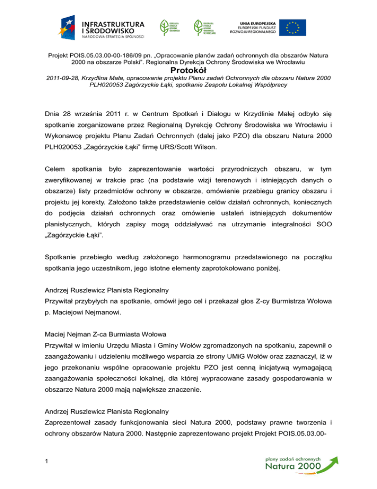 Projekt POIS.05.03.00-00-186/09 pn. „Opracowanie planów zadań ochronnych dla obszarów Natura 2000 na obszarze Polski”. Regionalna Dyrekcja Ochrony Środowiska we Wrocławiu Protokół 2011-09-28, Krzydlina Mała, opracowanie projektu Planu zadań Ochronnych dla obszaru Natura 2000 PLH020053 Zagórzyckie Łąki, spotkanie Zespołu Lokalnej Współpracy Dnia 28 września 2011 r. w Centrum Spotkań i Dialogu w Krzydlinie Małej odbyło się spotkanie zorganizowane przez Regionalną Dyrekcję Ochrony Środowiska we Wrocławiu i Wykonawcę projektu Planu Zadań Ochronnych (dalej jako PZO) dla obszaru Natura 2000 PLH020053 „Zagórzyckie Łąki” firmę URS/Scott Wilson. Celem spotkania było zaprezentowanie wartości przyrodniczych obszaru, w tym zweryfikowanej w trakcie prac (na podstawie wizji terenowych i istniejących danych o obszarze) listy przedmiotów ochrony w obszarze, omówienie przebiegu granicy obszaru i projektu jej korekty. Założono także przedstawienie celów działań ochronnych, koniecznych do podjęcia działań ochronnych oraz omówienie ustaleń istniejących dokumentów planistycznych, których zapisy mogą oddziaływać na utrzymanie integralności SOO „Zagórzyckie Łąki”. Spotkanie przebiegło według założonego harmonogramu przedstawionego na początku spotkania jego uczestnikom, jego istotne elementy zaprotokołowano poniżej. Andrzej Ruszlewicz Planista Regionalny Przywitał przybyłych na spotkanie, omówił jego cel i przekazał głos Z-cy Burmistrza Wołowa p. Maciejowi Nejmanowi. Maciej Nejman Z-ca Burmiasta Wołowa Przywitał w imieniu Urzędu Miasta i Gminy Wołów zgromadzonych na spotkaniu, zapewnił o zaangażowaniu i udzieleniu możliwego wsparcia ze strony UMiG Wołów oraz zaznaczył, iż w jego przekonaniu wspólne opracowanie projektu PZO jest cenną inicjatywą wymagającą zaangażowania społeczności lokalnej, dla której wypracowane zasady gospodarowania w obszarze Natura 2000 mają największe znaczenie. Andrzej Ruszlewicz Planista Regionalny Zaprezentował zasady funkcjonowania sieci Natura 2000, podstawy prawne tworzenia i ochrony obszarów Natura 2000. Następnie zaprezentowano projekt Projekt POIS.05.03.00- 1 00-186/09 pn. „Opracowanie planów zadań ochronnych dla obszarów Natura 2000 na obszarze Polski” i zakres udziału RDOŚ we Wrocławiu w tym projekcie. Po zakończeniu powyższych prezentacji głos został przekazany przedstawicielom Wykonawcy projektu PZO. Wojciech Lewandowski URS/Scott Wilson Zaprezentowano typy siedlisk przyrodniczych stanowiących przedmioty ochrony obszaru wraz ze wskazaniem koniecznych do przeprowadzenia zmian w istniejącym Standardowym Formularzu Danych (dalej SDF). W toku przeprowadzonych prac terenowych, analizujących rozmieszczenie i stan zachowania poszczególnych typów siedlisk przyrodniczych zweryfikowano udział powierzchni poszczególnych typów siedlisk przyrodniczych oraz stan ich zachowania. W obszarze stwierdzono nowy typ siedliska przyrodniczego dla tego obszaru – kwaśne dąbrowy [kod 9190]. Największe powierzchnie w obszarze zajmują trzy typy siedlisk przyrodniczych: zmiennowilgotne łąki trzęślicowe [6410] 42,2 ha, niżowe i górskie ekstensywnie użytkowane łąki świeże [6510] 42,2 ha i kwaśne dąbrowy [kod 9190] 40,9 ha. Przedstawiono także główne zagrożenia dla poszczególnych typów siedlisk przyrodniczych oraz działania ochronne, które należy podjąć w celu ich zachowania. Zwrócono uwagę na problematyczny obszar częściowo zdegradowanych łąk zmiennowilgotnych, które zostały poddane zalesieniu przez Nadleśnictwo Wołów. Jacek Czepnik Z-ca Nadleśniczego Nadleśnictwa Wołów Zwrócił uwagę na prowadzoną z RDOŚ we Wrocławiu korespondencję poprzedzającą zalesienie fragmentu aktualnie wykazanych łąk zmiennowilogtnych w północno-wschodniej części obszaru i uzyskanie przez Nadl. Wołów wszelkich wymaganych prawem zezwoleń i uzgodnień w tej sprawie. Przedstawiono również stanowisko, iż ze względu na obecności tam bobrów na cieku przepływającym przez ten obszar i sukcesywnie podnoszącego się poziomu wód gruntowych siedliska tam występujące ewoluować będą w kierunku zbiorowisk szuwarowych, w związku z czym nie ma w tym miejscu warunków do trwałego występowania łąk zmiennowilgotnych. Grażyna Góral RDLP Wrocław Potwierdziła, iż jednostki Lasów Państwowych przeprowadziły odpowiednie procedury i uzgodnienia w celu zachowania cennych przyrodniczo terenów w procesie zalesiania gruntów przekazywanych przez władającą nimi Agencję Nieruchomości Rolnych, Oddział Terenowy we Wrocławiu, na terenie Nadl. Wołów. 2 Wojciech Lewandowski URS/Scott Wilson Zaproponował, iż Wykonawca projektu PZO zapozna się z dokumentacją w tej sprawie i zorganizowane zostanie spotkanie w z udziałem przedstawicieli RDOŚ we Wrocławiu, Nadleśnictwa Wołów, RDLP Wrocław oraz Wykonawcy projektu PZO mające na celu ustalenie celowości i możliwości zachowania siedliska łąk zmiennowilgotnych na rozpatrywanym fragmencie obszaru w północno-wschodniej części ostoi. Katarzyna Żuk URS/Scott Wilson Zaprezentowała gatunki bezkręgowców stanowiące przedmioty ochrony w obszarze z uwzględnieniem występowania siedlisk poszczególnych gatunków, ich stanu zachowania, perspektyw ochrony oraz koniecznych do podjęcia działań ochronnych. W trakcie prac terenowych udało się odnaleźć stanowisko gatunku ujętego w Zał. II Dyrektywy Siedliskowej – poczwarówki zwężonej Vertigo angusitor [kod 1014]. Gatunek ten powinien stanowić przedmiot ochrony w obszarze ze względu na liczne nowe stanowisko gatunku oraz dostępność dobrze zachowanych, dogodnych siedlisk gatunku w granicach obszaru. W przyszłości należy przeprowadzić dodatkowe prace terenowe w celu dokładniejszego rozpoznania występowania gatunku w granicach ostoi „Zagórzyckie Łąki”. Wojciech Lewandowski URS/Scott Wilson Po zakończeniu części p