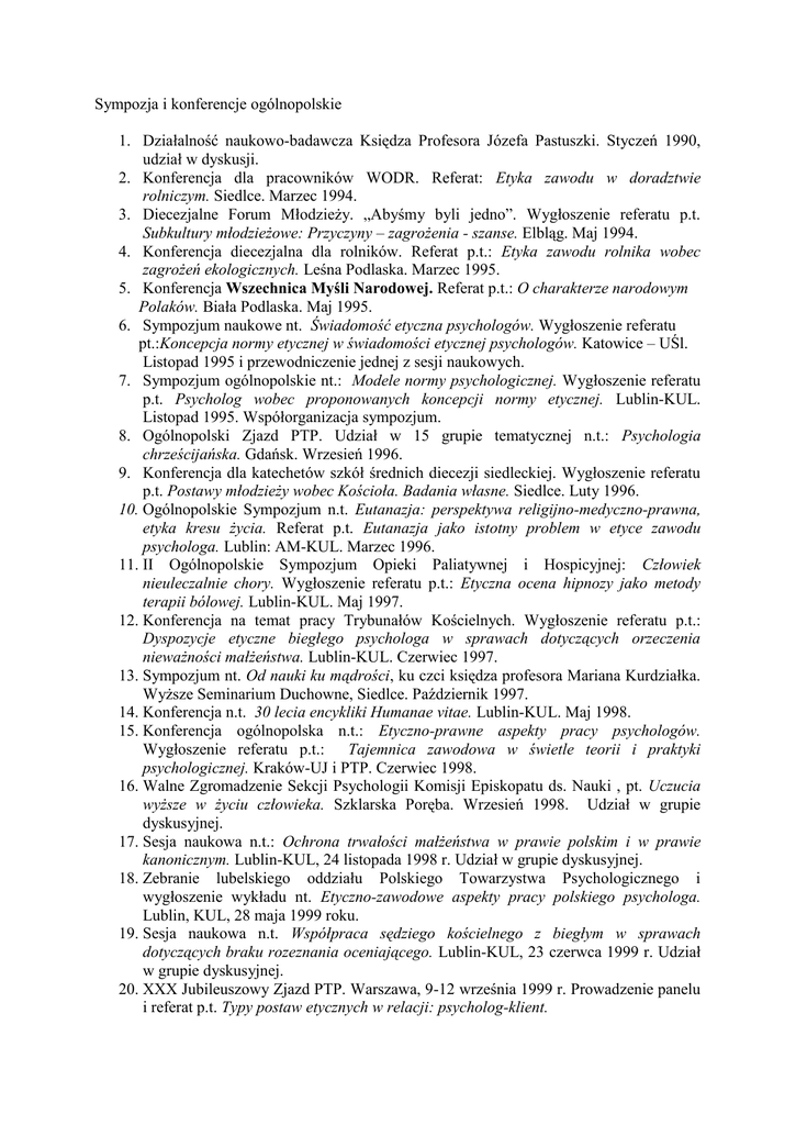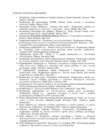 Sympozja i konferencje ogólnopolskie 1. Działalność naukowo-badawcza Księdza Profesora Józefa Pastuszki. Styczeń 1990, udział w dyskusji. 2. Konferencja dla pracowników WODR. Referat: Etyka zawodu w doradztwie rolniczym. Siedlce. Marzec 1994. 3. Diecezjalne Forum Młodzieży. „Abyśmy byli jedno”. Wygłoszenie referatu p.t. Subkultury młodzieżowe: Przyczyny – zagrożenia - szanse. Elbląg. Maj 1994. 4. Konferencja diecezjalna dla rolników. Referat p.t.: Etyka zawodu rolnika wobec zagrożeń ekologicznych. Leśna Podlaska. Marzec 1995. 5. Konferencja Wszechnica Myśli Narodowej. Referat p.t.: O charakterze narodowym Polaków. Biała Podlaska. Maj 1995. 6. Sympozjum naukowe nt. Świadomość etyczna psychologów. Wygłoszenie referatu pt.:Koncepcja normy etycznej w świadomości etycznej psychologów. Katowice – UŚl. Listopad 1995 i przewodniczenie jednej z sesji naukowych. 7. Sympozjum ogólnopolskie nt.: Modele normy psychologicznej. Wygłoszenie referatu p.t. Psycholog wobec proponowanych koncepcji normy etycznej. Lublin-KUL. Listopad 1995. Współorganizacja sympozjum. 8. Ogólnopolski Zjazd PTP. Udział w 15 grupie tematycznej n.t.: Psychologia chrześcijańska. Gdańsk. Wrzesień 1996. 9. Konferencja dla katechetów szkół średnich diecezji siedleckiej. Wygłoszenie referatu p.t. Postawy młodzieży wobec Kościoła. Badania własne. Siedlce. Luty 1996. 10. Ogólnopolskie Sympozjum n.t. Eutanazja: perspektywa religijno-medyczno-prawna, etyka kresu życia. Referat p.t. Eutanazja jako istotny problem w etyce zawodu psychologa. Lublin: AM-KUL. Marzec 1996. 11. II Ogólnopolskie Sympozjum Opieki Paliatywnej i Hospicyjnej: Człowiek nieuleczalnie chory. Wygłoszenie referatu p.t.: Etyczna ocena hipnozy jako metody terapii bólowej. Lublin-KUL. Maj 1997. 12. Konferencja na temat pracy Trybunałów Kościelnych. Wygłoszenie referatu p.t.: Dyspozycje etyczne biegłego psychologa w sprawach dotyczących orzeczenia nieważności małżeństwa. Lublin-KUL. Czerwiec 1997. 13. Sympozjum nt. Od nauki ku mądrości, ku czci księdza profesora Mariana Kurdziałka. Wyższe Seminarium Duchowne, Siedlce. Październik 1997. 14. Konferencja n.t. 30 lecia encykliki Humanae vitae. Lublin-KUL. Maj 1998. 15. Konferencja ogólnopolska n.t.: Etyczno-prawne aspekty pracy psychologów. Wygłoszenie referatu p.t.: Tajemnica zawodowa w świetle teorii i praktyki psychologicznej. Kraków-UJ i PTP. Czerwiec 1998. 16. Walne Zgromadzenie Sekcji Psychologii Komisji Episkopatu ds. Nauki , pt. Uczucia wyższe w życiu człowieka. Szklarska Poręba. Wrzesień 1998. Udział w grupie dyskusyjnej. 17. Sesja naukowa n.t.: Ochrona trwałości małżeństwa w prawie polskim i w prawie kanonicznym. Lublin-KUL, 24 listopada 1998 r. Udział w grupie dyskusyjnej. 18. Zebranie lubelskiego oddziału Polskiego Towarzystwa Psychologicznego i wygłoszenie wykładu nt. Etyczno-zawodowe aspekty pracy polskiego psychologa. Lublin, KUL, 28 maja 1999 roku. 19. Sesja naukowa n.t. Współpraca sędziego kościelnego z biegłym w sprawach dotyczących braku rozeznania oceniającego. Lublin-KUL, 23 czerwca 1999 r. Udział w grupie dyskusyjnej. 20. XXX Jubileuszowy Zjazd PTP. Warszawa, 9-12 września 1999 r. Prowadzenie panelu i referat p.t. Typy postaw etycznych w relacji: psycholog-klient. 21. XXXI sympozjum Komisji Episkopatu Polski ds. Nauki. 12-14 września 1999r. Częstochowa. Wygłoszenie referatu pt. Dylematy etyczno-moralne polskiego psychologa na przełomie tysiącleci. 22. Wykład inauguracyjny w Wyższym Seminarium Duchownym w Siedlcach 5 października 1999 r. pt. Kondycja etyczno-zawodowa polskiego psychologa na przełomie tysiącleci. 23. Seminarium dla biegłych Trybunałów Kościelnych i Katolickich Poradni Rodzinnych. Causae naturae psychicae... can.1095.3. Lublin, KUL, 24-26 września 1999 r. Wygłoszenie referatu pt. Specyfika relacji psycholog-strony procesowe w sprawach dotyczących stwierdzenia nieważności małżeństwa. 24. Ogólnopolska Konferencja nt. Osoba - edukacja-dialog: perspektywa psychologiczna. Katedra Psychologii Akademia Pedagogiczna w Krakowie. 22-24 maja 2000. Wygłoszenie referatu pt. Tajemnica zawodowa psychologa szkolnego w kontekście psychologii osoby w ramach 8 sympozjum pt. Dialog w szkole: uczeń-wychowawca. 25. XXXII sympozjum Sekcji Psychologii Komisji Episkopatu ds. Nauki Katolickiej. 1719 września 2000 r. Radom nt. Poradnictwo psychologiczno-religijne. Wygłoszenie referatu pt. Problemy etyczno-zawodowe biegłego psychologa pracującego w Trybunałach Kościelnych. 26. I Ogólnopolska Konferencja Naukowa nt. Katolicyzm Polski na przełomie wieków: mity –rzeczywistość – obawy - nadzieje. 21-23 listopada 2000 Poznań, UAM. Wygłoszenie referatu pt. Katolicyzm w Polsce na przełomie wieków w opinii maturzystów w świetle psychologicznych badań własnych. 27. Konferencja nt. Małżeństwo i rodzina we współczesnym prawie. 29 listopada 2000 Lublin, KUL – udział w grupie tematycznej. 28. Konferencja nt. Psychologia w prawie karnym. 9 grudnia 2000. Lublin, KUL – udział w dyskusji. 29. V Ogólnopolska Konferencja nt. Etyka w życiu gospodarczym. 10-11 maja 2001 Łódź, Salezjańska Wyższa Szkoła Ekonomii i Zarządzania. Wygłoszenie referatu pt. Dylematy etyczno-moralne psychologa biznesu. 30. Spotkanie Polskiego Towarzystwa Psychologicznego Oddziału w Lublinie, 25 maja 2001 Lublin-KUL. Wygłoszenie referatu pt. Etyczno-moralne aspekty pracy psychologa w reklamie, marketingu, mediach i biznesie. 31. Konferencja nt. Człowiek i człowieczeństwo – Strategie bycia i stawania się Człowiekiem. 22-24 czerwca 2001 Olsztyn, UWM. Wygłoszenie referatu pt. Dylematy etyczno-moralne psychologa w świetle psychologii osoby. 32. XXXIII Sympozjum Sekcji Psychologii Komisji Episkopatu ds. Nauki Katolickiej. 16-18 września 2001 r. Ołtarzew nt. Rozwój człowieka. Wygłoszenie referatu pt. Zaufanie jako czynnik rozwoju człowieka. 33. II Ogólnopolska Konferencja Nau