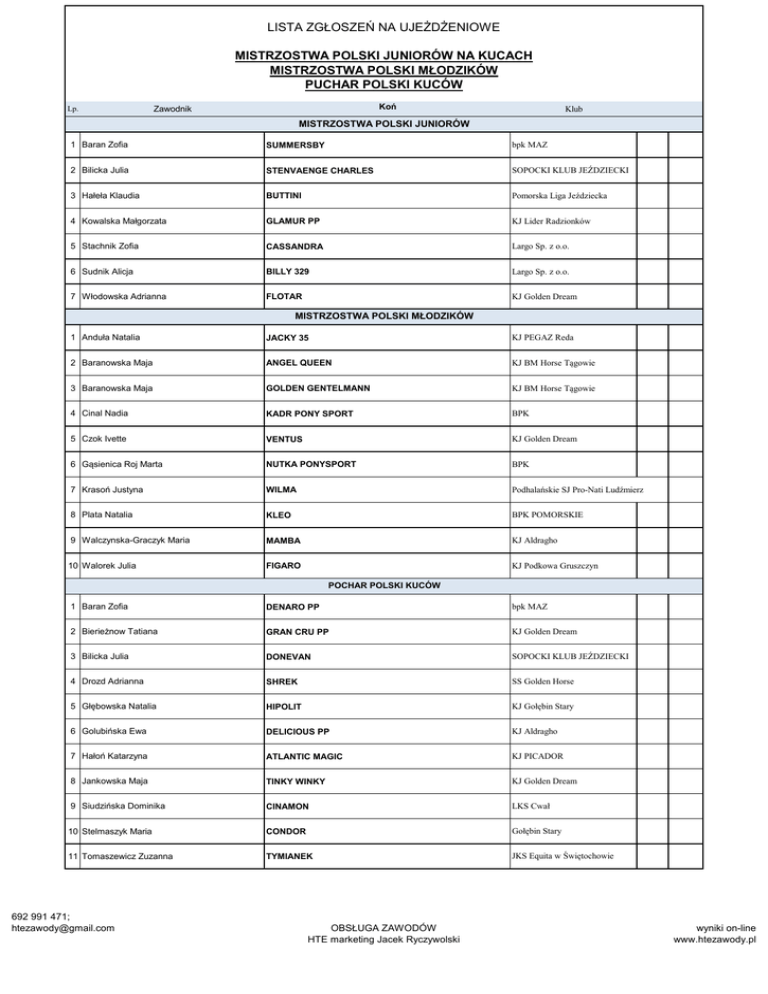 LISTA ZGŁOSZEŃ NA UJEŻDŻENIOWE MISTRZOSTWA POLSKI JUNIORÓW NA KUCACH MISTRZOSTWA POLSKI MŁODZIKÓW PUCHAR POLSKI KUCÓW Lp. Koń Zawodnik Klub MISTRZOSTWA POLSKI JUNIORÓW 1 Baran Zofia SUMMERSBY bpk MAZ 2 Bilicka Julia STENVAENGE CHARLES SOPOCKI KLUB JEŹDZIECKI 3 Hałeła Klaudia BUTTINI Pomorska Liga Jeździecka 4 Kowalska Małgorzata GLAMUR PP KJ Lider Radzionków 5 Stachnik Zofia CASSANDRA Largo Sp. z o.o. 6 Sudnik Alicja BILLY 329 Largo Sp. z o.o. 7 Włodowska Adrianna FLOTAR KJ Golden Dream MISTRZOSTWA POLSKI MŁODZIKÓW 1 Anduła Natalia JACKY 35 KJ PEGAZ Reda 2 Baranowska Maja ANGEL QUEEN KJ BM Horse Tągowie 3 Baranowska Maja GOLDEN GENTELMANN KJ BM Horse Tągowie 4 Cinal Nadia KADR PONY SPORT BPK 5 Czok Ivette VENTUS KJ Golden Dream 6 Gąsienica Roj Marta NUTKA PONYSPORT BPK 7 Krasoń Justyna WILMA Podhalańskie SJ Pro-Nati Ludźmierz 8 Plata Natalia KLEO BPK POMORSKIE 9 Walczynska-Graczyk Maria MAMBA KJ Aldragho 10 Walorek Julia FIGARO KJ Podkowa Gruszczyn POCHAR POLSKI KUCÓW 1 Baran Zofia DENARO PP bpk MAZ 2 Bierieżnow Tatiana GRAN CRU PP KJ Golden Dream 3 Bilicka Julia DONEVAN SOPOCKI KLUB JEŹDZIECKI 4 Drozd Adrianna SHREK SS Golden Horse 5 Głębowska Natalia HIPOLIT KJ Gołębin Stary 6 Golubińska Ewa DELICIOUS PP KJ Aldragho 7 Hałoń Katarzyna ATLANTIC MAGIC KJ PICADOR 8 Jankowska Maja TINKY WINKY KJ Golden Dream 9 Siudzińska Dominika CINAMON LKS Cwał 10 Stelmaszyk Maria CONDOR Gołębin Stary 11 Tomaszewicz Zuzanna TYMIANEK JKS Equita w Świętochowie 692 991 471; [email protected] OBSŁUGA ZAWODÓW HTE marketing Jacek Ryczywolski wyniki on-line www.htezawody.pl