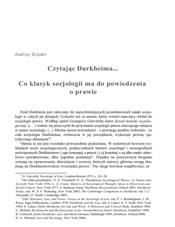 poświęconych Durkheimowi j ego koncepcj a prawa i j ej konotacj e są albo nader zdawkowo potraktowane, albo zupełnie pominięte2. Niejako na przeciwnym biegunie