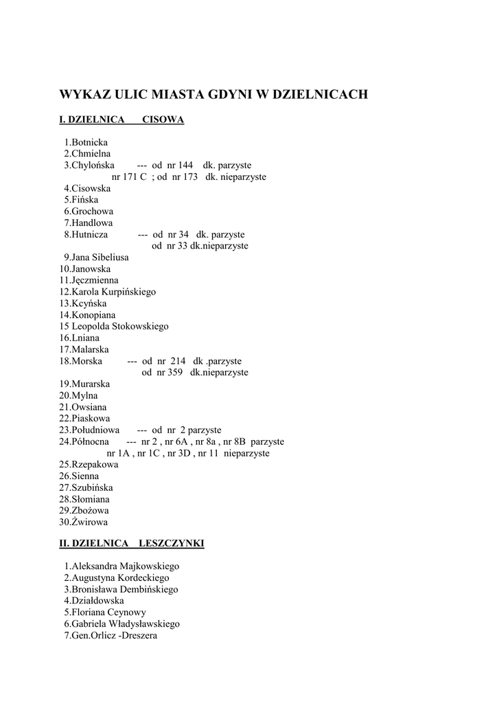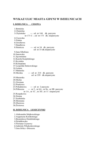 WYKAZ ULIC MIASTA GDYNI W DZIELNICACH I. DZIELNICA CISOWA 1.Botnicka 2.Chmielna 3.Chylońska --- od nr 144 dk. parzyste nr 171 C ; od nr 173 dk. nieparzyste 4.Cisowska 5.Fińska 6.Grochowa 7.Handlowa 8.Hutnicza --- od nr 34 dk. parzyste od nr 33 dk.nieparzyste 9.Jana Sibeliusa 10.Janowska 11.Jęczmienna 12.Karola Kurpińskiego 13.Kcyńska 14.Konopiana 15 Leopolda Stokowskiego 16.Lniana 17.Malarska 18.Morska --- od nr 214 dk .parzyste od nr 359 dk.nieparzyste 19.Murarska 20.Mylna 21.Owsiana 22.Piaskowa 23.Południowa --- od nr 2 parzyste 24.Północna --- nr 2 , nr 6A , nr 8a , nr 8B parzyste nr 1A , nr 1C , nr 3D , nr 11 nieparzyste 25.Rzepakowa 26.Sienna 27.Szubińska 28.Słomiana 29.Zbożowa 30.Żwirowa II. DZIELNICA LESZCZYNKI 1.Aleksandra Majkowskiego 2.Augustyna Kordeckiego 3.Bronisława Dembińskiego 4.Działdowska 5.Floriana Ceynowy 6.Gabriela Władysławskiego 7.Gen.Orlicz -Dreszera 8.Grzybowa 9.Hutnicza --- od nr 1 do nr 3 nieparzyste nr 2 parzyste 10.Jana Bażyńskiego 11.Jana Dantyszka 12.Jana Komierowskiego 13.Kalksztajnów 14.Kaspra Geskiego 15.Leszczynki 16.Modlińska 17.Morska --- od nr 114 do nr 184 parzyste od nr 143 do nr 263 nieparzyste 18.Mławska 19.Niemojewskiego 20.Opata Hackiego --- od nr 1 do nr 15 nieparzyste od nr 2 do nr 14 parzyste 21.Osada Kolejowa ---- od nr 1 do nr 13 nieparzyste od nr 2 do nr 10 parzyste 22.Pelplińska 23.Piotra Ściegiennego 24.Sambora ---- od nr 48 dk parzyste od nr 43 dk.nieparzyste 25.Smętowska 26.Stanisława Karnkowskiego 27.Stefana Ramułta 28.Stoigniewa 29.Widok 30.Wojciecha Drzymały 31.Zakręt do Oksywia 32.Zygmunta Działowskiego III. DZIELNICA GRABÓWEK 1.Antoniego Donimirskiego 2.Bp.Okoniewskiego 3.Falista 4.Filomatów 5.Gerarda Denhoffa 6.Grabowo 7.Henryka Rutkowskiego ---- zmiana nazwy ulicy na ul.Kazimierza Młodzianowskiego 8.Hozjusza 9.Hugo Kołłątaja 10.Iglasta 11.Ignacego Łyskowskiego 12.Jana Długosza 13.Joachima Lelewela 14.Kapitańska 15.Kmdr.Mieszkowskiego 16.Kmdr.Przybyszewskiego 17.Kmdr.Staniewicza 18.Komandorska 19.Krzysztofa Mrongowiusza 20.M.Skłodowskiej - Curie 21.Maurycego Beniowskiego 22.Montwiłła Mireckiego 23.Morska --- od nr 2 do nr 112 parzyste od nr 21 do nr 141 nieparzyste 24.Plac Neptuna 25.Podgórna 26.Podjazd 27.Profesora Demela 28.Sambora --- od nr 2 do nr 46 parzyste od nr 1 do nr 41 nieparzyste 29.Samuela Lindego 30.Stanisława Wąsowicza 31.Stefana Okrzei 32.Szymona Krofeya 33.Wojciecha Surmana 34.J acka Kaczmarskiego 35.Kazimierza Młodzianowskiego Gdynia dnia 2006-06-14 W związku z projektem uchwały Rady Miasta Gdyni dotyczącą zmian przebiegu granicy pomiędzy dzielnicami : GRABÓWEK a DZIAŁKI LESNE zachdzi konieczność wykreślenia z wykazu ulic w dzielnicy GRABÓWEK - ul.Morska nr 2, 4, 4a, ( pozostawić ul.Morska od 6 do 112 ) - ul.Podjazd IV. DZIELNICA ŚRÓDMIEŚCIE ( z PORTEM ) 1.A.Hryniewickiego 2.Aleja Jana Pawła II 3.Aleja 17 Grudnia 4.Aleja Marszałka Piłsudskiego --- od nr 52 dk parzyste 5.Aleja Solidarności 6.Antoniego Abrahama 7.Armii Krajowej 8.Bernarda Chrzanowskiego 9.Celna 10.Czechosłowacka 11.Dokerów 12..Dworcowa 13.Energetyków 14.Francuska 15.Gołębia 16.Hieronima Derdowskiego 17.I Armii Wojska Polskiego --- nr 1 dk nieparzyste od nr 2 do nr 4 parzyste 18.Indyjska 19.Jana Kilińskiego ---- od nr 2 dk parzyste od nr 7 dk nieparzyste 20.Jana z Kolna 21.Janka Wiśniewskiego 22.Jerzego Waszyngtona 23.Juliusza Słowackiego --- od nr 2 do 36 parzyste 24.Józfa Bema ---od nr 2 do nr 26 parzyste 25.Józefa Wybickiego 26.Karola Olgierda Borchardta 27.Kazimierza Pułaskiego 28.Kontenerowa 29.Ks.Prałata Hilarego Jastaka 30.10 -go Lutego 31.3-go Maja 32.Mściwoja 33.Obrońców Wybrzeża 34.Ofiar Piaśnicy 35.Osada Kolejowa ---- od nr 12 dk parzyste od nr 15 dk nieparzyste 36.Plac Grunwaldzki 37.Plac Gdynian Wysiedlonych 38.Plac Kaszubski 39.Plac Konstytucji 40.Polska 41.Portowa 42.Promowa 43.Romualda Trauguta 44.Rotterdamska 45.Rumuńska 46.Skwer im.Tajnego Hufca Harcerzy 47.Skwer Kościuszki 48.Skwer Witolda Gombrowicza 49.Starowiejska 50.Stefana Batorego 51.Stefana Żeromskiego 52.Szkolna 53.Śledziowa 54.Św.Piotra 55.Św.Wojciecha 56.Świętojańska --- od nr 2 do nr 122 parzyste od nr 1 do nr 111 nieparzyste 57.Tadeusza Wendy 58.Warsztatowa 59.Węglowa 60.Władysława IV --- od nr 1 do nr 61 nieparzyste od nr 2 do nr 58 parzyste 61.Wójta Radkego 62.Zgoda 63.Zygmunta Augusta 64.Zygmuntowska 65.Żwirki i Wigury 66.Węzeł Ofiar Grudnia 70 67.Bulwar Nadmorski Bulwar im.Feliksa Nowowiejskiego 68. Park Rady Europy ulice na terenie STOCZNI GDYNIA Ładowaczy , Spawalnicza , Transportowców , Szkolna , Składowa Nabrzeże Stanów Zjednoczonych Basen Inż.Wendy Basen Ministra Kwiatkowskiego Basen Prezydenta Basen Węglowy Basen Kontenerowy ( poprzednio Basen VIII ) Nabrzeże Czeskie ( poprzednio Nabrzeże Czechosłowackie ) Nabrzeże Słowackie ( poprzednio Nabrzeże Jugosłowiańskie ) W związku z uchwałą Rady Miasta Gdyni dotyczącą zmian przebiegu granicy pomiędzy dzielnicami : ŚRODMIEŚCIE z PORTEM a OKSYWIE zachodzi konieczność wykreślenia z wykazu ulic w dzielnicy ŚRODMIEŚCIE z PORTEM - ul.Inż.J.Śmidowicza od nr 2 dk parzyste V. DZIELNICA KAMIENNA GÓRA 1.Adama Asnyka 2.Adama Mickiewicza 3.Aleja Marszałka Piłsudskiego --- od nr 2 do nr 50 parzyste 4.Aleksandra Fredry 5.Augustyna Necla 6.Franciszka Sędzickiego 7.Henryka Siemiradzkiego 8.Henryka Sienkiewicza 9.I Armii Wojska Polskiego --- od nr 3 dk nieparzyste od nr 6 dk parzyste 10.Ignacego Krasickiego 11.Jana Kasprowicza 12.Jana Kilińskiego --od nr 1 do nr 5 nieparzyste 13.Jana Kochanowskiego 14.Julisza Słowackiego --- od nr 38 dk parzyste od nr 1 dk nieparzyste 15.Józefa Bema --- od nr 1 do nr 31 nieparzyste 16.Józefa Korzeniowskiego 17.Legionów --- od nr 1 do nr 21 nieparzyste od nr 2 do nr 20 parzyste 18.Mariacka 19.Piotra Skargi 20.Wacława Sieroszewskiego 21.Wita Stwosza 22.Zawiszy Czarnego 23. Danuty Baduszkowej - zmiana nazwy części ul.Zawiszy Czarnego VI. DZIELNICA ORŁOWO 1.Adwoka