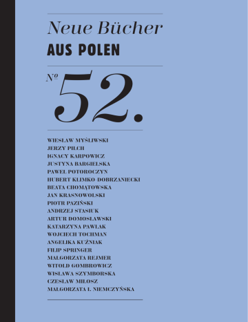 Neue Bücher AUS POLEN 52. N0 WIESŁAW MYŚLIWSKI JERZY PILCH IGNACY KARPOWICZ JUSTYNA BARGIELSKA PAWEŁ POTOROCZYN HUBERT KLIMKO-DOBRZANIECKI BEATA CHOMĄTOWSKA JAN KRASNOWOLSKI PIOTR PAZIŃSKI ANDRZEJ STASIUK ARTUR DOMOSŁAWSKI KATARZYNA PAWLAK WOJCIECH TOCHMAN ANGELIKA KUŹNIAK FILIP SPRINGER MAŁGORZATA REJMER WITOLD GOMBROWICZ WISŁAWA SZYMBORSKA CZESŁAW MIŁOSZ MAŁGORZATA I. NIEMCZYŃSKA DAS POLNISCHE BUCHINSTITUT INSTYTUT KSIĄŻKI Ul. Szczepańska 1 PL 31-011 Kraków Tel: +48 12 433 70 40 Fax: +48 12 429 38 29 [email protected] Warschauer Filiale des Polnischen Buchinstitutes Pałac Kultury i Nauki Pl. Defilad 1, IX piętro, pok. 911 PL 00-901 Warszawa Tel: +48 22 656 63 86, Fax: +48 22 656 63 89 [email protected] Warszawa 134, P.O. Box 39 ADRESSEN DER VERLAGE UND AGENTEN AGENCE LITTÉRAIRE PIERRE ASTIER & ASSOCIÉS GRUPA WYDAWNICZA FOKSAL THE WYLIE AGENCY 142, rue de Clignancourt 750018 Paris T:+33 (0)1 53 28 14 52 [email protected] www.pierreastier.com ul. Foksal 17 00-372 Warszawa T:+48 22 826 08 82, +48 22 828 98 08 F: +48 22 380 18 01 [email protected] www.gwfoksal.pl, www.wab.com.pl 17 Bedford Square London WC1B 3JA T:+44 020 7908 5900 F: +44 020 7908 5901 [email protected] www.wylieagency.com AGORA KARAKTER WIELKA LITERA ul. Czerska 8/10 00-732 Warszawa T:+48 22 555 60 00, +48 22 555 60 01 F: +48 22 555 48 50, +48 22 555 47 80 [email protected] www.agora.pl ul. Kochanowskiego 19/1 31–127 Kraków [email protected] www.karakter.pl ul. Kosiarzy 37/53 02-953 Warszawa T:+48 22 252 59 25 [email protected] www.wielkalitera.pl CZARNE KORPORACJA HA!ART WYDAWNICTWO LITERACKIE Wołowiec 11 38-307 Sękowa T:+48 18 351 00 70, +48 502 318 711 F: + 48 18 351 58 93 [email protected] www.czarne.com.pl Pl. Szczepański 3a 31-011 Kraków T/F: +48 12 422 81 98 [email protected] www.ha.art.pl ul. Długa 1 31-147 Kraków T:+48 12 619 27 40 F: +48 12 422 54 23 [email protected] www.wydawnictwoliterackie.pl DOM WYDAWNICZY PWN NISZA ZNAK ul. Gottlieba Daimlera 2 02-460 Warszawa T:+48 22 695 45 55 F: +48 22 695 45 51 [email protected] www.dwpwn.pl T:+48 22 617 89 61 [email protected] www.nisza-wydawnictwo.pl ul. Kościuszki 37 30-105 Kraków T:+48 12 619 95 01 F: +48 12 619 95 02 [email protected] www.znak.com.pl FUNDACJA WISŁAWY SZYMBORSKIEJ POLISHRIGHTS.COM Pl. Wszystkich Świętych 2 31-004 Kraków T:+48 12 429 41 09 [email protected] www. szymborska.org.pl ul. Kochanowskiego 19/1 31-127 Kraków [email protected] www.polishrights.com AUSGEWÄHLTE PROGRAMME DES BUCHINSTITUTS DAS ÜBERSETZUNGSPROGRAMM ©POLAND ÜBERSETZERKOLLEGIUM Ziel des Programms ist es, Übersetzungen polnischer Literatur zu fördern und ihre Präsenz auf den ausländischen Buchmärkten zu stärken. Das Programm umfasst insbesondere Belletristik und Essayistik, Kinder- und Jugendliteratur, Sachbücher. Das Programm wird vom Buchinstitut in Zusammenarbeit mit dem Verein Villa Decius und der Jagiellonen-Universität durchgeführt. Es richtet sich an Übersetzer polnischer Literatur, die Belletristik, Essayistik, Dokumentarliteratur oder geisteswissenschaftliche Literatur im weitesten Sinne übertragen und bietet ein- bis dreimonatige Stipendienaufenthalte in Krakau. Angebote können von allen Verlagen abgegeben werden, die ein in polnischer Sprache geschriebenes Buch in eine fremde Sprache übersetzen lassen und herausgeben wollen. Im Rahmen des Programms können u.a. folgende Kosten finanziert werden: TRANSATLANTIK •bis zu 100 % der Kosten des Lizenzerwerbs •bis zu 100 % der Übersetzungskosten eines Werkes aus dem Polnischen. Transatlantik ist der alljährlich von dem Buchinstitut vergebene Preis für Persönlichkeiten, die sich für die Verbreitung der polnischen Literatur im Ausland einsetzen. Der Preis, dotiert mit 10.000 Euro, kann u. A. an Übersetzer, Verleger, Literaturkritiker, Polonisten verliehen werden. SAMPLE TRANSLATIONS ©POLAND KONTAKT: Das Ziel dieses Programms – es richtet sich an Übersetzer polnischer Literatur – ist es, im Ausland für polnische Literatur zu werben, indem man Übersetzer ermutigt, polnische Bücher ausländischen Verlegern zu präsentieren. Bezahlt werden 20 Seiten einer Probeübersetzung. Die Bewerbungsformulare beider Programme können postalisch beim Buchinstitut in Krakau angefordert, oder von der Website www.bookinstitute.pl heruntergeladen werden. Das Polnische Buchinstitut ul. Szczepańska 1 PL 31-011 Kraków E-mail: [email protected] Phone: +48 12 433 70 40 Fax: +48 12 429 38 29 www.bookinstitute.pl Direktor des Polnischen Buchinstituts: Grzegorz Gauden WIESŁAW MYŚLIWSKI ENDSPIEL Wiesław Myśliwski (geb. 1932), Schriftsteller, Essayist, Dramaturg. Er debütierte 1967 mit dem Roman „Nagi sad”, drei Jahre später veröffentlichte er „Pałac”. Er ist der Autor eines der wichtigsten polnischen Nachkriegsromane „Kamień na kamieniu“ (1984). Er veröffentlicht selten, meistens im Abstand von 10 Jahren. Er erhielt zweimal den renommierten Nike-Preis – für die Romane „Widnokrąg“ (1996) und „Traktat o łuskaniu fasoli“ (2006). In seinem Roman „Endspiel” verwendet der Schriftsteller erneut seine bevorzugte narrative Form: den sich über den ganzen Text erstreckenden inneren Monolog eines namenlosen Protagonisten, der am Ende seines Lebens mit seiner Biographie abzurechnen versucht. In diesen weitläufigen Monolog schneiden sich Reminiszenzen hinein, Bilder und Szenen aus der Vergangenheit, die ohne Rücksicht auf die Chronologie eingebaut werden. Diese zerstreuten Stücke sind meist dramatisiert, in dialogischer Form. Ein Novum ist das Auftauchen eines Liebesmotivs. Der Monolog wird ergänzt durch Briefe, die die alte Jugendliebe des Protagonisten, Maria, ihm durch die Jahrzehnte geschrieben hat. Eigentümlich ist, dass der Protagonist des „Endspiels“ auf keinen dieser Briefe geantwortet hat – obwohl sie alle voller Emotionen und Leidenschaft waren, obwohl ihm Maria ewige Liebe geschworen hat. Während der Lektüre entdeckt der Leser, dass die