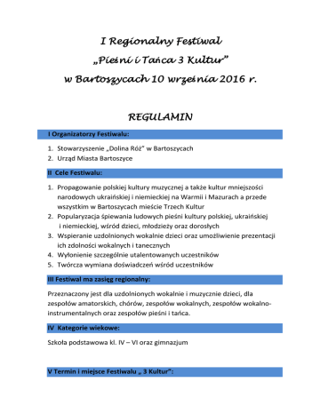I Regionalny Festiwal „Pieśni i Tańca 3 Kultur” w Bartoszycach 10 września 2016 r. REGULAMIN I Organizatorzy Festiwalu: 1. Stowarzyszenie „Dolina Róż” w Bartoszycach 2. Urząd Miasta Bartoszyce II Cele Festiwalu: 1. Propagowanie polskiej kultury muzycznej a także kultur mniejszości narodowych ukraińskiej i niemieckiej na Warmii i Mazurach a przede wszystkim w Bartoszycach mieście Trzech Kultur 2. Popularyzacja śpiewania ludowych pieśni kultury polskiej, ukraińskiej i niemieckiej, wśród dzieci, młodzieży oraz dorosłych 3. Wspieranie uzdolnionych wokalnie dzieci oraz umożliwienie prezentacji ich zdolności wokalnych i tanecznych 4. Wyłonienie szczególnie utalentowanych uczestników 5. Twórcza wymiana doświadczeń wśród uczestników III Festiwal ma zasięg regionalny: Przeznaczony jest dla uzdolnionych wokalnie i muzycznie dzieci, dla zespołów amatorskich, chórów, zespołów wokalnych, zespołów wokalnoinstrumentalnych oraz zespołów pieśni i tańca. IV Kategorie wiekowe: Szkoła podstawowa kl. IV – VI oraz gimnazjum V Termin i miejsce Festiwalu „ 3 Kultur”: 1. Festiwal odbędzie się dnia 10 września 2016 roku o godz. 14.00, na terenie sportowo-rekreacyjnym przy ulicy Korczaka w Bartoszycach, z okazji V Sportowo- Rekreacyjnego Pikniku Rodzinnego z cyklu „ DNI OSADNIKA”. W festiwalu obowiązuje procedura wypełnienia karty zgłoszenia uczestnictwa. Kwalifikacja uczestników odbędzie się na podstawie poprawnie wypełnionej karty zgłoszenia udziału w festiwalu. 2. Zgłoszenia przyjmowane będą do dnia 27 sierpnia 2016 roku poprzez: Osobisty kontakt z jednostką organizującą konkurs ( adres Urząd Miasta Bartoszyce, ul. Boh. Monte Cassino 1) – Wydział Kultury Sportu Współpracy i Rozwoju pokój nr 26, tel. 089 762 98 03, Kontakt drogą internetową ( e-mail: [email protected]) Kontakt telefoniczny ( osoba odpowiedzialna za organizację): - Danuta Zubrycka nr tel. 603 707 333 - Bogdan Pisarek nr tel. 512 999 326 Lub pocztą - Stowarzyszenie „Dolina Róż” ul. Poniatowskiego 10/1 11-200 Bartoszyce. Formularz karty zgłoszenia zamieszczony jest na oficjalnej stronie Urzędu Miasta Bartoszyce www.bartoszyce.pl . VI Jury konkursu Jury stanowić będą specjaliści w poszczególnych dziedzinach kultury, znawcy kultury danych mniejszości oraz zaproszeni goście. VII Repertuar Pieśni, tańce ludowe i obrzędowe charakterystyczne dla kultury polskiej, ukraińskiej i niemieckiej. VIII Kryteria oceny Jury powołane przez organizatorów wyłoni zwycięzców festiwalu na podstawie: 1. Możliwości wykonawczych uczestników ( umiejętności wokalnych: intonacja, emisja głosu, muzykalność, dykcja oraz tanecznych: kroki , postawa, rama) 2. Doboru repertuaru 3. Zachowania cech danej kultury 4. Ogólnego wyrazu artystycznego i scenicznego ( kultura wykonania, interpretacja wokalno sceniczna itp.) 5. Uczestnicy mogą przygotować po trzy utwory , które nie mogą przekroczyć 20 minut 6. Podczas prezentacji scenicznej stroje ludowe lub kostiumy sceniczne ludowe nie są obowiązkowe, jednak wykonawcy występujący w stroju ludowym lub kostiumie będą oceniani pod względem poprawności i prawidłowości użytego stroju lub kostiumu. IX Nagrody i wyróżnienia Z posiedzeń Jury festiwalu zostaną sporządzone protokoły z listami zwycięzców, nagrodzonych i wyróżnionych. Organizatorzy festiwalu podejmują decyzję o podziale i formie nagród w ramach przewidzianych na ten cel środków. Wśród nagród, o które powalczą uczestnicy festiwalu znajdują się: spływ rzeką Łyną w miejscowości Stopki wraz z cateringiem ( grill lub ognisko ), sesja fotograficzna dla zespołu oraz nagranie teledysku, filmiku reklamowego. Wszyscy uczestnicy festiwalu otrzymują dyplomy. Istnieje możliwość przyznania przez organizatorów nagród pozaregulaminowych. X Przepisy ogólne. 1. Kolejność prezentacji uczestników ustalają organizatorzy i Jury 2. Organizatorzy zastrzegają prawo do użytkowania zdjęć w celach promocyjnych oraz do wykorzystania zdjęć i nagrań zrobionych podczas festiwalu przez lokalne lub ogólnopolskie media. Za publikację w/w materiałów uczestnicy nie otrzymują wynagrodzenia tytułem praw autorskich. 3. Organizatorzy zastrzegają prawo do zmian w regulaminie, jeżeli nastąpi konieczność oraz prawo ostatecznej interpretacji powyższego regulaminu. 4. Sprawy nieujęte w regulaminie rozstrzygają organizatorzy festiwalu w porozumieniu z Jury. 5. Uczestnicy i opiekunowie we własnym zakresie pokrywają wszelkie koszty podróży oraz ubezpieczenia na czas trwania festiwalu. Organizatorzy zapewniają wyżywienie dla wszystkich uczestników festiwalu.