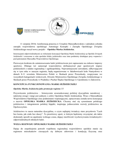 11 sierpnia 2016r. konferencją prasową w Urzędzie Marszałkowskim z udziałem członka zarządu województwa opolskiego Antoniego Konopki i Zarządu Opolskiego Związku Jeździeckiego ruszył nowy projekt - Opolska Marka Jeździecka. Instytucjami odpowiedzialnymi za wdrażanie koncepcji Opolskiej Marki Jeździeckiej są Opolski Związek Jeździecki i zrzeszone w nim opolskie kluby jeździeckie oraz inne podmioty działające przy wsparciu i pod patronatem Marszałka Województwa Opolskiego. Pierwszym krokiem do zainteresowania ludzi jeździectwem jest zapraszanie na ciekawe imprezy sportowe. Dlatego też samorząd województwa dofinansował pięć sportowych imprez jeździeckich o randze regionalnej i ogólnopolskiej. Najważniejszymi zawodami, odbywającymi się w tym roku w naszym regionie, będą organizowane w Jakubowicach koło Namysłowa w dniach 8-11 września Mistrzostwa Polski w Skokach przez Przeszkody, rozgrywane we wszystkich kategoriach wiekowych, Otwarte Mistrzostwa Opolskiego Związku Jeździeckiego w Skokach przez Przeszkody w Prudniku i Puchar Śląska Opolskiego w Ujeżdżeniu w Zakrzowie. KONCEPCJA FUNKCJONOWANIA MARKI JEŹDZIECKIEJ Opolska Marka Jeździecka jako promocja regionu !!! Przywrócenie jeździectwu – historycznie uwarunkowanej polskiej dyscyplinie narodowej – należytej uwagi i rangi jest jednym z celów Opolskiej Marki Jeździeckiej. Wraz z Marszałkiem Województwa Opolskiego oraz podmiotami wspierającymi, opracowana została nowa koncepcja o nazwie OPOLSKA MARKA JEŹDZIECKA. Chcemy stać się synonimem polskiego jeździectwa i integratorem polskiej hippiki, inspirując jednocześnie rozwój jeździectwa na Opolszczyźnie. Jeździectwo to nasza naturalna dyscyplina, o czym najlepiej świadczy stare przysłowie "Lach bez konia, jak ciało bez duszy". To prestiżowy sport, w którym będziemy zwyciężać, ale także doskonały sposób na spędzanie wolnego czasu, dający możliwość wychowywania świadomych i odpowiedzialnych młodych ludzi. WIZJA ROZWOJU OPOLSKIEJ MARKI JEŹDZIECKIEJ Dążąc do zaspokojenia potrzeb wspólnoty regionalnej województwo opolskie stanie się regionem mieszkańców cieszących się dobrym zdrowiem i kondycją fizyczną oraz zadowolonych z wysokiej jakości usług sportowych. Będzie to możliwe dzięki kreacji takich cech regionu jak: wysoka świadomość wartości aktywności fizycznej wśród mieszkańców i powszechne uprawianie sportu; wysoka jakość bazy sportowej i usługi sportowe powszechnie dostępne dla mieszkańców niezależnie od wieku, płci, zamożności, stopnia sprawności fizycznej bądź innych cech; dobrze rozwinięte i dostępne szkolnictwo sportowe kreujące gwiazdy sportu na szczeblu krajowym i międzynarodowym; cykliczne organizowanie wydarzeń sportowych rangi krajowej i międzynarodowej; zapewnienie zrównoważonego rozwoju, godzącego wymiar gospodarczy sportu i rekreacji z wymiarem społecznym, dbałością o środowisko i ład przestrzenny. Dla realizacji koncepcji Opolskiej Marki Jeździeckiej w 2016r. wyznaczona została lista przedsięwzięć regionalnych, zdefiniowanych jako grupa projektów, zadań i inicjatyw za pomocą których możliwe będzie osiągnięcie celów strategicznych Opolskiej Marki Jeździeckiej. Wskazane przedsięwzięcia będą miały istotne znaczenie dla rozwoju sportu w Województwie Opolskim. CYKL ZAWODÓW: 1. Ogólnopolskie Zawody Dzieci i Młodzieży - Jakubowice 12-14.08.2016 2. Finał Pucharu Śląska Opolskiego przeszkody - Prudnik. 20-21.08.2016 3. Mistrzostwa Polski Jakubowice 4. Otwarte Mistrzostwa Opolskiego Związku Jeździeckiego Prudnik 24-25.09.2016 5. Puchar Śląska Opolskiego w Ujeżdżeniu - Zakrzów 4-6.11.2016 w skokach przez w Skokach przez Przeszkody - 8-11.09.2016 Na opolskich hipodromach regularnie rozgrywane są zawody jeździeckie zróżnicowanej rangi: począwszy od regionalnych, przez ogólnopolskie jak i najbardziej prestiżowe na świecie zawody międzynarodowe. Są to zawody w skokach przez przeszkody, w ujeżdżeniu oraz we wszechstronnym konkursie konia wierzchowego. Chcemy by nasze zawody i imprezy przyciągnęły dużą publiczność, będą reklamowane w mediach: w telewizji, radiu, prasie i w Internecie. Odbiór promocji naszych partnerów i sponsorów jest więc bardzo szeroki. REKREACJA KONNA Rekreację i turystykę konną można uprawiać indywidualnie i zbiorowo. Samotny turysta może wybierać sobie czas, trasę oraz to, co go najbardziej interesuje. Jazda konna w grupie wymaga zdyscyplinowania od wszystkich jej uczestników. W Polsce uprawiane są następujące formy rekreacji i turystyki konnej: wczasy w siodle i obozy jeździeckie, turystyka rowerowo - konna, turystyka samochodowo - konna, rajdy konne, konne imprezy na orientację, przemarsze i podróże konne, biegi myśliwskie, turnieje konne, gry i popisy sprawności jeździeckich, skjöring i ski-skjöring, plenery artystyczne, zajęcia i obozy jeździeckie dla dzieci i młodzieży z dysfunkcjami ruchu i zaburzeniami psychicznymi. PRZEMYSŁ KOŃSKI Przemysł koński to w bogatych krajach Unii Europejskiej dobrze rozwinięty i dochodowy biznes. To nie tylko sama hodowla koni, ale także organizowanie wczasów w siodle oraz produkcja sprzętu i akcesoriów jeździeckich. Konie nie tylko od wieków służą pracą człowiekowi, ale same mogą stwarzać miejsca pracy dzięki ich wszechstronnemu wykorzystywaniu przez człowieka. W Unii Europejskiej i na świecie już dawno obliczono, że 3–4 konie dają jedno miejsce pracy. Największa ich liczba jest użytkowana wierzchowo i zaprzęgowo przez ludzi, dla których kontakt z koniem jest terapią i wytchnieniem. Wbrew powszechnemu u nas przekonaniu, nie są to wcale ludzie bardzo zamożni. Nieraz cała rodzina utrzymuje swojego konia w pobliżu miasta i dojeżdża do niego w wolnym czasie. A dalej, co kto może: starsi zaprzęgają konia do bryczki, a młodsi zażywają przejażdżek wierzchem. Kto ma z tego zyski? Rodz