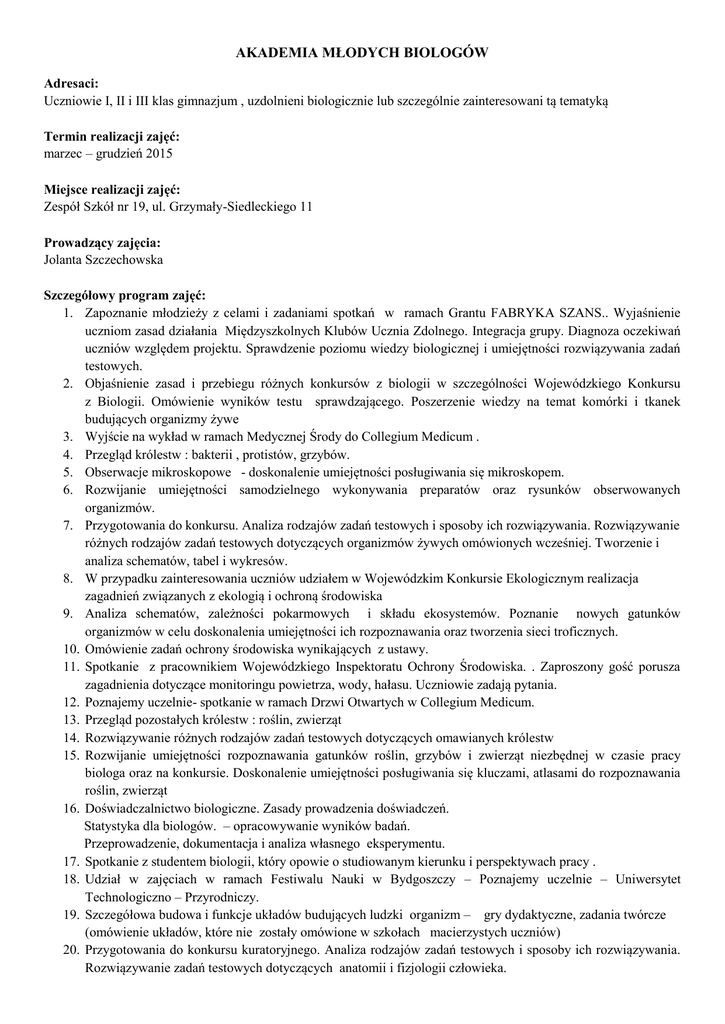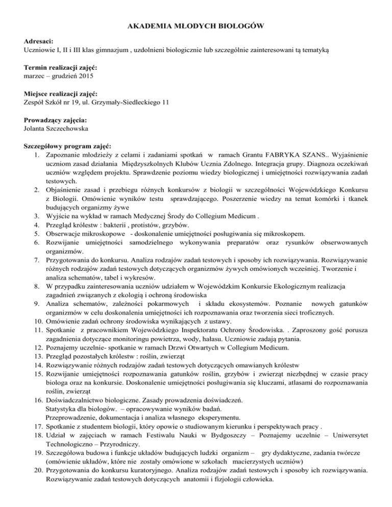 AKADEMIA MŁODYCH BIOLOGÓW Adresaci: Uczniowie I, II i III klas gimnazjum , uzdolnieni biologicznie lub szczególnie zainteresowani tą tematyką Termin realizacji zajęć: marzec – grudzień 2015 Miejsce realizacji zajęć: Zespół Szkół nr 19, ul. Grzymały-Siedleckiego 11 Prowadzący zajęcia: Jolanta Szczechowska Szczegółowy program zajęć: 1. Zapoznanie młodzieży z celami i zadaniami spotkań w ramach Grantu FABRYKA SZANS.. Wyjaśnienie uczniom zasad działania Międzyszkolnych Klubów Ucznia Zdolnego. Integracja grupy. Diagnoza oczekiwań uczniów względem projektu. Sprawdzenie poziomu wiedzy biologicznej i umiejętności rozwiązywania zadań testowych. 2. Objaśnienie zasad i przebiegu różnych konkursów z biologii w szczególności Wojewódzkiego Konkursu z Biologii. Omówienie wyników testu sprawdzającego. Poszerzenie wiedzy na temat komórki i tkanek budujących organizmy żywe 3. Wyjście na wykład w ramach Medycznej Środy do Collegium Medicum . 4. Przegląd królestw : bakterii , protistów, grzybów. 5. Obserwacje mikroskopowe - doskonalenie umiejętności posługiwania się mikroskopem. 6. Rozwijanie umiejętności samodzielnego wykonywania preparatów oraz rysunków obserwowanych organizmów. 7. Przygotowania do konkursu. Analiza rodzajów zadań testowych i sposoby ich rozwiązywania. Rozwiązywanie różnych rodzajów zadań testowych dotyczących organizmów żywych omówionych wcześniej. Tworzenie i analiza schematów, tabel i wykresów. 8. W przypadku zainteresowania uczniów udziałem w Wojewódzkim Konkursie Ekologicznym realizacja zagadnień związanych z ekologią i ochroną środowiska 9. Analiza schematów, zależności pokarmowych i składu ekosystemów. Poznanie nowych gatunków organizmów w celu doskonalenia umiejętności ich rozpoznawania oraz tworzenia sieci troficznych. 10. Omówienie zadań ochrony środowiska wynikających z ustawy. 11. Spotkanie z pracownikiem Wojewódzkiego Inspektoratu Ochrony Środowiska. . Zaproszony gość porusza zagadnienia dotyczące monitoringu powietrza, wody, hałasu. Uczniowie zadają pytania. 12. Poznajemy uczelnie- spotkanie w ramach Drzwi Otwartych w Collegium Medicum. 13. Przegląd pozostałych królestw : roślin, zwierząt 14. Rozwiązywanie różnych rodzajów zadań testowych dotyczących omawianych królestw 15. Rozwijanie umiejętności rozpoznawania gatunków roślin, grzybów i zwierząt niezbędnej w czasie pracy biologa oraz na konkursie. Doskonalenie umiejętności posługiwania się kluczami, atlasami do rozpoznawania roślin, zwierząt 16. Doświadczalnictwo biologiczne. Zasady prowadzenia doświadczeń. Statystyka dla biologów. – opracowywanie wyników badań. Przeprowadzenie, dokumentacja i analiza własnego eksperymentu. 17. Spotkanie z studentem biologii, który opowie o studiowanym kierunku i perspektywach pracy . 18. Udział w zajęciach w ramach Festiwalu Nauki w Bydgoszczy – Poznajemy uczelnie – Uniwersytet Technologiczno – Przyrodniczy. 19. Szczegółowa budowa i funkcje układów budujących ludzki organizm – gry dydaktyczne, zadania twórcze (omówienie układów, które nie zostały omówione w szkołach macierzystych uczniów) 20. Przygotowania do konkursu kuratoryjnego. Analiza rodzajów zadań testowych i sposoby ich rozwiązywania. Rozwiązywanie zadań testowych dotyczących anatomii i fizjologii człowieka. 21. Powtórzenie i utrwalenie budowy i funkcji układów ludzkich. 22. Spotkanie z studentem medycyny, który przybliży młodzieży model studiów medycznych . 23. Poznajemy uczelnie – Drzwi Otwarte na Wydziale Biologii i Ochrony Środowiska (wycieczka do Instytutu Biologii i Muzeum Przyrodniczego w Toruniu) 24. Przygotowania do konkursu. Analiza rodzajów zadań testowych i sposoby ich rozwiązywania. Rozwiązywanie zadań testowych dotyczących chorób człowieka oraz profilaktyki zdrowotnej. 25. Gry dydaktyczne utrwalające poznaną wiedzę ( stworzone przez uczniów) 26. Utrwalenie wiedzy dotyczącej królestw świata żywego – rozwiązywanie zadań testowych. Analiza najczęściej popełnianych błędów . 27. Rozwiązywanie zadań z genetyki człowieka. 28. Omówienie zagadnień wyszczególnionych w regulaminie wojewódzkiego konkursu kuratoryjnego z biologii. Rozwiązywanie różnorodnych zadań konkursowych . 29. Spotkanie z Dietetykiem, który poruszy problem otyłości i niezdrowego odchudzania się. 30. Przygotowania do konkursu. Analiza rodzajów zadań testowych i sposoby ich rozwiązywania. Rozwiązywanie różnych rodzajów zadań testowych dotyczących omawianych wcześniej zagadnień ( komórka, tkanki, królestwa świata żywego, anatomia i fizjologia człowieka, genetyka, ekologia, ochrona środowiska) 31. Spotkanie z mgr kosmetologii, która przedstawi kosmetologię jako wielospecjalistyczną dziedzinę medycyny wymagającą połączenia wiedzy z zakresu dermatologii, endokrynologii, dietetyki.