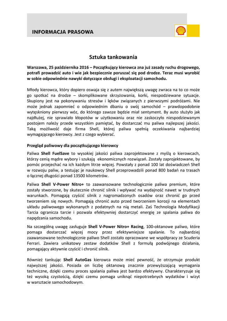 Sztuka tankowania Warszawa, 25 października 2016 – Początkujący kierowca zna już zasady ruchu drogowego, potrafi prowadzić auto i wie jak bezpiecznie poruszać się pod drodze. Teraz musi wyrobić w sobie odpowiednie nawyki dotyczące obsługi i eksploatacji samochodu. Młody kierowca, który dopiero oswaja się z autem największą uwagę zwraca na to co może go spotkać na drodze – skomplikowane skrzyżowania, korki, niespodziewane sytuacje. Skupiony jest na pokonywaniu stresów i lęków związanych z pierwszymi podróżami. Nie może jednak zapomnieć o odpowiednim dbaniu o swój samochód – prawdopodobnie wytęskniony pierwszy wóz, do którego zawsze będzie miał sentyment. By auto służyło jak najdłużej, nie sprawiało kłopotów w użytkowaniu oraz nie zaskoczyło niespodziewanym postojem należy przede wszystkim pamiętać, by dostarczać mu paliwa najlepszej jakości. Taką możliwość daje firma Shell, której paliwa spełnią oczekiwania najbardziej wymagającego kierowcy. Jest z czego wybierać. Przegląd paliwowy dla początkującego kierowcy Paliwa Shell FuelSave to wysokiej jakości paliwa zaprojektowane z myślą o kierowcach, którzy cenią mądre wybory i szukają ekonomicznych rozwiązań. Zostały zaprojektowane, by pomóc przejechać na ich każdym litrze więcej. Powstały z ponad 100 lat doświadczeń Shell w rozwoju paliw, a testując je naukowcy Shell przeprowadzili ponad 800 badań na trasach o łącznej długości ponad 13500 kilometrów. Paliwa Shell V-Power Nitro+ to zaawansowane technologicznie paliwa premium, które zostały stworzone, by skutecznie chronić silnik i wpływać na wydajność nawet w trudnych warunkach. Pomagają czyścić silnik z nagromadzonych osadów oraz chronić go przed tworzeniem się nowych. Pomagają chronić auto przed tworzeniem korozji na elementach układu paliwowego wykonanych z podatnych na nią metali. Zaś Technologia Modyfikacji Tarcia ogranicza tarcie i pozwala efektywniej dostarczyć energię ze spalania paliwa do napędzania samochodu. Na szczególną uwagę zasługuje Shell V-Power Nitro+ Racing, 100-oktanowe paliwo, które pomaga dostarczać więcej mocy przez efektywniejsze spalanie. To najbardziej zaawansowane technologicznie paliwo Shell zostało opracowane we współpracy ze Scuderia Ferrari. Zawiera unikatowy zestaw dodatków Shell z formułą podwójnego działania, pomagający aktywnie czyścić i chronić silnik. Również tankując Shell AutoGas kierowca może mieć pewność, że otrzymuje produkt najwyższej jakości. Posiada on liczbę oktanową znacznie przewyższającą wymagania techniczne, dzięki czemu proces spalania paliwa jest bardzo efektywny. Charakteryzuje się też wysoką czystością, dzięki czemu pomaga uniknąć niepotrzebnych wydatków i wizyt w warsztacie samochodowym. Które paliwo więc wybrać? Pomocą w wyborze paliwa oraz tankowaniu służą pracownicy stacji paliwowych Shell. Na terenie całego kraju znajduje się ich prawie 400. Pracownik stacji może też pomóc sprawdzić podstawowe parametry auta, wybrać i uzupełnić płyn do spryskiwaczy, a nawet sprawdzić poziom oleju. To cenne wsparcie szczególnie dla początkujących kierowców, którzy wiele muszą się jeszcze nauczyć o swoich autach. Fachowe wsparcie oraz wiedzę nie tylko o poprawnej, zgodnej z przepisami jeździe, ale też o technicznych aspektach samochodu, właściwej konserwacji i eksploatacji przyszli kierowcy mogą uzyskać wybierając kurs jazdy w Akademii Auto Świat, którego partnerem jest Shell Polska. Jest to nowoczesna sieć szkół jazdy zrzeszona pod marką Auto Świat – najpoczytniejszego magazynu motoryzacyjnego w Polsce. Placówki Akademii Auto Świat wyznaczają nowe standardy na rynku, oferując wysoki poziom szkolenia zarówno z zakresu techniki jazdy, jak i metodyki nauczania, psychologii i komunikacji. *** O Shell Grupa Shell to największy na świecie koncern energetyczny wytwarzający najwyższej jakości produkty oraz oferujący kompleksową gamę usług związanych z dostarczaniem paliw i energii, a także rozwiązań dla klientów biznesowych i indywidualnych. W Polsce Shell działa od 1992 roku. Aktualnie Shell Polska Sp. z o.o. to ponad 400 stacji oferujących kierowcom najwyższej jakości paliwa, olej napędowy oraz gaz LPG. Na stacjach paliwowych Shell klienci mogą korzystać z usług myjni samochodowych, z oferty punktów gastronomicznych oraz robić zakupy w sklepie z pełnym asortymentem produktów spożywczych i motoryzacyjnych. Wszyscy klienci tankujący paliwo Shell mogą uczestniczyć w programie lojalnościowym – Shell ClubSmart. Ponadto wśród produktów motoryzacyjnych Shell dysponuje szeroką gamą najwyższej jakości olejów i smarów, a do klientów biznesowych skierowana jest oferta kart paliwowych euroShell. Od roku 2013 na polskim rynku działa także Shell Aviation, światowy lider w sprzedaży produktów dla lotnictwa, a od 2006 roku w Zabierzowie pod Krakowem - Shell Business Operations, jedno z największych centrów usług dla biznesu w Polsce. więcej na www.shell.pl Dodatkowe informacje: Katarzyna Czechowska, [email protected], tel. 512-361-542 Justyna Goraj, [email protected], tel. 606-670-064