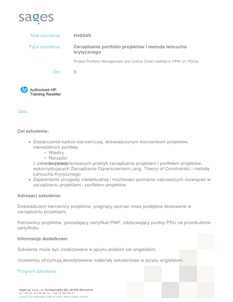 Kod szkolenia: Tytuł szkolenia: H4S54S Zarządzanie portfolio projektów i metoda łańcucha krytycznego Project Portfolio Management and Critical Chain method in PPM (21 PDUs) Dni: 3 Opis: Cel szkolenia: Dostarczenie kadrze kierowniczej, doświadczonym kierownikom projektów, menedżerom portfela: Wiedzy Narzędzi z zakresu Inspiracji zaawansowanych praktyk zarządzania projektem i portfelem projektów, wykorzystujących Zarządzanie Ograniczeniami (ang. Theory of Constraints) i metodę Łańcucha Krytycznego Zapewnienie przygody intelektualnej i możliwości poznania najnowszych rozwiązań w zarządzaniu projektami i portfelem projektów Adresaci szkolenia: Doświadczeni kierownicy projektów, pragnący poznać nowe podejścia stosowane w zarządzaniu projektami. Kierownicy projektów, posiadający certyfikat PMP, zdobywający punkty PDU na przedłużenie certyfikatu. Informacje dodatkowe: Szkolenie może być zrealizowane w języku polskim lub angielskim. Uczestnicy otrzymują akredytowane materiały szkoleniowe w języku angielskim. Program szkolenia: 1. System zarządzania projektami w firmie: zarządzanie projektem, zarządzanie portfelem projektów i zarządzanie programem Projekty jako narzędzie realizacji strategii firmy System Zarzadzania Projektami – kompleksowe podejście do zarządzaniaprojektami i zarządzania portfelem projektów w firmie Zarządzanie portfelem projektów – wprowadzenie Procesy zarządzania portfelem projektów: praktyka i standard PMI Tradycyjne podejścia budowy portfela projektów Dobór projektów do portfela wg Zarządzania Ograniczeniami 2. Budowa harmonogramu projektu metodą Łańcucha Krytycznego Podstawowe koncepcje Zarządzania Ograniczeniami (ang. Theory Of Constraints) Deadline management i zła wielozadaniowość Prawo Parkinsona i Syndrom Studenta w zarządzaniu projektem Kroki budowy harmonogramu projektu metodą Łańcucha Krytycznego Typy buforów projektowych Metody określania wielkości buforów i ich analiza Bufor kosztowy 3. Optymalizacja harmonogramu projektu Budowa sieci projektu metodą Network Building Process Metody skracania harmonogramu Metody optymalizacji harmonogramu zgodnie z 5-cioma krokami usprawniania wg Zarządzania Ograniczeniami Praktyka optymalizacji/skracania harmonogramu 4. Planowanie portfela projektów Eksploatacja ograniczenia – podstawa budowy harmonogramu projektów w portfelu Zła wielozadaniowość w praktyce i jej wpływ na realizację projektów Budowa harmonogramu projektów w portfelu Bufor zdolności i jego znaczenie praktyczne Zasady zarządzania projektami wg TOC 5. Zarządzanie realizacją projektu w środowisku jedno-projektowym za pomocą zarządzania buforami Generalne zasady zarządzania realizacją projektu w metodzie Łańcucha Krytycznego Zarządzanie buforami – teoria i praktyka Działania kierownika projektu Plan naprawy bufora (ang. Buffer recovery plan) – podstawowe narzędzie kierownika projektu Jak powinien pracować zespół projektowy Zasada sztafety Priorytety operacyjne dla wykonawców pracujących w projekcie 6. Realizacja oraz kontrola projektów za pomocą zarządzanie buforami w środowisku wielo-projektowym: Operacyjne zarządzanie portfelem projektów w środowisku wieloprojektowym Zarządzanie portfelem projektów Zarządzanie projektem Zarządzanie zadaniami projektowymi Decydenci i decyzje w systemie wielo-projektowym (w portfelu projektów) 7. Zachowania głównych udziałowców projektów i portfela projektów Psychologia zachowań Aktorzy zarządzania portfelem projektów i projektem oraz ich zachowania Metody eliminacji „złej wielo-zadaniowości” 8. System zarządzania projektami w praktyce Doświadczenia firm stosujących podejście TOC oraz metodę Łańcucha Krytycznego Instytucjonalne rozwiązania zarządzania projektami i portfelem projektów Rada ds. Portfela Menadżer portfela projektów Rola PMO w zarządzaniu portfelem projektów System Zarzadzania Projektami – kompleksowe podejście do zarządzania projektami i zarządzania portfelem projektów w firmie Budowanie Systemu Zarządzania Projektami w firmie Powered by TCPDF (www.tcpdf.org)