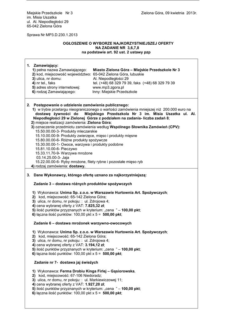 Miejskie Przedszkole Nr 3 im. Misia Uszatka ul. Al. Niepodległości 29 65-042 Zielona Góra Zielona Góra, 09 kwietnia 2013r. Sprawa Nr MP3.D.230.1.2013 OGŁOSZENIE O WYBORZE NAJKORZYSTNIEJSZEJ OFERTY NA ZADANIE NR 3,6,7,8 na podstawie art. 92 ust. 2 ustawy pzp 1. Zamawiający: 1) pełna nazwa Zamawiającego: 2) kod, miejscowość województwo: 3) ulica, nr domu: 4) nr tel., faks 5) adres strony internetowej: 6) rodzaj Zamawiającego: Miasto Zielona Góra – Miejskie Przedszkole Nr 3 65-042 Zielona Góra, lubuskie Al. Niepodległości 29 tel. (+48) 68 329 79 39, faks (+48) 68 329 79 39 www.mp3.zgora.pl Inny: Miejskie Przedszkole 2. Postępowanie o udzielenie zamówienia publicznego: 1) w trybie przetargu nieograniczonego o wartości zamówienia mniejszej niż 200.000 euro na dostawę żywności do Miejskiego Przedszkola Nr 3 im. Misia Uszatka ul. Al. Niepodległości 29 w Zielonej Górze z podziałem na zadania- liczba zadań 8; 2) miejsce realizacji zamówienia: Zielona Góra; 3) oznaczenie przedmiotu zamówienia według Wspólnego Słownika Zamówień (CPV): 15.50.00.00-3- Produkty mleczarskie 15.10.00.00-9- Produkty zwierzęce, mięso i produkty mięsne 15.80.00.00-6- Różne produkty spożywcze 15.30.00.00-1- Owoce, warzywa i produkty podobne 15.81.10.00-6- Pieczywo 15.33.11.70-9- Warzywa mrożone 03.14.25.00-3- Jaja 15.22.00.00-6- Ryby mrożone, filety rybne i pozostałe mięso ryb 4) rodzaj zamówienia: dostawy. 3. Dane Wykonawcy, którego ofertę uznano za najkorzystniejszą: Zadanie 3 – dostawa różnych produktów spożywczych 1) Wykonawca: Unima Sp. z.o.o. w Warszawie Hurtownia Art. Spożywczych; 2) kod, miejscowość: 65-142 Zielona Góra; 3) ulica, nr domu, nr pokoju: : ul. Zdrojowa 4; 4) cena wybranej oferty z VAT: 7.825,32 zł; 5) ilość punktów przyznanych w kryterium: „cena ” – 100,00 pkt; 6) łączna ilość punktów: 100,00 pkt x 5 = 500,00 pkt; Zadanie 6 – dostawa mrożonek warzywno-owocowych 1) Wykonawca: Unima Sp. z.o.o. w Warszawie Hurtownia Art. Spożywczych; 2) kod, miejscowość: 65-142 Zielona Góra; 3) ulica, nr domu, nr pokoju: : ul. Zdrojowa 4; 4) cena wybranej oferty z VAT: 3.194,12 zł; 5) ilość punktów przyznanych w kryterium: „cena ” – 100,00 pkt; 6) łączna ilość punktów: 100,00 pkt x 5 = 500,00 pkt; Zadanie nr 7- dostawa jaj świeżych 1) Wykonawca: Ferma Drobiu Kinga Firlej – Gąsiorowska, 2) kod, miejscowość: 67-106 Niedoradz; 3) ulica, nr domu, nr pokoju: : ul. Markiewiczowej 11; 4) cena wybranej oferty z VAT: 1.927,20 zł; 5) ilość punktów przyznanych w kryterium: „cena ” – 100,00 pkt; 6) łączna ilość punktów: 100,00 pkt x 5 = 500,00 pkt; Zadanie 8 – dostawa ryb mrożonych, filety rybne i pozostałe mięso ryb 1) Wykonawca: Unima Sp. z.o.o. w Warszawie Hurtownia Art. Spożywczych; 2) kod, miejscowość: 65-142 Zielona Góra; 3) ulica, nr domu, nr pokoju: : ul. Zdrojowa 4; 4) cena wybranej oferty z VAT: 5.056,67 zł; 5) ilość punktów przyznanych w kryterium: „cena ” – 100,00 pkt; 6) łączna ilość punktów: 100,00 pkt x 5 = 500,00 pkt; 4. Uzasadnienie wyboru Wykonawcy: Dla zadania 3 Wykonawca spełnia warunki udziału w postępowaniu, a jego oferta jest zgodna z ustawą z dnia 29 stycznia 2004 r. Prawo zamówień publicznych (tekst jednolity Dz. U. z 2010 r. Nr 113, poz. 759 z późn. zm.) i Specyfikacją Istotnych Warunków Zamówienia oraz jest najkorzystniejsza i otrzymała najwyższą liczbę punktów, tj. 500,00 (100,00x5) w oparciu o kryterium „cena-100%”. dla Zadania 6 Wykonawca spełnia warunki udziału w postępowaniu, a jego oferta jest zgodna z ustawą z dnia 29 stycznia 2004 r. Prawo zamówień publicznych (tekst jednolity Dz. U. z 2010 r. Nr 113, poz. 759 z późn. zm.) i Specyfikacją Istotnych Warunków Zamówienia oraz jest najkorzystniejsza i otrzymała najwyższą liczbę punktów, tj. 500,00 (100,00x5) w oparciu o kryterium „cena-100%”. dla Zadania 7 Wykonawca spełnia warunki udziału w postępowaniu, a jego oferta jest zgodna z ustawą z dnia 29 stycznia 2004 r. Prawo zamówień publicznych (tekst jednolity Dz. U. z 2010 r. Nr 113, poz. 759 z późn. zm.) i Specyfikacją Istotnych Warunków Zamówienia oraz jest najkorzystniejsza i otrzymała najwyższą liczbę punktów, tj. 500,00 (100,00x5) w oparciu o kryterium „cena-100%”. dla Zadania 8 Wykonawca spełnia warunki udziału w postępowaniu, a jego oferta jest zgodna z ustawą z dnia 29 stycznia 2004 r. Prawo zamówień publicznych (tekst jednolity Dz. U. z 2010 r. Nr 113, poz. 759 z późn. zm.) i Specyfikacją Istotnych Warunków Zamówienia oraz jest najkorzystniejsza i otrzymała najwyższą liczbę punktów, tj. 500,00 (100,00x5) w oparciu o kryterium „cena-100%”. 5. Dane o Wykonawcach, którzy złożyli oferty: Zadanie 3 1) oferta nr 2 złożona przez: - Wykonawca : „DAGA” Zakład Handlu Art. Spoż. i Przemysłowymi, Jan Siepko, Elżbieta Siepko; - kod, miejscowość: 65-001 Zielona Góra; - ulica, nr domu, nr pokoju: ul. Jedności 23/5; - ilość punktów przyznanych w kryterium: „cena ” – 85,15 pkt; - łączna ilość punktów: 85,15 pkt x 5 = 425,75 pkt; 2) oferta nr 3 złożona przez: - Wykonawca: Przedsiębiorstwo Handlowe „JONEX” Katarzyna Jońska; - kod, miejscowość: 65-730 Zielona Góra; - ulica, nr domu, nr pokoju: ul. Elektronowa 2; - ilość punktów przyznanych w kryterium:„cena ” – 75,09 pkt; - łączna ilość punktów: 75,09 pkt x 5 = 375,45 pkt; - 3) oferta nr 4 złożona przez: Wykonawca : UNIMA Sp. z o.o. w Warszawie Hurtownia Art. Spożywczych; kod, miejscowość: 65 – 142 Zielona Góra ; ulica, nr domu, nr pokoju: ul. Zdrojowa 4; ilość punktów przyznanych w kryterium: „cena ” – 100,00 pkt; łączna ilość punktów: 100,00 pkt x 5 = 500,00 pkt; Zadanie 6 1) oferta nr 1 złożona przez: - Wykonawca: IceQB spółka z ograniczoną odpowiedzialnością; - kod, miejscowość: 65-419 Zielona Góra; 2 - ulica, nr domu, nr pokoju: ul. gen. J. Sowińskiego