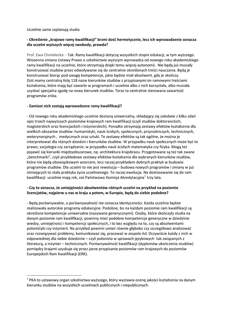 Uczelnie same zaplanują studia - Określenie „krajowe ramy kwalifikacji” brzmi dość hermetycznie, lecz ich wprowadzenie oznacza dla uczelni wyższych więcej swobody, prawda? Prof. Ewa Chmielecka: - Tak. Ramy kwalifikacji dotyczą wszystkich stopni edukacji, w tym wyższego. Wiosenna zmiana Ustawy Prawo o szkolnictwie wyższym wprowadza od nowego roku akademickiego ramy kwalifikacji na uczelnie, które otrzymają dzięki temu więcej autonomii. Nie będą już musiały konstruować studiów przez odwoływanie się do centralnie określonych treści nauczania. Będą je konstruować biorąc pod uwagę kompetencje, jakie będzie miał absolwent, gdy je skończy. Dziś mamy centralną listę 118 nazw kierunków studiów z przypisanymi im ramowymi treściami kształcenia, które mają być zawarte w programach i uczelnia albo z nich korzystała, albo musiała uzyskać specjalna zgodę na nowy kierunek studiów. Teraz ta centralnie sterowana zawartość programów znika. - Zamiast nich zostają wprowadzone ramy kwalifikacji? - Od nowego roku akademickiego uczelnie dostaną uniwersalny, składający się zaledwie z kilku zdań opis trzech najwyższych poziomów krajowych ram kwalifikacji (czyli studiów doktoranckich, magisterskich oraz licencjackich i inżynierskich). Ponadto otrzymają zestawy efektów kształcenia dla wielkich obszarów studiów: humanistyki, nauk ścisłych, społecznych, przyrodniczych, technicznych, weterynaryjnych , medycznych oraz sztuki. Te zestawy efektów są tak ogólne, że można je interpretować dla różnych dziedzin i kierunków studiów. W przypadku nauk społecznych może być to prawo, socjologia czy zarządzanie; w przypadku nauk ścisłych matematyka czy fizyka. Mogą też pojawić się kierunki międzyobszarowe, np. architektura krajobrazu. Przygotowane są też tak zwane „benchmarki”, czyli przykładowe zestawy efektów kształcenia dla wybranych kierunków studiów, które nie będą obowiązkowym wzorcem, lecz raczej przykładem dobrych praktyk w budowie programów studiów. Dla uczelni to nie jest rewolucja – budowa nowych programów i zmiany w już istniejących to stała praktyka życia uczelnianego. To raczej ewolucja. Na dostosowanie się do ram kwalifikacji uczelnie mają rok, zaś Państwowa Komisja Akredytacyjna 1 trzy lata. - Czy to oznacza, że umiejętności absolwentów różnych uczelni na przykład na poziomie licencjatów, najpierw u nas w kraju a potem, w Europie, będą do siebie podobne? - Będą porównywalne, a porównywalność nie oznacza identyczności. Każda uczelnia będzie realizowała autorskie programy edukacyjne. Podobne, bo na każdym poziomie ram kwalifikacji są określone kompetencje uniwersalne (nazywane generycznymi). Osoby, które skończyły studia na danym poziomie ram kwalifikacji, powinny mieć podobne kompetencje generyczne w dziedzinie wiedzy, umiejętności i kompetencji społecznych, i to bez względu na to, czy są absolwentami polonistyki czy inżynierii. Na przykład powinni umieć równie głęboko czy szczegółowo analizować oraz rozwiązywać problemy, komunikować się, pracować w zespole itd. Oczywiście każdy z nich w odpowiedniej dla siebie dziedzinie – czyli polonista w sprawach językowych lub związanych z literaturą, a inżynier – technicznych. Porównywalność kwalifikacji (dyplomów ukończenia studiów) pomiędzy krajami uzyskuje się przez jasne przypisanie poziomów ram krajowych do poziomów Europejskich Ram Kwalifikacji (ERK). 1 PKA to ustawowy organ szkolnictwa wyższego, który wystawia ocenę jakości kształcenia na danym kierunku studiów na wszystkich uczelniach publicznych i niepublicznych. - Europejskie Ramy Kwalifikacji wprowadziły osiem poziomów kształcenia. My też mamy taki podział. Dość nietypowy jest poziom piąty, bo czwarty kończy się maturą, a szósty to studia licencjackie i inżynieryjne. Czym jest poziom piąty? - To poziom szczególny, w Polsce zdefiniowany tylko przez właściwy dla niego opis wymagań właśnie co do wiedzy, umiejętności i kompetencji. W wielu krajach istnieją krótkie 3- 4 semestralne studia, które umożliwiają absolwentom albo dalsze uczenie się, albo zakończenie edukacji. My nie mamy takich „krótkich cykli” kształcenia i młodzież po maturze wybiera studia licencjackie. Część kończy je z trudem, nie uzyskując kompetencji, jakie powinni mieć absolwenci szkół licencjackich, czyli szóstego poziomu. Jeśli więc zechcemy w pełni dostosowywać nasz poziom szósty ram krajowych do poziomu szóstego, europejskiego, to być może okaże się, że część programów prowadzonych jako licencjaty będzie na poziomie piątym. - Jak będę mogła sprawdzić czy szkoła, studia, jakie wybieram zapewnią mi kompetencje z piątego, czy z szóstego poziomu? - Numer poziomu będzie w przyszłości zapisany na wszystkich dyplomach, świadectwach czy certyfikatach. Powstała europejska platforma cyfrowa 2, na której są zamieszczane informacje o ramach krajowych i ich relacjach do ERK. Każdy kraj, także Polska, będzie miał także platformę krajową z informacjami o wszystkich programach studiów. - Nauczyciele akademiccy niekiedy mówią, że teraz na studiach drugiego stopnia, magisterskich, mają studentów o bardzo różnych umiejętnościach i wiedzy, ponieważ są oni absolwentami różnych kierunków studiów I stopnia. Trudno prowadzi się zajęcia przy takim zróżnicowaniu poziomu wiedzy i kompetencji. Czy wprowadzenie krajowych ram kształcenia pomoże złagodzić ten problem? - To są problemy, które wynikają z niezrozumienia dwustopniowej struktury studiów wyższych. Oczywiście ramy kwalifikacji pomogą, ale to uczelnia ustala zasady rekrutacji i powinna robić to racjonalnie – przyjmować na studia magisterskie tylko takich kandydatów, którzy rokują ich pomyślne ukończenie. Pamiętajmy, że każda uczelnia ma prawo studentowi, który przechodzi z jednego kierunku na drugi, na p