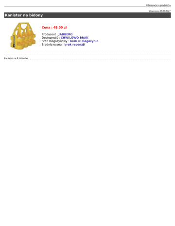 Informacje o produkcie Utworzono 02-03-2017 Kanister na bidony Cena : 49,00 zł Producent : JADBERG Dostępność : CHWILOWO BRAK Stan magazynowy : brak w magazynie Średnia ocena : brak recenzji Kanister na 8 bidonów.