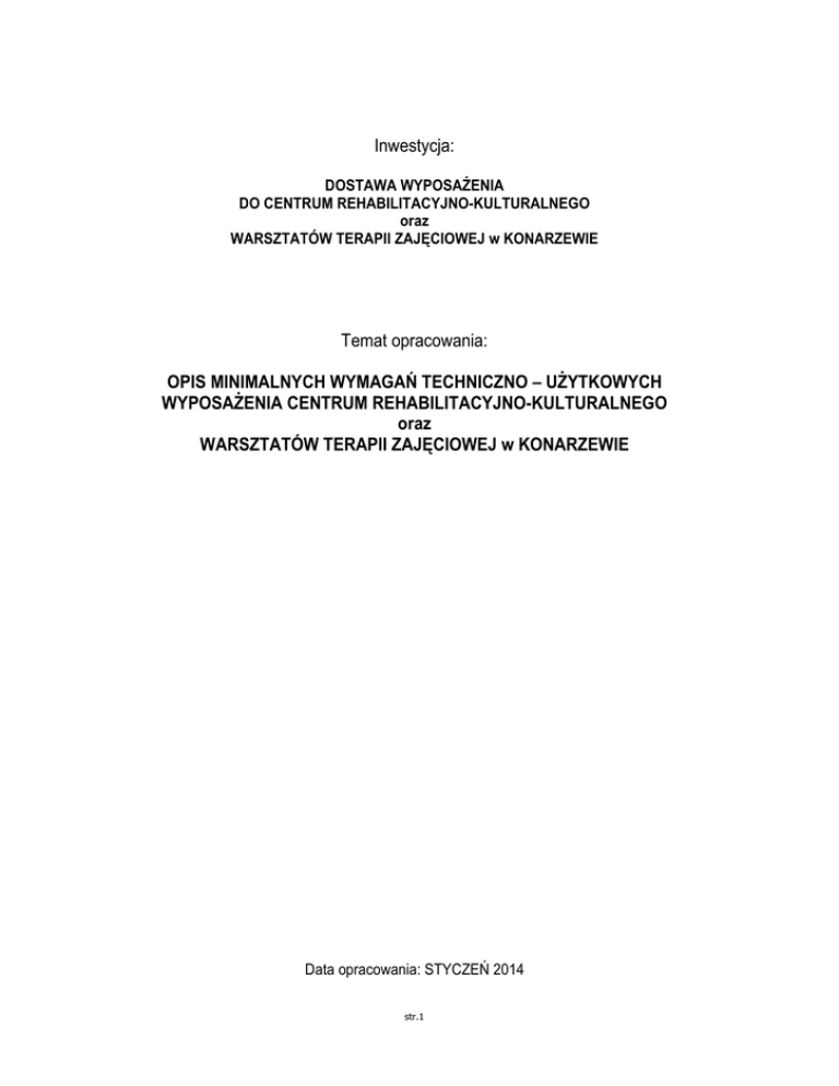 Inwestycja: DOSTAWA WYPOSAŻENIA DO CENTRUM REHABILITACYJNO-KULTURALNEGO oraz WARSZTATÓW TERAPII ZAJĘCIOWEJ w KONARZEWIE Temat opracowania: OPIS MINIMALNYCH WYMAGAŃ TECHNICZNO – UŻYTKOWYCH WYPOSAŻENIA CENTRUM REHABILITACYJNO-KULTURALNEGO oraz WARSZTATÓW TERAPII ZAJĘCIOWEJ w KONARZEWIE Data opracowania: STYCZEŃ 2014 str.1 OPIS MINIMALNYCH WYMAGAŃ TECHNICZNO-UŻYTKOWYCH WYPOSAŻENIA Poniższy opis przedstawia minimalne wymagania dotyczące wyposażenia meblowego. Zamawiający dopuszcza możliwość składania ofert równoważnych do określonego w opisie przedmiotu zamówienia. Jednak oferta równoważna musi spełniać wymagania techniczne, eksploatacyjne i jakościowe ujęte w SIWZ. Zaproponowany asortyment nie może odbiegać jakością, standardem, parametrami technicznymi od założonych przez Zamawiającego. W przypadku złożenia oferty równoważnej Wykonawca wskaże różnice, które jednoznacznie zostaną opisane w kartach katalogowych zaoferowanych produktów wraz z podaniem nazwy handlowej i nazwy producenta. Zgodnie z art. 30 ust. 5 ustawy Prawo zamówień publicznych Wykonawca, który powołuje się na rozwiązania równoważne jest obowiązany wykazać, że oferowane dostawy spełniają wymagania określone przez Zamawiającego. Na etapie realizacji należy umożliwić weryfikację dostarczanych mebli i w przypadku stwierdzenia niezgodności, możliwe jest wstrzymanie całej dostawy wraz z nakazem natychmiastowej wymiany na koszt i odpowiedzialność Wykonawcy. Ewentualne wskazane nazwy produktów oraz ich producenci mają na celu jedynie przybliżyć wymagania, których nie można było opisać przy pomocy dostatecznie dokładnych i zrozumiałych określeń. Zamawiający dopuszcza tolerancje wymiarów w zakresie +/- 3%. Wszystkie zaproponowane rozwiązania muszą być systemowe, seryjnie produkowane. Pod pojęciem systemowe Zamawiający rozumie meble, które można łączyć ze sobą w różnych konfiguracjach oraz pozwalające w przyszłości na rozbudowę. Zamawiający wymaga, aby wykonawca wraz z ofertą załączył karty katalogowe, foldery przedstawiające proponowane systemy – dotyczy biurek, stołów, szaf, foteli i krzeseł. W celu potwierdzenia, że dostarczone produkty odpowiadają określonym normom lub specyfikacjom technicznym, do oferty należy załączyć: 1. Wszystkie wymienione w opisie certyfikaty i atesty. Certyfikaty mają być wystawione przez niezależną jednostkę uprawnioną do wydawania tego rodzaju zaświadczeń. Dokumenty te mają być opisane w sposób nie budzący wątpliwości do jakich mebli są dedykowane (nazwa widniejąca na certyfikacie musi być nazwą systemu w przedstawionym katalogu, folderze). 2. Producenci oferowanych przez Wykonawcę mebli powinni posiadać certyfikat systemu zarządzania jakością ISO 9001:2008 oraz wdrożony (ważny) certyfikat systemu zarządzania środowiskiem zgodny z normą ISO 14001. 3. W przypadku mebli płytowych do oferty należy dołączyć próbki płyt . 4. W przypadku tkanin tapicerskich należy do oferty dołączyć próbnik tkanin oraz atesty potwierdzające skład oraz wymaganą wytrzymałość tkanin na ścieranie. Atesty te mają być wystawione przez niezależną jednostkę uprawnioną do wydawania tego rodzaju dokumentów. Próbnik i atesty mają być opisane w sposób nie budzący wątpliwości do jakich mebli są dedykowane. 5. W celu potwierdzenia spełnienia podanych wymogów do każdego mebla należy przedstawić minimum jedną, osobną kartę katalogową (formatu minimum A4), na której będzie przedstawiony proponowany mebel. Karta katalogowa musi zawierać nazwę mebla lub nazwę użytego systemu meblowego, nazwę producenta mebla, rysunek lub zdjęcie proponowanego mebla (rozmiar zdjęcia pozwalający dostrzec szczegóły – optymalnie rozmiar zdjęcia A5), wymiary oraz szczegóły techniczne mebla pozwalające zweryfikować czy proponowany mebel spełnia wymagania projektu. str. 2 OPIS MINIMALNYCH WYMAGAŃ TECHNICZNO-UŻYTKOWYCH WYPOSAŻENIA OPIS NR 1 BIURKO B1 Produkt fabrycznie nowy. Wymiary: szerokość 1400 mm, głębokość 800 mm, wysokość regulowana 735 mm Blat biurka z płyty wiórowej trzywarstwowej o grubości 25 mm pokrytej obustronnie melaminą, klasa higieniczności E1. Blat oklejony z czterech stron obrzeżem PCV o grubości 2mm w kolorze płyty. Płyta EGGER lub równoważna. Oferent zobowiązany jest załączyć próbki płyty w minimum 6 kolorach, celem wyboru i akceptacji przez Zamawiającego. Stelaż biurka metalowy spawano-skręcany, złożony z czterech nóg kwadratowych stalowych o przekroju 50/50 mm, połączonych na stałe poprzeczką w ramkę. Ramki połączone ze sobą przy pomocy metalowych podłużnic o przekroju 30/30 mm, poprowadzonych wzdłuż dłuższej krawędzi pod powierzchnią blatu. Stelaż metalowy dwukrotnie malowany proszkowo na kolor metalik: lakier proszkowy + lakier bezbarwny nadający połysk, o minimalnej grubości powłoki lakierniczej 130µm oraz o zwiększonej odporności na ścieranie – 700-800 obrotów pasków ściernych CS-10 do warstwy kryjącej farby, bez jej naruszenia. Stelaż wyposażony w stopki do regulacji poziomowania. Wymagane atesty i dokumenty, które należy złożyć wraz z ofertą: 1. Biurka muszą posiadać protokół oceny właściwości ergonomiczno-fizjologicznych z wynikiem pozytywnym zgodnie z PN-EN-527-1 (2004) Meble biurowe. Stoły robocze i biurka. Część 1: Wymiary oraz zgodnie z Rozporządzeniem MPiPS z 1 grudnia 1998r. w sprawie bhp na stanowiskach pracy wyposażonych w monitory ekranowe (DZ.U. Nr 148, poz. 973). Protokół musi być wydany przez jednostkę certyfikującą. Nie dopuszcza się oświadczenia producenta. 2. Biurka muszą posiadać opinię stwierdzającą zgodność z wymaganymi normami : PN-EN-527-1:2004 PN-EN-5272:2004 PN 527-3:2004 – w zakresie wymiarów, stateczności, wymagań wytrzymałościowych i bezpiecznych rozwiązań konstrukcyjnych – popartą dokumentem wyda