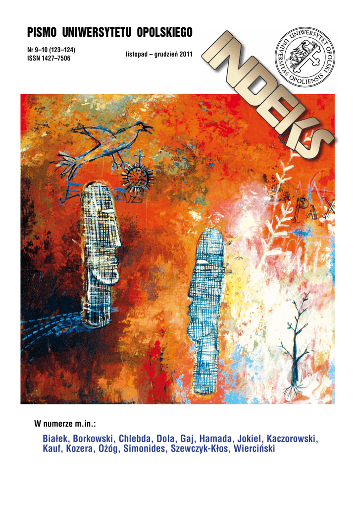 PISMO UNIWERSYTETU OPOLSKIEGO Nr 9–10 (123–124) ISSN 1427–7506 listopad – grudzień 2011 W numerze m.in.: Białek, Borkowski, Chlebda, Dola, Gaj, Hamada, Jokiel, Kaczorowski, Kauf, Kozera, Ożóg, Simonides, Szewczyk-Kłos, Wierciński 2 INDEKS nr 9–10 (123–124) Spis treści Kronika uniwersytecka. . . . . . . . . . . . . . . . . . . . . . . . . . . . . . . . 3 Nauka bez granic (UO w konsorcjum uczelni Euroregionu Beskidy) . . . . . . . . . . . . . . . . . . . . . . . . . . . . . . . . . . . . . 11 Rektor UO ekspertem NCN. . . . . . . . . . . . . . . . . . . . . . . . . . . . 11 Nagrodzeni w Los Angeles. . . . . . . . . . . . . . . . . . . . . . . . . . . . 12 Prof. S. Gajda laureatem Nagrody im. K. Miarki. . . . . . . . . . . . 12 Skromny człowiek, wielki autorytet (laudacja I. Jokiel) . . . . . . 13 Pożegnania, wyróżnienia. . . . . . . . . . . . . . . . . . . . . . . . . . . . . 15 Dzień kobiet w listopadzie (otwarcie Coll. Chemicum). . . . . . . 16 Prostolinijnie o polimerach (rozmowa z dr hab. Marzeną Białek). . . . . . . . . . . . . . . . . . . . . . . . . . . . . . . . . . . . . . . 19 Na swoim (otwarcie Coll. Biotechnologicum) . . . . . . . . . . . . . 22 Między książkami (Danuta Szewczyk-Kłos o jubileuszu 60-lecia Biblioteki Głównej UO). . . . . . . . . . . . . . . . . . . . 23 Kościół nie lubi kobiet? (rozmowa z ks. prof. Tadeuszem Dolą). . . . . . . . . . . . . . . . . . . . . . . . . . . . . . . . . . . . . . . . 25 Z pierzyną w szeroki świat (Dorota Simonides). . . . . . . . . . . . 29 Niezdarna Ślązaczka wędruje na Parnas (rozmowa z dr hab. Beatą Gaj) . . . . . . . . . . . . . . . . . . . . 35 Kąp się i poć się (Włodzimierz Kaczorowski). . . . . . . . . . . . . . 39 Czy marszałek jest prezesem? (rozmowa z dr hab. Sabiną Kauf). . . . . . . . . . . . . . . . . . . . . . . . . . . . . . . . . . . . . . . . 45 Weselne zawieszenie broni (Krzysztof Borkowski). . . . . . . . . . 47 Za szybkie pisanie – 19 (Adam Wierciński) . . . . . . . . . . . . . . . 49 Ryzykowny wybryk młodości (Andrzej Hamada). . . . . . . . . . . 53 Nieznany list Ksantypy (Bartłomiej Kozera) . . . . . . . . . . . . . . . 55 Miniatury na niepogodę (Małgorzata Andrzejak-Nowara). . . . . 56 Koledzy (rozmowa Bogdana Madziewicza z Leszkiem Kurzeją). . . . . . . . . . . . . . . . . . . . . . . . . . . . . . . . . . . . . . 57 Odeszli: Przemysław Rostropowicz. . . . . . . . . . . . . . . . . . . . . 60 Wiersze Przemysława Rostropowicza . . . . . . . . . . . . . . . . . . . 62 „Botanika”, czyli trójwymiar bez okularów (Kazimierz S. Ożóg) . . . . . . . . . . . . . . . . . . . . . . . . . . . . . . . . . . . . . 63 Kulturalnia (Studenckie Centrum Kultury po dwóch miesiącach). . . . . . . . . . . . . . . . . . . . . . . . . . . . . . . . . . . 66 Jubileuszowe, opolskie święto lalek (Andrzej Strużyna). . . . . . 67 Za granicą, a jak w domu. . . . . . . . . . . . . . . . . . . . . . . . . . . . . 70 Długa lekcja tolerancji (Jerzy Duda, Franciszek Minor) . . . . . . 71 Unisono na wiele języków (Wojciech Chlebda) . . . . . . . . . . . . 74 Żywa dyskusja w „martwym” języku (Beata Gaj o Międzynarodowym Kongresie Łacinników) . . . . . . . . . 75 Opolskie Dni Kultury Średniowiecznej (Marcin Böhm). . . . . . . 77 I Dni Kultury Nowożytnej Opole-Oława (Magdalena Figurniak) . . . . . . . . . . . . . . . . . . . . . . . . . . . . . . . . . . . . 78 Zakłady karne w nauce i praktyce (Agnieszka Rodak, Piotr Sasin). . . . . . . . . . . . . . . . . . . . . . . . . . . . . . . . . . . 80 Jubileuszowe muzykowanie (Marian Biliński o festiwalu im. Ignaza Reimanna). . . . . . . . . . . . . . . . . . . . . . . . . . . 82 Zapomniany holokaust (Joanna Pawlików, Marcin Nowara) . . 83 Z prac Senatu UO. . . . . . . . . . . . . . . . . . . . . . . . . . . . . . . . . . . 85 Sprawozdanie z działalności UO w roku akadem. 2010/2011. . 89 Nowości wydawnicze. . . . . . . . . . . . . . . . . . . . . . . . . . . . . . . 119 Rysunek na okładce: Pax (akryl na płótnie), Józef Chyży, absolwent Instytutu Sztuki UO (2008), wyróżniony na tegorocznym Salonie Jesiennym Nagrodą ZPAP Okręgu Opolskiego oraz Nagrodą Galerii BP Atelier w Opolu (www.jozefchyzy.pl) Radosnych Świąt Bożego Narodzenia oraz samych szczęśliwych zdarzeń w nadchodzącym Nowym Roku całej Wspólnocie Akademickiej życzą władze Uniwersytetu Opolskiego i redakcja „Indeksu” Indeks. Pismo UO Wydawca: Uniwersytet Opolski. Adres redakcji: 45-061 Opole, ul. Katowicka 95, Studenckie Centrum Kultury, tel. (77) 452-73-62, e-mail: [email protected], www.indeks.uni.opole.pl Zespół redakcyjny: Barbara Stankiewicz-Buchowska (redaktor naczelna), Anna Drobina Zdjęcia: Jerzy Mokrzycki, Tadeusz Parcej. Opieka merytoryczna: prof. Stanisław S. Nicieja Skład komputerowy: Henryk Kobiela, Druk: Drukarnia Cyfrowa TOTEM 3 listopad – grudzień 2011 Kronika uniwersytecka ■■ 15 października. Występem Opole Gospel Choir zainaugurowało swoją działalność Studenckie Centrum Kultury. W uroczystości uczestniczyli m.in. rektor UO prof. dr hab. Krystyna Czaja oraz prorektorzy: prof. dr hab. Stanisława Sokołowska i dr hab. Stefan M. Grochalski, prof. UO. Więcej na str. 66. ■■ 17 października. Prorektor ds. kształcenia i studentów dr hab. Stefan M. Grochalski, prof. UO, uczestniczył w spotkaniu dotyczącym nawiązania współpracy Uniwersytetu Opolskiego z Ireną Koszyk – naczelnik Wydziału Oświaty Urzędu Miasta Opola oraz dyrektorami II i III Liceum Ogólnokształcącego w Opolu. Współpraca ma polegać na tworzeniu klas o specjalności: filologicznej, matematycznej, fizycznej, biologicznej. ■■ 18 października. Prorektor dr hab. Stefan M. Grochalski, prof. UO, wziął udział w uroczystości nadania tytułu doktora honoris causa Uniwersytetu Śląskiego w Katowicach prof. dr. hab. Maksymilianowi Pazdanowi. • Podczas spotkania Grupy Logiki, Języka i Informacji UO wykład pt. On Multi