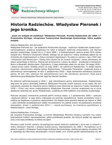 Urząd Gminy Radziechowy-Wieprz 34-381 Radziechowy, Wieprz 700 tel. 33 867 66 10, fax. 33 867 66 13 e-mail: [email protected] www.radziechowy-wieprz.pl Aktualności › Historia Radziechów. Władysław Pieronek i jego kronika. Historia Radziechów. Władysław Pieronek i jego kronika. - pisze we wstępie do publikacji "Władysław Pieronek. Kronika Radziechów (do 1966 r.)” Przemysław Dyrlaga, wiceprezes Towarzystwa Naukowego Żywieckiego, które wydało książkę. Historia Radziechów. Kim był autor? Władysław Pieronek był - jak podkreśla Przemysław Dyrlaga - wybitnym działaczem społecznym i samorządowym, postacią wyjątkową nie tylko w dziejach rodzinnej miejscowości, ale również powiatu żywieckiego. Urodził się w 17 lipca 1896 r. w Radziechowach. Jeszcze przed 1914 rokiem związał się z Polowymi Drużynami Sokoła, dlatego też po wybuchu I wojny światowej zgłosił się na ochotnika do organizowanych w Żywcu kompanii legionowych. Po walce w czerwcu i lipcu 1915 roku z Rosjanami pod Barańczami i Polską Górą dostał się do niewoli rosyjskiej i został skierowany do obozu jenieckiego w Darnicy. Później był przenoszony z obozu do obozu – przebywał w Koziatynie, Bielcu w Besarabii, Berdyczowie i Żytomierzu. Z tego ostatniego udało mu się zbiec 18 lutego 1918 r. i pieszo przez Lwów i Kraków wrócić 15 maja 1918 r. do rodzinnych Radziechów. Tu dzięki swemu kuzynowi, ówczesnemu wójtowi gminy Radziechowy, Tomaszowi Pieronkowi, rozpoczął pracę w administracji samorządowej. W dniu 1 października 1918 r. objął stanowisko sekretarza (pisarza) gminy. W tym roku ukończył też specjalistyczny kurs dla sekretarzy gminnych. Poza pracą administracyjną Władysław Pieronek zajął się również handlem. Po reformie administracyjnej w 1934 r., gdy zlikwidowano gminy jednowioskowe i Radziechowy włączono do gminy zbiorowej Zabłocie, Władysław Pieronek został wybrany na jej wójta. Na tym stanowisku pozostał do zniesienia gminy Zabłocie przez Niemców po wybuchu II wojny światowej w 1939 r. Przez cały okres międzywojenny Władysław Pieronek czynnie angażował się w życie społeczne rodzinnej wsi, gminy Radziechowy, a później od 1935 Zabłocie, oraz powiatu żywieckiego. Podczas okupacji niemieckiej przestał pełnić funkcję wójta, a 3 października 1940 r. podczas „Saybusch-Aktion” w jego domu ulokowała się komisja wysiedleńcza. Został wysiedlony wraz z rodziną do Stępkowa w powiecie radzymińskim. Do Radzie-chów powrócił dopiero po wojnie w 1945 r. Jako członkowi przedwojennych władz nie pozwolono mu jednak wrócić na piastowane wcześniej stanowiska. Zmarł 2 października 1974 r. i został pochowany na cmentarzu parafialnym w Radziechowach - pisze Dyrlaga. Historia Radziechów. O kronice... Jak zauważa Przemysław Dyrlaga, w kronice Władysława Pieronka możemy wyróżnić trzy części poprzedzone krótkim wprowadzeniem, gdzie przedstawił powody, dla których podjął się napisania pracy oraz bazę źródłową, na której się oparł. Pierwsza część kroniki zawiera chronologiczny wykaz ważnych wydarzeń z życia wsi, a czasami z braku takowych również z dziejów Żywiecczyzny, doprowadzony do 1966 r. Początkowo są to głównie wypiski z Dziejopisu Żywieckiego Andrzeja Komonieckiego, później począwszy od połowy XIX w. pojawiają się informacje zaczerpnięte z innych źródeł, m.in. kroniki parafii radziechowskiej czy akt http://www.radziechowy-wieprz.pl/aktualnosci/historia-radziechow-wladyslaw-pieronek-i-jego-kronika-,814 Strona 1 Urząd Gminy Radziechowy-Wieprz 34-381 Radziechowy, Wieprz 700 tel. 33 867 66 10, fax. 33 867 66 13 e-mail: [email protected] www.radziechowy-wieprz.pl Aktualności › Historia Radziechów. Władysław Pieronek i jego kronika. gminnych. Najbardziej interesujący, a przy tym dość szczegółowy fragment obejmuje lata 19141966, opisane w dużej mierze z autopsji. Część druga kroniki ma charakter rzeczowo-chronologiczny i zawiera opracowania różnych dziedzin życia społecznego, intelektualnego, kulturalnego i gospodarczego wsi. Możemy tu znaleźć informacje o podziale wsi na role, o warunkach życia mieszkańców, o radziechowskich rzemieślnikach, handlu, przedsiębiorcach, o szkołach w Radziechowach, Przybędzy i Twardorzeczce (te dwie ostatnie wsie były wówczas przysiółkami radziechowskimi), o udziale radziechowian w wojnach, o działalności tak ważnych organizacji jak Kółko Rolnicze czy Ognisko Związku Podhalan. Część trzecia – aneksy – zawiera oryginalne, bezcenne, choć nie zawsze kompletne wykazy: osób wykształconych od 1900 do lat 50. XX w.; poległych podczas I wojny światowej; emigrantów, którzy wyjechali do Ameryki przed I wojną światową oraz w dwudziestoleciu międzywojennym; wyjeżdżających na tzw. Ziemie Odzyskane po II wojnie światowej; wysiedlonych podczas SaybuschAktion czy sprowadzonych do Radziechów osadników niemieckich. Całość uzupełniają przypisy autora zawierające nie tylko odnośniki do wykorzystanych źródeł, ale również wyjaśnienia i uzupełnienia - opisuje Dyrlaga. Historia Radziechów. Warto wiedzieć Warto wiedzieć, że poza Kroniką Radziechów (do 1966 r.), Władysław Pieronek pozostawił jeszcze pamiętnik zatytułowany Śladem życia. Ponadto napisał dwie sztuki teatralne Wesele radziechowskie i Mojka, wystawiane przez amatorskie kółko teatralne, działające niegdyś w Radzie-chowach, w którym sam grywał na scenach nie tylko rodzinnej wsi, ale również Wisły i Żywca. Publikację "Władysław Pieronek. Kronika Radziechów (do 1966 r.)” można nabyć w sklepiku Zamku Żywieckiego źródło: zywiec.naszemiasto.pl/artykul/historia-radziechow-wladyslaw-pieronek-i-jego-kronika,3483267,artgal,t,id,tm.html http://www.radziechowy-wieprz.pl/aktualnosci/historia-radziechow-wladyslaw-pieronek-i-jego-kronika-,814 Strona 2
