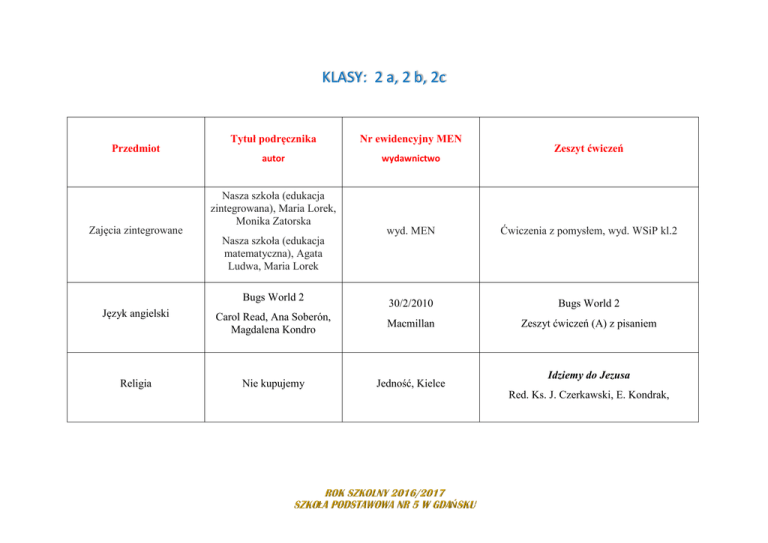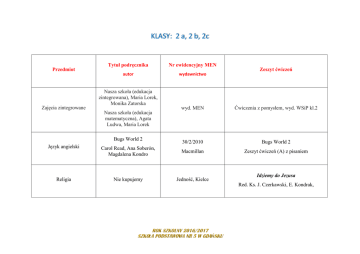 KLASY: 2 a, 2 b, 2c Przedmiot Zajęcia zintegrowane Tytuł podręcznika Nr ewidencyjny MEN autor wydawnictwo Nasza szkoła (edukacja zintegrowana), Maria Lorek, Monika Zatorska Nasza szkoła (edukacja matematyczna), Agata Ludwa, Maria Lorek Bugs World 2 Język angielski Religia Zeszyt ćwiczeń wyd. MEN Ćwiczenia z pomysłem, wyd. WSiP kl.2 30/2/2010 Bugs World 2 Carol Read, Ana Soberón, Magdalena Kondro Macmillan Zeszyt ćwiczeń (A) z pisaniem Nie kupujemy Jedność, Kielce Idziemy do Jezusa Red. Ks. J. Czerkawski, E. Kondrak,
