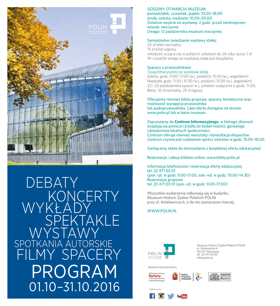 GODZINY OTWARCIA MUZEUM: poniedziałek, czwartek, piątek: 10.00–18.00 środa, sobota, niedziela: 10.00–20.00 Ostatnie wejście na wystawę: 2 godz. przed zamknięciem wtorek: nieczynne Uwaga: 12 października muzeum nieczynne. Samodzielne zwiedzanie wystawy stałej: 25 zł bilet normalny 15 zł bilet ulgowy młodzież ucząca się w polskich szkołach do 26 roku życia: 1 zł W czwartki wstęp na wystawę stałą jest bezpłatny Spacery z przewodnikiem Tysiącletnia podróż po wystawie stałej Soboty: godz. 11.00 i 17.00 (w j. polskim), 15.00 (w j. angielskim) Niedziele: godz. 11.00 i 15.30 (w j. polskim), 15.00 (w j. angielskim) 22 i 23 października spacer w j. polskim wyłącznie o godz. 11.00. Bilety: 35 zł normalny, 25 zł ulgowy Oferujemy również bilety grupowe, spacery tematyczne oraz możliwość wynajęcia przewodnika lub audioprzewodnika. Cała oferta dostępna na stronie www.polin.pl lub w kasie muzeum. Wsparcie udzielone z funduszy norweskich i EOG przez Islandię, Liechtenstein i Norwegię www.eeagrants.org, www.norwaygrants.org Zapraszamy do Centrum Informacyjnego, w którego zbiorach znajdują się pomoce i źródła do badań historii, genealogii i dziedzictwa lokalnych społeczności. Centrum oferuje również warsztaty i konsultacje ekspertów. Centrum czynne jest codziennie oprócz wtorków w godz. 10.00–18.00. Zachęcamy także do skorzystania z bezpłatnej oferty edukacyjnej! Rezerwacja i zakup biletów online: www.bilety.polin.pl DEBATY KONCERTY WYKŁADY SPEKTAKLE WYSTAWY SPOTKANIA AUTORSKIE FILMY SPACERY PROGRAM Informacja telefoniczna i rezerwacja oferty edukacyjnej tel. 22 471 03 01 (pon.–pt. w godz. 9.00–17.00, sob.–nd. w godz. 10.00–14.30) Rezerwacja grupowa tel. 22 471 03 01 (pon.–pt. w godz. 9.00–17:00) Wszystkie wydarzenia odbywają się w budynku Muzeum Historii Żydów Polskich POLIN przy ul. Anielewicza 6, o ile nie zaznaczono inaczej. WWW.POLIN.PL Muzeum Historii Żydów Polskich POLIN ul. Anielewicza 6 00-157 Warszawa tel. 22 471 03 00 [email protected] Wspólna instytucja kultury Główni partnerzy merytoryczni Centrum Informacyjnego: 01.10–31.10.2016 Follow us on: Facebook “f ” Logo CMYK / .ai WYSTAWA STAŁA 1000 lat historii Żydów polskich Interaktywna wystawa stała Muzeum POLIN to podróż od średniowiecza do współczesności. Poznacie odpowiedzi na pytania, skąd i kiedy Żydzi pojawili się w Polsce. W jaki sposób nasz kraj stał się domem największej społeczności żydowskiej na świecie, jak przestał nim być i jak Rosz Haszana – żydowski Nowy Rok – rodzinny spacer tematyczny Z okazji Rosz Haszana zapraszamy dzieci (6-14 lat) z opiekunami na specjalny spacer po wystawie. Poznamy żydowski kalendarz oraz zwyczaje związane ze świętami. Sprawdzimy, czemu nowy rok zaczyna się jesienią i skąd na świątecznym stole ryby, okrągła chałka i jabłka z miodem. 9 października, godz. 14.30, bilety: bilety: 35 zł normalny, 25 zł ulgowy, 55 zł rodzinny FESTIWAL MADE IN POLIN odradza się tu życie żydowskie. Zobaczycie zabytkowe obiekty, obrazy, instalacje interaktywne, modele i multimedia. Zobaczycie m.in. XIII-wieczną monetę bitą w Polsce i książki z żydowskich drukarni sprzed 400 lat. Zapierającą dech w piersiach rekonstrukcję zdobionego dachu drewnianej synagogi i niezwykłą multimedialną ulicę. Czynne codziennie oprócz wtorków. Bilety: 25 zł normalny, 15 zł ulgowy; młodzież ucząca się w polskich szkołach do 26 roku życia: 1 zł; czwartki wstęp wolny WYDARZENIA TOWARZYSZĄCE Tysiącletnia podróż po wystawie stałej – spacer z przewodnikiem Soboty: godz. 11.00 i 17.00 (w j. polskim), 15.00 (w j. angielskim) Niedziele: godz. 11.00 i 15.30 (w j. polskim), 15.00 (w j. angielskim) 22 i 23 października spacer w j. polskim wyłącznie o godz. 11.00. Bilety: 35 zł normalny, 25 zł ulgowy Życie – spacer tematyczny z tłumaczeniem na Polski Język Migowy W trakcie spaceru przybliżymy zwiedzającym obrzędy związane z cyklem życia, wynikające z zasad judaizmu. Opowiemy o etapach życia żydowskiej kobiety i żydowskiego mężczyzny. Zwiedzający dowiedzą się, kiedy dziecko otrzymuje imię, co to są bat i bar micwa, dlaczego ślub żydowski odbywa się pod chupą i jak wyglądają kolejne etapy pogrzebu. 7 października, godz. 16.00, wstęp wolny, wymagana rezerwacja na stronie: www.wtkbb.pl Jedno spotkanie – dwie galerie - wydarzenie dla osób z dysfunkcją wzroku W czasie spaceru z audiodeskrypcją i użyciem tyflografik zapoznamy się z treściami dwóch pierwszych galerii wystawy stałej Muzeum POLIN. Galeria Pierwsze spotkania opowiada o dziejach Żydów na polskich ziemiach od X do początku XVI w., a Paradisus Iudaeorum mówi o rozkwicie żydowskiego osadnictwa i samorządności, myśli filozoficznej i rozwoju drukarstwa w latach 1569–1648. 8 października, godz. 16.00, wstęp wolny, wymagana rezerwacja na stronie: www.wtkbb.pl Made in Polin // Cytaty – druga edycja festiwalu Tematem tegorocznej edycji festiwalu Made in POLIN są cytaty: międzykulturowe zapożyczenia, to, co przekształcane, a czasem zawłaszczane. Trawestacje, polemiki i remiksy. W kulturze popularnej i wysokiej, w życiu codziennym i sztuce. W programie trzy dni wypełnione projektami specjalnymi, koncertami (usłyszymy np. Radzimira Dębskiego z Sinfonią Varsovią), dyskusjami i wykładami (m.in. z prof. Jerzym Bralczykiem i Andrzejem Markowskim), spotkaniami kulinarnymi (z Robertem Makłowiczem) i literackimi. A do tego wystawa znakomitych polskich twórców komiksu, słuchowisko na żywo z udziałem Jerzego Treli, spacery, warsztaty i performans Joanny Rajkowskiej. 21-23 października, szczegółowy program na stronie www.polin.pl/madeinpolin 15 PAŹDZIERNIKA: DZIEŃ SOLIDARNOŚCI Z UCHODŹCAMI Uchodźcy i Zagłada - wykład Dr hab. Iwona Kurz z Instytutu Kultury Polskiej UW zajmie się dyskusją publicznąna temat uchodźców i migrantów, jaka toczy się od co najmniej kilkunastu mie