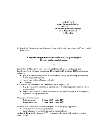 ANEKS Nr 2 z dnia 24 stycznia 2005r. do STATUTU I Liceum Ogólnokształcącego im.K.Jagiellończyka w Sieradzu 1. Rozdział „Regulamin przyjmowania kandydatów do klas pierwszych” otrzymuje brzmienie: Kryteria przyjmowania uczniów do klas pierwszych liceum ogólnokształcącego §1 Kandydaci do klasy pierwszej I Liceum Ogólnokształcącego im. Kazimierza Jagiellończyka w Sieradzu składają od 4 kwietnia do 29 kwietnia 2005r następujące dokumenty: • podanie [druk można pobrać w sekretariacie szkoły lub ze strony internetowej www.lojagiellonczyk.pl], • wypis z dowodu osobistego rodziców, • 2 zdjęcia, a w terminie od 27 czerwca do 29 czerwca 2005 do godz.1500 : • kopię świadectwa ukończenia gimnazjum potwierdzoną przez dyrektora szkoły gimnazjalnej, • kopię zaświadczenia o wynikach egzaminu gimnazjalnego potwierdzoną przez dyrektora szkoły gimnazjalnej, Ogłoszenie list przyjętych: lista wstępna lista ostateczna -2 lipca 2005r. godz. 1200 -7 lipca 2005r. godz. 1200 Złożenie przez kandydata umieszczonego na liście wstępnej oryginałów : świadectwa ukończenia gimnazjum zaświadczenia o wynikach egzaminu gimnazjalnego od 4 do 6 lipca 2005r. do godz. 1500 jest potwierdzeniem woli podjęcia nauki w naszej szkole. §2 Laureaci konkursów przedmiotowych o zasięgu wojewódzkim (załącznik nr 1) i ponadwojewódzkim przyjmowani są do szkoły niezależnie od podanych niżej kryteriów. §3 Punkty są przyznawane wg następujących kryteriów: 1. Liczba punktów możliwych do uzyskania za wyniki egzaminu przeprowadzonego w ostatnim roku nauki w gimnazjum zawartych w zaświadczeniu o szczegółowych wynikach egzaminu wynosi 50% ogólnej liczby punktów możliwych do uzyskania przez kandydata, tj. 100. 2. Liczba punktów możliwych do uzyskania za oceny z czterech przedmiotów zajęć edukacyjnych oraz za inne osiągnięcia ucznia wymienione w świadectwie ukończenia gimnazjum wynosi 50% ogólnej liczby punktów możliwych do uzyskania przez kandydata, tj. 100. 2.1 Punkty są przyznawane za oceny z języka polskiego oraz 3 wybranych zajęć edukacyjnych w zależności od klasy: 1) z rozszerzonym j.angielskim i geografią z elementami edukacji europejskiej: język obcy*, geografia, matematyka 2) z rozszerzonymi przedmiotami humanistycznymi: historia, geografia, język obcy* 3) z rozszerzoną biologia i chemią: biologia, chemia, matematyka 4) z rozszerzonym j.niemieckim i matematyką: język obcy*, matematyka, geografia 5) z rozszerzonym j.angielskim i matematyką: język obcy*, matematyka, geografia 6) z rozszerzoną matematyką, informatyką i fizyką: matematyka, fizyka, język obcy* 2.2 Punkty są obliczane wg następujących zasad: 1) Za każdą ocenę celującą kandydat otrzymuje 15 punktów, 2) Za każdą bardzo dobrą kandydat otrzymuje 13 punktów; 3) Za każdą ocenę dobrą kandydat otrzymuje 11 punktów; 4) Za każdą ocenę dostateczną kandydat otrzymuje 7 punkty; 5) Za każdą ocenę dopuszczającą kandydat otrzymuje 2 punktów. *język obcy, obowiązkowy, którego nauka trwała przez 3 lata w gimnazjum 2.3. Świadectwo ukończenia gimnazjum z wyróżnieniem-7 pkt. 2.4. Punkty przyznawane są za inne osiągnięcia umieszczone na świadectwie ukończenia gimnazjum wg następujących zasad: • uzyskanie tytułu finalisty w konkursach przedmiotowych organizowanych przez kuratora oświaty (wymienionych w załączniku 1): jeden tytuł -10 pkt. dwa i więcej tytułów -dodatkowo 2 pkt. • zajęcie 1-6 miejsca w imprezach sportowych indywidualnych lub 1-4 miejsca w grach zespołowych co najmniej na szczeblu wojewódzkim (w dyscyplinach wymienionych w załączniku nr 3) w jednej dyscyplinie -6 pkt. w dwóch i więcej dyscyplinach -dodatkowo 2 pkt. • • • albo (w przypadku braku osiągnięć na szczeblu co najmniej wojewódzkim) zajęcie od 1 do 3 miejsca w zawodach sportowych na szczeblu powiatowym (w dyscyplinach wymienionych w załączniku 3) – 3 pkt. zajęcie 1-3 w konkursach tematycznych na szczeblu co najmniej wojewódzkim (wymienionych w załączniku nr 2) w jednym konkursie -5 pkt. w dwóch i więcej konkursach -dodatkowo 2 pkt. zajęcie 1-3 w konkursach artystycznych na szczeblu powiatowym – 3pkt. osiągnięcia w aktywności na rzecz innych ludzi, zwłaszcza w formie wolontariatu lub osiągnięcia w aktywności na rzecz środowiska szkolnego – 3 pkt., §4 Załącznik nr 1 Lista konkursów przedmiotowych dla uczniów gimnazjów organizowanych przez Łódzkiego Kuratora Oświaty: a. języka polskiego b. języka angielskiego c. języka niemieckiego d. języka rosyjskiego e. historyczny f. biologiczny g. chemiczny h. fizyczny i. informatyczny j. geograficzny k. matematyczny l. wiedzy o sztuce m. „Losy żołnierza i dzieje oręża polskiego” – etap regionalny Załącznik nr 2 Lista konkursów tematycznych (osiągnięcia kandydatów co najmniej na szczeblu wojewódzkim): • • • • • • Ogólnopolski Turniej Wiedzy o Bezpieczeństwie Ruchu Drogowego, Ogólnopolski Młodzieżowy Konkurs Krajoznawczy „ Poznajmy Ojcowiznę”, Ogólnopolski Młodzieżowy Turniej Turystyczno-Krajoznawczy, Ogólnopolski Konkurs Krasomówczy Młodzieży, Konkurs Matematyczny „Kangur” ( co najmniej 125 pkt), Ogólnopolski Teleturniej „ Euro – Quiz”. Załącznik nr 3 Lista dyscyplin sportowych obejmujących konkursy organizowane przez polskie związki sportowe, wojewódzkie interdyscyplinarne stowarzyszenia kultury fizycznej lub Szkolny Związek Sportowy, w których osiągnięcia kandydatów są punktowane w procesie rekrutacji do szkół ponadgimnazjalnych: dyscypliny indywidualne : - akrobatyka sportowa, badminton, biathlon, biathon letni, bieg na orientację, biegi przełajowe, boks, bowling sportowy, brydż sportowy, gimnastyka artystyczna, gimnastyka sportowa, jeździectwo, judo, kajakarstwo, karate tradycyjne, karate WKF, kolarstwo szosowe, kolarstwo torowe, kręglarstwo, lekkoatletyka, łucznictwo, łyżwiarstwo figurowe, łyż