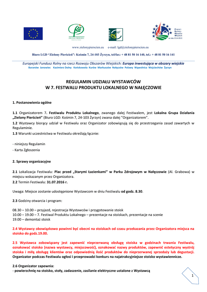 www.zielonypierscien.eu e-mail: [email protected] Biuro LGD “Zielony Pierścień”: Kośmin 7, 24-103 Żyrzyn, tel/fax: + 48 81 50 16 140, tel.: + 48 81 50 16 141 Europejski Fundusz Rolny na rzecz Rozwoju Obszarów Wiejskich: Europa inwestująca w obszary wiejskie Baranów Janowiec Kazimierz Dolny Końskowola Kurów Markuszów Nałęczów Puławy Wąwolnica Wojciechów Żyrzyn REGULAMIN UDZIAŁU WYSTAWCÓW W 7. FESTWALU PRODUKTU LOKALNEGO W NAŁĘCZOWIE 1. Postanowienia ogólne 1.1 Organizatorem 7. Festiwalu Produktu Lokalnego, zwanego dalej Festiwalem, jest Lokalna Grupa Działania „Zielony Pierścień” (Biuro LGD: Kośmin 7, 24-103 Żyrzyn) zwana dalej ”Organizatorem”. 1.2 Wystawcy biorący udział w Festiwalu oraz Organizator zobowiązują się do przestrzegania zasad zawartych w Regulaminie. 1.3 Warunki uczestnictwa w Festiwalu określają łącznie: - niniejszy Regulamin - Karta Zgłoszenia 2. Sprawy organizacyjne 2.1 Lokalizacja Festiwalu: Plac przed „Starymi Łazienkami” w Parku Zdrojowym w Nałęczowie (Al. Grabowa) w miejscu wskazanym przez Organizatora. 2.2 Termin Festiwalu: 31.07.2016 r. Uwaga: Miejsce zostanie udostępnione Wystawcom w dniu Festiwalu od godz. 8.30. 2.3 Godziny otwarcia i program: 08.30 – 10.00 – przyjazd, rejestracja Wystawców i przygotowanie stoisk 10.00 – 19.00 – 7. Festiwal Produktu Lokalnego – prezentacje na stoiskach, prezentacje na scenie 19.00 – demontaż stoisk 2.4 Wystawcy obowiązkowo powinni być obecni na stoiskach od czasu przekazania przez Organizatora miejsca na stoisko do godz.19.00. 2.5 Wystawca zobowiązany jest zapewnić nieprzerwaną obsługę stoiska w godzinach trwania Festiwalu, oznakować stoisko (nazwa wystawcy, miejscowość), oznakować nazwy produktów, zapewnić estetyczny wystrój stoiska i miłą obsługę klientów oraz odpowiednią ilość produktów do nieprzerwanej sprzedaży lub degustacji. Organizator podczas Festiwalu ogłosi i przeprowadzi konkurs na najatrakcyjniejsze stoisko wystawiennicze. 2.6 Organizator zapewnia: - powierzchnię na stoisko, stoły, zadaszenie, zasilanie elektryczne ustalone z Wystawcą 1 2.7 Wystawca we własnym zakresie zapewni wodę, gaz i krzesełka. 2.8 W karcie zgłoszeniowej uczestnik podaje nr rejestracyjny i markę samochodu, który będzie służyć do dostarczenia produktów na stoisko (godz. od 8.30 do 10.00) i do przewozu rzeczy z demontażu stoisk po godz. 19.00. Nie podanie tej informacji może spowodować brak możliwości wjazdu na plac wystawców. 3. Zasady uczestnictwa 3.1 Warunkiem uczestnictwa w Festiwalu jest: - dostarczenie osobiście, faksem, e-mailem lub za pośrednictwem poczty do Biura Organizatora (Lokalna Grupa Działania „Zielony Pierścień”, Kośmin 7, 24-103 Żyrzyn) wypełnionego formularza Karta Zgłoszenia – najpóźniej do 11 lipca 2016 r. 3.2. Samo dostarczenie Karty Zgłoszenia nie jest równoznaczne z przyjęciem podmiotu do uczestnictwa w Festiwalu. Organizator zastrzega sobie prawo wyboru wystawców w Festiwalu w przypadku większej ilości zgłoszonych podmiotów (ograniczona liczba miejsc). 3.3. Wypełnienie Karty Zgłoszenia jest jednoznaczne z akceptacją Regulaminu. 3.4. Potwierdzenie przez Organizatora udziału Wystawcy w Festiwalu nastąpi najpóźniej do 14 lipca 2016 r. 4 Rezygnacja 4.1 Wystawca może zrezygnować z udziału w Festiwalu pod następującymi warunkami: w terminie do 15.07.2016 r. z tym że: - rezygnacja powinna być dostarczona do biura Organizatora na piśmie (poczta ,fax, e-mail). - za datę wpływu uznaje się datę wpływu rezygnacji do Organizatora. 4.2. Organizator zastrzega sobie prawo do zmiany terminu Festiwalu lub jego odwołania w przypadku zaistnienia okoliczności niezależnych od Organizatora. 5 Ekspozycja i lokalizacja 5.1. Organizator wskazuje lokalizację stoiska, oraz udostępnia Wystawcy powierzchnię, stoły i media (energia elektryczna) wg Karty Zgłoszenia. 5.2. O lokalizacji stoiska decyduje: - termin nadesłania prawidłowo wypełnionej Karty - wielkość placu wystawowego i stoiska - możliwości terenowe 6 Bezpieczeństwo, zabezpieczenie targów i ubezpieczenia, porządek 6.1. Wystawca zobowiązany jest przestrzegać przepisów porządku, bezpieczeństwa i higieny. 6.2. Z uwagi na innych wystawców oraz publiczność, a także zachowania dobrego imienia Wystawcy i Organizatora nie dopuszcza się likwidacji stoiska w czasie trwania Festiwalu. 6.3. W przypadkach losowych Wystawca uzyskuje od Organizatora zgodę na likwidację stoiska w terminie wcześniejszym. 6.4. Zaleca się Wystawcom ubezpieczenie od odpowiedzialności cywilnej wynikającej z uczestnictwa w Festiwalu, jak również ubezpieczenie eksponatów. 6.5. Organizator nie ponosi odpowiedzialności za wypadki osób trzecich i uszkodzenie eksponatów znajdujących się na Festiwalu, przed i po Festiwalu , jak również za szkody spowodowane przez personel, publiczność i osoby trzecie. 6.6. Organizator nie odpowiada za szkody spowodowane kradzieżą, ogniem, zmiennymi warunkami i zjawiskami atmosferycznymi, a także działaniem sił wyższych. 6.7. Na terenie gdzie odbywa się Festiwal obowiązuje zakaz: 2 - Używania otwartego ognia - Palenia tytoniu - Zastawiania dojść i dojazdów do urządzeń przeciwpożarowych, przejść dla publiczności, ciągów komunikacyjnych, oraz wyjść ewakuacyjnych. - Wnoszenia substancji chemicznych (pożarowo niebezpiecznych) - Pozostawiania bez dozoru urządzeń przystosowanych do ciągłej eksploatacji 6.8. Wystawca zobowiązuje się do utrzymania czystości na stoisku, usuwania śmieci oraz zabrania ich ze sobą. 7. Postanowienia końcowe 7.1. Złożenie Karty Zgłoszeniowej do LGD „Zielony Pierścień” skutkuje przyjęciem niniejszego Regulaminu przez Wystawcę. 7.2. Przestrzeganie Regulaminu powierza się pracownikom Organizatora, przy pomocy służb porządkowych. 7.3. Wszelkie spory mogące wyniknąć z tytułu uczestnictwa w Festiwalu będą rozstrzygane polubownie, a w pr