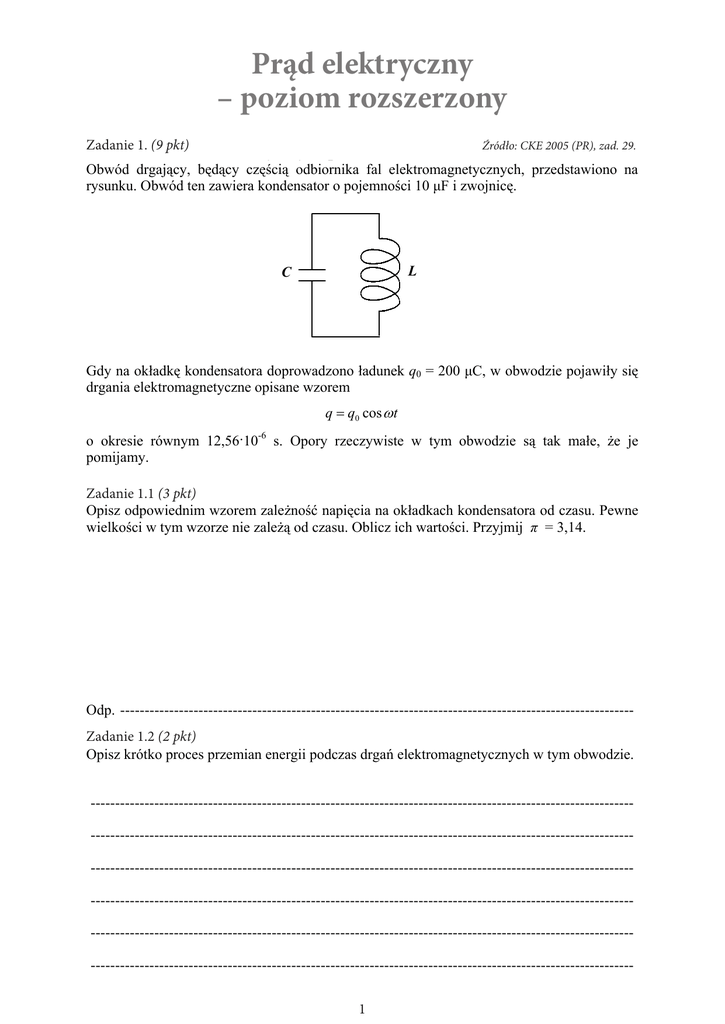 Prąd elektryczny – poziom rozszerzony Zadanie 1. (9 pkt) Źródło: CKE 2005 (PR), zad. 29. 1.1 (3 pkt) Zadanie Zadanie 1.2 (2 pkt) 1 1.3 (2 pkt) Zadanie Zadanie 1.4 (2 pkt) 2 --------------------------------------------------------------------------------------------------------------- Zadanie Silnik elektryczny (10 pkt) Zadanie 2. 26. (10 pkt) Źródło: CKE 01.2006 (PR), zad. 26. Silnik elektryczny na prąd staáy zasilany jest z baterii o SEM İ = 12 V. Podczas pracy silnika przez jego uzwojenia páynie prąd o natĊĪeniu I = 2 A, natomiast gdy wirnik tego silnika jest caákowicie zahamowany, przez jego uzwojenie páynie wiĊkszy prąd o natĊĪeniu I0 = 3 A. Opór wewnĊtrzny baterii pomijamy. Zadanie (2 pkt) 26. 1 (22.1 pkt) W tym obwodzie wystĊpują siáy elektromotoryczne baterii i indukcji. OkreĞl i uzasadnij, czy te SEM skierowane są zgodnie, czy przeciwnie (nie uwzglĊdniamy SEM samoindukcji). 6 Egzamin maturalny z fizyki i astronomii Arkusz II 26.2 (1 2.2 pkt)(1 pkt) Zadanie Zapisz prawo Ohma dla tego obwodu. 26.3 (1 2.3 pkt)(1 pkt) Zadanie Podaj, jakie są wartoĞci obu SEM, gdy wirnik jest nieruchomy. Zadanie 26.4 (1 2.4 pkt)(1 pkt) Oblicz wartoĞü oporu omowego uzwojenia silnika. 26.5 (1 pkt) Podczas pracy silnika czĊĞü energii jest tracona z powodu wydzielania siĊ ciepáa w uzwojeniu, ze wzglĊdu na niezerowy opór omowy. Oblicz moc traconą w ten sposób podczas pracy silnika. 3 26.5 (1 2.5 pkt) Zadanie (1 pkt) Podczas pracy silnika czĊĞü energii jest tracona z powodu wydzielania siĊ ciepáa w uzwojeniu, ze wzglĊdu na niezerowy opór omowy. Oblicz moc traconą w ten sposób podczas pracy silnika. Egzamin maturalny z fizyki i astronomii Arkusz II 7 26.6 (2 2.6 pkt) Zadanie (2 pkt) Oblicz moc uĪyteczną silnika (jest to moc prądu w obwodzie pomniejszona o moc traconą z powodu strat cieplnych), gdy przez jego uzwojenie páynie prąd o natĊĪeniu I = 2A. Zadanie (2 pkt) 26.7 (2 2.7 pkt) Oblicz sprawnoĞü silnika w warunkach opisanych w zadaniu 26.6. Zadanie 27. Rakieta (9 pkt) 27.1 (3 pkt) WyprowadĨ wzór na pierwszą prĊdkoĞü kosmiczną i za jego pomocą oblicz jej wartoĞü dla Ziemi. 4 4 Egzamin maturalny z fizyki i astronomii Arkusz II Zadanie Ogrzewacz wody (10 pkt) Zadanie 3. 23. (10 pkt) Źródło: CKE 05.2006 (PR), zad. 23. Turystyczny ogrzewacz wody zasilany jest z akumulatora samochodowego. Element grzejny wykonano na bocznej powierzchni szklanego naczynia mającego ksztaát walca. Element grzejny tworzy kilka zwojów przewodzącego materiaáu w postaci paska o szerokoĞci 4 mm i gruboĞci 0,1 mm. Caákowita dáugoĞü elementu grzejnego wynosi 0,628 m. Opór elektryczny elementu grzejnego jest równy 0,60 ȍ. Siáa elektromotoryczna akumulatora wynosi 12,6 V, a jego opór wewnĊtrzny jest równy 0,03 ȍ. 23.1 (3 3.1 pkt)(3 pkt) Zadanie Oblicz moc elementu grzejnego wykorzystywanego w ogrzewaczu w sytuacji opisanej w treĞci zadania. 23.2 (2 3.2 pkt)(2 pkt) Zadanie WykaĪ, Īe opór wáaĞciwy elementu grzejnego ma wartoĞü okoáo 3,8·10-7 ȍ·m. 5 5 Egzamin maturalny z fizyki i astronomii Arkusz II 23.3 (3 3.3 pkt) Zadanie (3 pkt) Oszacuj, ile razy wydáuĪy siĊ czas potrzebny do zagotowania wody, jeĪeli napiĊcie na zaciskach elementu grzejnego zmaleje o 20%. ZaáóĪ, Īe opór elektryczny elementu grzejnego jest staáy, a straty ciepáa w obu sytuacjach są pomijalne. Zadanie (2 pkt) 23.4 (2 3.4 pkt) Ogrzewacz moĪe byü zasilany ze Ĩródáa prądu przemiennego poprzez ukáad prostowniczy. Do zacisków A i B ukáadu doprowadzono z transformatora napiĊcie przemienne. Narysuj na schemacie, w miejscach zaznaczonych prostokątami, brakujące elementy póáprzewodnikowe tak, aby przez grzaákĊ páynąá prąd wyprostowany dwupoáówkowo*). Oznacz na schemacie za pomocą strzaáki kierunek przepáywu prądu przez grzaákĊ. *) wyprostowany dwupoáówkowo – prąd páynie przez grzaákĊ w obu póáokresach Nr zadania Wypeánia Maks. liczba pkt egzaminator! Uzyskana liczba pkt 6 23.1 3 23.2 2 23.3 3 23.4 2 Zadanie 4. 2. (12Prąd pkt) zmienny (12 pkt) Źródło: CKE 2007 (PR), zad. 2. Zadanie Do Ĩródáa prądu przemiennego poprzez ukáad prostowniczy doáączono ĪarówkĊ, w której zastosowano wáókno wolframowe. Opór Īarówki podczas jej Ğwiecenia wynosiá 100 :. Na wykresie poniĪej przedstawiono zaleĪnoĞü natĊĪenia prądu elektrycznego páynącego przez ĪarówkĊ od czasu. I, A 0,5 0,4 0,3 0,2 0,1 0,005 0,01 0,015 0,02 0,025 0,03 t, s 2.1 (2 pkt) Zadanie 4.1 (2 pkt) Podaj, jaką wartoĞü oporu (wiĊkszą, czy mniejszą niĪ 100 :) miaáo wáókno Īarówki przed doáączeniem jej do Ĩródáa prądu. OdpowiedĨ uzasadnij. Zadanie 4.2 (2 pkt) 2.2 (2 pkt) OkreĞl, analizując wykres, czĊstotliwoĞü zmian napiĊcia Ĩródáa prądu przemiennego zasilającego ukáad prostowniczy. Egzamin maturalny z fizyki i astronomii Poziom rozszerzony 5 Zadanie 4.3 (2 pkt) 2.3 (2 pkt) Oblicz wartoĞü áadunku elektrycznego, jaki przepáynąá przez ĪarówkĊ w czasie 0,02 s. 2.4 (4 pkt) Naszkicuj wykres ilustrujący zaleĪnoĞü napiĊcia na Īarówce od czasu. Na wykresie zaznacz odpowiednie wartoĞci. Wykres sporządĨ dla przedziaáu czasu [0 s – 0,03 s]. Dokonaj niezbĊdnych obliczeĔ. IndukcyjnoĞü obwodu pomiĔ. obliczenia 7 Zadanie 4.4 (4 pkt) 2.4 (4 pkt) Naszkicuj wykres ilustrujący zaleĪnoĞü napiĊcia na Īarówce od czasu. Na wykresie zaznacz odpowiednie wartoĞci. Wykres sporządĨ dla przedziaáu czasu [0 s – 0,03 s]. Dokonaj niezbĊdnych obliczeĔ. IndukcyjnoĞü obwodu pomiĔ. obliczenia wykres 6 6 Egzamin maturalny z fizyki i astronomii Poziom rozszerzony Egzamin maturalny z fizyki i astronomii Egzamin maturalny z fizyki i astronomii Poziom rozszerzony Poziom rozszerzony 6 2.5 (2 pkt) Na rysunkach poniĪej przedstawiono schematy dwóch ukáadów zasilających, w których 2.5 (2 pkt)diody prostownicze. zastosowano Zadanie 4.5 (2 pkt) 2.5 pkt) Nr zadania 1.6 dwóch 2.1 ukáadów 2.2 2.3 2.4 Na(2rysunkach poni