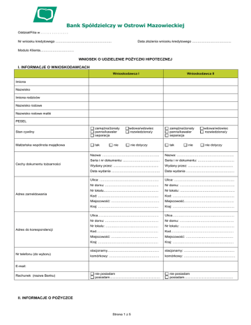 Bank Spółdzielczy w Ostrowi Mazowieckiej Oddział/Filia w . . . . . . . . . . . . . . . Nr wniosku kredytowego ………………………………………….. Data złożenia wniosku kredytowego …………………………….. Modulo Klienta………………………… WNIOSEK O UDZIELENIE POŻYCZKI HIPOTECZNEJ I. INFORMACJE O WNIOSKODAWCACH Wnioskodawca I Wnioskodawca II Imiona Nazwisko Imiona rodziców Nazwisko rodowe Nazwisko rodowe matki PESEL Stan cywilny zamężna/żonaty panna/kawaler separacja Małżeńska wspólnota majątkowa tak Cechy dokumentu tożsamości Adres zameldowania Adres do korespondencji Nr telefonu (do wyboru) nie wdowa/wdowiec rozwiedziona/y nie dotyczy zamężna/żonaty panna/kawaler separacja tak nie wdowa/wdowiec rozwiedziona/y nie dotyczy Nazwa: …………………………………………... Nazwa: …………………………………………... Seria i nr dokumentu: ..……….………………… Seria i nr dokumentu: ..……….………………… Wydany przez: ................................................ Wydany przez: ................................................ Data wydania ……………………………………. Data wydania ……………………………………. Ulica: ………………………….…………………. Ulica: ……………………………………………... Nr domu: ………………….…………………….. Nr domu: …………………………………………. Nr lokalu………………….……………………… Nr lokalu: …………………….…………………… Kod: ……………………………………………... Kod: …………………………….………………… Miejscowość: …………………….……………… Miejscowość………………….………………….. Kraj: ……………………………………………... Kraj: ………………………….…………………… Ulica……...………………………….…………… Ulica……...…………………….….……………… Nr domu: ……...………………………………… Nr domu: ……...…………………….…………… Nr lokalu: ……...……………...………………… Nr lokalu: ……...…………….…………………… Kod……...………….……….…………………… Kod……...………..…………….………………… Miejscowość: ……...…………………………… Miejscowość: …………....……………………… Kraj: ……...……………………………………… Kraj: ……...…………….………………………… stacjonarny…………………………….………… stacjonarny: ……………………………………… komórkowy: ………………………….………….. komórkowy: ……………………….……………… E-mail: Rachunek (nazwa Banku) nie posiadam posiadam...................................................... II. INFORMACJE O POŻYCZCE Strona 1 z 5 nie posiadam posiadam.................................................... Kwota pożyczki: ………….………………………. PLN Słownie: ……………………………..…………………….……………………………………… ………………….………………………………..……………………………………… złotych Okres kredytowania: …………… miesięcy (od ………-………-………. do ……….-………..-………… dzień miesiąc rok dzień miesiąc rok, w tym okres karencji w spłacie kapitału pożyczki: …………… miesięcy, tj. do …………………………….. Zapłata prowizji przygotowawczej wpłaty gotówką przelewem Zapłata prowizji od kwoty przyznanej pożyczki w formie: wpłaty gotówką / przelewem przed uruchomieniem pożyczki pobrania w dniu wypłaty pożyczki przez Bank ze środków zgromadzonych na rachunku w Banku Spłata pożyczki w ratach: miesięcznych kwartalnych Spłata pożyczki poprzez: wpłaty należnych kwot przez Pożyczkobiorcę na rachunek Banku przeznaczony do spłat pożyczki potrącanie przez Bank należnych kwot z rachunku Pożyczkobiorcy prowadzonego w Banku Cel kredytowania malejących (równe raty kapitałowe i malejące raty odsetkowe) równych (równe raty kapitałowo-odsetkowe) dzień spłaty raty kapitałowo-odsetkowej …………………..……………. Potrzeby własne termin Termin wykorzystania pożyczki .................................................... Wartość nieruchomości będącej zabezpieczeniem pożyczki: …………….………………………. PLN Adres nieruchomości będącej zabezpieczeniem pożyczki: Prawne zabezpieczenie spłaty pożyczki: Słownie: ……………………………..…………………….……………………………………… ………………….………………………………..…………………………………………… złotych ………………….………………………………..………………………………………………………… hipoteka na nieruchomości cesja praw na rzecz Banku z polisy ubezpieczeniowej nieruchomości od ognia i zdarzeń losowych* poręczenie wg prawa cywilnego poręczenie wg prawa wekslowego pełnomocnictwo do r-ku weksel własny in blanco inne – podać jakie…………….………………………………………………………………………………………. III. INFORMACJE O DOCHODACH I WYDATKACH Wnioskodawca I Miesięczny dochód netto: Źródła dochodu ..................................... PLN, w tym: umowa o pracę: .................................... emerytura: ............................................ renta: .................................................... zasiłek przedemerytalny: ...................... wolne zawody: ...................................... działalność gospodarcza: ..........