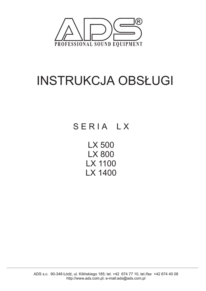 ® PROFESSIONAL SOUND EQUIPMENT INSTRUKCJA OBS£UGI SERIA LX LX 500 LX 800 LX 1100 LX 1400 ADS s.c. 90-348 £ódŸ, ul. Kiliñskiego 185; tel. +42 674 77 10, tel./fax +42 674 40 08 http://www.ads.com.pl; e-mail:[email protected] LX - Profesjonalne Wzmacniacze Mocy ADS WARUNKI GWARANCJI Firma ADS s.c.gwarantuje Pañstwu, ¿e zakupiony u autoryzowanego dystrybutora jej nowy produkt jest wolny od wad materia³owych i monta¿owych. W przypadku uszkodzenia zapewniamy bezp³atny serwis przez 36 miesiêcy od daty zakupu stwierdzonej w dowodzie sprzeda¿y, nie d³u¿ej jednak ni¿ 48 miesiêcy od daty produkcji. W ci¹gu 14 dni od daty zakupu nale¿y przes³aæ kartê rejestracyjn¹. Jeœli tego nie uczynisz firma ADS producent tego sprzêtu zagwarantuje Ci tylko 24 miesi¹ce gwarancji. W okresie gwarancyjnym nabywcy przys³uguje prawo bezp³atnej naprawy sprzêtu w przypadku uszkodzeñ wynikaj¹cych z wad produkcyjnych. Wady lub uszkodzenia ujawnione w okresie gwarancji bêd¹ usuwane przez autoryzowany serwis w terminie 21 dni od daty dostarczenia przez nabywcê sprzêtu do naprawy - termin mo¿e siê wyd³u¿yæ w przypadku koniecznoœci dostawy czêœci zamiennych z zagranicy. Okres gwarancyjny przed³u¿a siê o czas naprawy liczony od dnia dostarczenia sprzêtu do naprawy, do dnia wyznaczonego terminu jej wykonania. Naprawa gwarancyjna nie obejmuje czynnoœci przewidzianych w instrukcji obs³ugi do wykonania, których zobowi¹zany jest u¿ytkownik we w³asnym zakresie i na w³asny koszt na przyk³ad: zainstalowanie sprzêtu,sprawdzenie dzia³ania, konserwacja (w szczególnoœci czyszczenie filtra py³owego), wymiana bezpieczników. Gwarancj¹ nie s¹ objête: - uszkodzenia mechaniczne, chemiczne i termiczne oraz wywo³ane nimi wady - uszkodzenia i wady wynik³e z niew³aœciwego lub niezgodnego z instrukcj¹ obs³ugi zainstalowania, u¿ytkowania, przechowywania i konserwacji sprzêtu, - uszkodzenia spowodowane samowolnymi naprawami, przeróbkami lub zmianami konstrukcyjnymi sprzêtu dokonywanymi przez u¿ytkownika lub inne nieupowa¿nione przez producenta osoby, - uszkodzenia spowodowane przez zdarzenia losowe typu: po¿ar, przepiêcie w sieci itp. Bez karty gwarancyjnej sprzêt nie bêdzie naprawiany ! LX - Profesjonalne Wzmacniacze Mocy ADS ŒRODKI BEZPIECZEÑSTWA U¿ytkownik powinien dok³adnie zapoznaæ siê z wytycznymi bezpieczeñstwa zanim uruchomi urz¹dzenie. Trzeba zachowaæ niniejsz¹ instrukcjê obs³ugi w celu póŸniejszego wykorzystywania, jako Ÿród³o podstawowych informacji. Nale¿y starannie przestrzegaæ ostrze¿eñ i wytycznych, jakie s¹ umieszczone na urz¹dzeniu, albo odpowiednich informacji ostrzegawczych podanych w instrukcji obs³ugi. OSTRZE¯ENIE ! W celu zmniejszenia ryzyka pora¿enia pr¹dem elektrycznym i po¿aru, nale¿y chroniæ urz¹dzenie przed dzia³aniem deszczu i wilgoci. Nie otwieraæ obudowy, wewn¹trz zagra¿a niebezpiecznie, wysokie napiêcie i nie istniej¹ tam ¿adne czêœci dozwolone do obs³ugi przez u¿ytkownika. Tylko specjaliœcie mo¿na powierzyæ obs³ugê techniczn¹. PRZESTROGA ZAGRO¯ENIE PR¥DEM ELEKTRYCZNYM ! NIE OTWIERAÆ ! Symbol pioruna w równobocznym trójk¹cie ma na celu zwrócenie uwagi u¿ytkownika na “niebezpieczne napiêcie“, wystêpuj¹ce bez izolacji wewn¹trz urz¹dzenia.Napiêcie to mo¿e mieæ dostatecznie du¿¹ wartoœæ, aby stanowiæ zagro¿enie dla cz³owieka. ! Symbol wykrzyknika umieszczony w trójk¹cie równobocznym ma na celu zwrócenie uwagi u¿ytkownika na to, ¿e s¹ wytyczne obs³ugi i konserwacji (obs³uga techniczna), w postaci pisemnej za³¹czonej do egzemplarza urz¹dzenia. LX - Profesjonalne Wzmacniacze Mocy ADS ZALECENIA DOTYCZ¥CE BEZPIECZEÑSTWA USTAWIANIE URZ¥DZENIA Unikaj ustawiania urz¹dzenia w nastêpuj¹cych miejscach: - nara¿one na bezpoœrednie promienie s³oneczne - w których wystêpuje wysoka temperatura - w których panuje du¿a wilgotnoœæ - nara¿onych na silne wibracje - na nierównej powierzchni Takie warunki pracy mog¹ doprowadziæ do uszkodzenia obudowy i/lub innych czêœci - przez co skróci siê czas prawid³owego dzia³ania urz¹dzenia. WENTYLACJA Umieszczaj urz¹dzenie w miejscu, gdzie bêdzie mia³o zapewnion¹ dobr¹ wentylacjê w odleg³oœci przynajmniej 10 cm od œciany. Pamiêtaj aby zas³ony i inne podobne przedmioty nie zakrywa³y otworów wentylacyjnych. USTAWIANIE URZ¥DZEÑ NA WIERZCHU WZMACNIACZA Nie umieszczaj ciê¿kich przedmiotów na wierzchu urz¹dzenia, ani na przewodzie sieciowym. Mo¿e to doprowadziæ do trwa³ego odkszta³cenia górnej p³yty lub przeciêcia przewodu zasilaj¹cego. NAPIÊCIE ZASILAJ¥CE Urz¹dzenie nie mo¿e byæ zasilane z sieci pr¹du sta³ego. Starannie upewnij siê jakie parametry ma sieæ. OBCHODZENIE SIÊ Z PRZEWODEM SIECIOWYM Przy w³¹czaniu urz¹dzenia do sieci trzymaj mocno za wtyczkê i dobrze osadŸ j¹ w gnieŸdzie sieciowym. Nigdy nie dotykaj wtyczki wilgotnymi rêkoma. Unikaj przycinania, zarysowania, nadmiernego zginania, rozk³adania i sk³adania przewodu sieciowego. Mo¿e to spowodowaæ po¿ar lub pora¿enie elektryczne. Przy wy³¹czaniu urz¹dzenia z sieci nie ci¹gnij za przewód, poniewa¿ mo¿e to doprowadziæ do pora¿enia elektrycznego. CIA£A OBCE - nie dopuszczaj do tego aby cia³a obce, takie jak: ig³y, monety, œrubki itp. przypadkowo wpada³y do urz¹dzenia lub przedostawa³y siê przez otwory wentylacyjne, mo¿e to spowodowaæ uszkodzenie wzmacniacza lub pora¿enie elektryczne. - w ¿adnym wypadku nie dopuœæ do wylania wody lub innych p³ynów na urz¹dzenie, lub do jego wnêtrza, mo¿e to spowodowaæ po¿ar lub pora¿enie elektryczne (jeœli do tego dojdzie natychmiast wy³¹cz urz¹dzenie z sieci i skontaktuj siê z punktem serwisowym) - unikaj rozpylania œrodków w aerozolach w pobli¿u urz¹dzenia SERWIS Nigdy nie próbuj rozbieraæ, przerabiaæ lub naprawiaæ urz¹dzenia. Jeœli podczas pracy wyst¹pi¹ jakiekolwiek problemy (przerywany dŸwiêk, wskaŸniki nie œwiêc¹, widaæ dym itp.