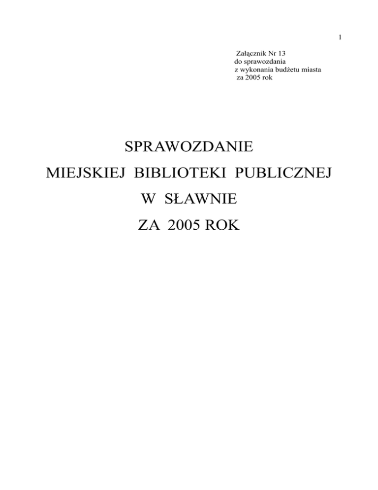 1 Załącznik Nr 13 do sprawozdania z wykonania budżetu miasta za 2005 rok SPRAWOZDANIE MIEJSKIEJ BIBLIOTEKI PUBLICZNEJ W SŁAWNIE ZA 2005 ROK 2 Dane liczbowe Miejskiej Biblioteki Publicznej w Sławnie za 2005 rok. 1. liczba czytelników 3788 2. liczba odwiedzin 48708 3. liczba wypożyczeń 123987 4. liczba udzielonych informacji 18078 5. liczba zakupionych książek 1431 6. liczba darów – książek 324 7. dotacja z Ministerstwa Kultury 14550 8. liczba dni otwarcia 241 9. średnia dzienna liczba odwiedzin 258 10.liczba ubytków 1349 11.średnia dzienna liczba wypożyczeń 514 12.stan księgozbioru 62448 13.liczba prenumerowanych czasopism 68 14.etaty ogółem: 9 - w tym bibliotekarze 6 15.średnia cena zakupu 1 książki 21,67 16.kwota zakupu książek 31021,00 17.kwota zakupu czasopism 9882,13 18.liczba dokumentów życia społecznego 803 19.grant z Fundacji S. Batorego 1974,00 3 Biblioteka i jej zbiory stanowią dobro narodowe oraz służą zachowaniu dziedzictwa narodowego. Biblioteka organizuje i zapewnia dostęp do zasobów nauki i kultury polskiej oraz światowej. Do podstawowych zadań biblioteki należy: 1. gromadzenie, opracowywanie, przechowywanie i ochrona materiałów bibliotecznych 2. obsługa użytkowników Ponadto do zadań bibliteki może należeć działalność bibliograficzna, dokumentacyjna, edukacyjna, popularyzatorska oraz instrukcyjno-metodyczna. I. Ogólna charakterystyka sieci 1. Liczba placówek : 2 – Miejska Biblioteka Publiczna oraz Filia; nie dokonano żadnych zmian organizacyjnych 2. Biblioteka posiada uregulowany status organizacyjny, zgodny z obowiązującymi przepisami prawnymi, posiada statut; jest wpisana do rejestru instytucji kultury pod nr 2. 3. Nie dokonano żadnych remontów, sytuacja nie uległa zmianie II.Księgozbiór 1. Źródłami pozyskiwania środków na zakup książek i prenumeratę czasopism są: budżet , dotacja z Ministerstwa Kultury, grant otrzymany od Fundacji im. Stefana Batorego, dary od czytelników oraz od Narodowego Banku Polskiego w Warszawie. Zakupy i dary zaspokajają 70% potrzeb czytelniczych.. 2. Podczas zakupu książek kierowano się preferencjami czytelników, nowościami rynkowymi, stopniem wykorzystania przez bibliotekę; zakupiono lektury, najnowsze opracowania encyklopedyczne, literaturę popularno-naukową i naukową. Książki z zakresu socjologii, filozofii, historii, prawa, ekonomii, zagadnień dot. UE. III.Czytelnicy 1. W 2005 odnotowno spadek zarejestrowanych czytelników o 135 , w każdej grupie wiekowej nastąpiły zmiany ( wzrost lub spadek). W czytelni multimedialnej Ikonka zarejestrowano blisko 5000 odwiedzin. Nastąpił wzrost zainteresowania literaturą 4 naukową i popularno-naukową. Przyczyną spadku ilości czytelników jest niż demograficzny uczęszczający do szkół, a także malejąca liczba mieszkańców Sławna. Czytelnicy wg wieku - do lat 15 1247 - 16-19 lat 855 - 20-24 lata 590 - 25-44 lata 682 - 45-60 lat 292 - powyżej 60 lat 122 - razem 3788 Czytelnicy wg zajęcia – uczniowie 2089 – studenci 250 – prac. Umysłowi 396 – robotnicy 114 – rolnicy 16 – inni zatrudnieni 124 – pozostali 799 – razem 3788 Ogólna liczba zarejestrowanych czytelników w 2005 roku wynosi 3788 tj: – MBP 1868 – Filia 683 – Oddział dla Dzieci 1237 – Razem 3788 Wniosek nr 1 1247 czytelników to młodzież do lat 15, stanowią oni 30,3% ogólnej liczby czytelników Wniosek nr 2 799 osób to niezatrudnieni ( emeryci i bezrobotni) – stanowią oni 21% ogólnej liczby czytelników. 5 Wniosek nr 3 Należy pieczołowicie uzupełnić zbiory służace czytelnikowi do lat 15. W 2005 roku zarejestrowano o 135 mniej czytelników niż w 2004 roku. Sławno w 2005 roku liczyło 13459 mieszkańców, a liczba czytelników wyniosła 3788, to znaczy, że co 3 mieszkaniec Sławna jest czytelnikiem Miejskiej Biblioteki Publicznej. Czytelnik to użytkownik, który przynajmniej raz w 2005 roku odwiedził Bibliotekę i wypożyczył przynajmniej 1 książkę. Użytkownicy Czytelni korzystający z materiałów bibliotecznych na miejscu nie są liczeni jako czytelnicy. W roku 2005 w województwie zachodnipomorskim czytelnictwem objętych było około 20% mieszkańców województwa – w Sławnie zaś 35,5%. Świadczy to o rozczytaniu społeczeństwa Sławna. Tak dobre wyniki czytelnictwa to efekt wieloletnich zabiegów i rozbudzania potrzeb czytelniczych Sławna np.: zapraszanie grup przedszkolnych na wycieczki i zajecia w bibliotece, spotkania z pisarzami i inne imprezy biblioteczne. 2. Liczba odwiedzin w bibliotece: 48708 IV.Udostępnianie zbiorów 1. Zwiększa się liczba osób korzystających z literatury naukowej i popularno-naukowej np. historii, ekonomii, pedagogiki, historii i geografii regionu 2.Biblioteka prowadzi wypożyczalnię miezybiblioteczną, sprowadzając i pożyczając książki z całego kraju m.in. . Książnicy Pomorskiej w Szczecinie,, Koszalińskiej Biblioteki Publicznaej, Biblioteki Raczyńskich w Poznaniu, Wojewódzkiej Biblioteki Publiczni w Gdańsku. Książki udostępniane są za darmo- tzn. czytelnik nie ponosi żadnych kosztów, związanych z sprowadzeniem książek. 3. Nowatorskie metody udostępniania: księgozbiór z Czytelni jest wypożyczany do domu na weekendy. Otwarcie Czytelni Multimedialnej “Ikonka” - udostępnianie zbiorów w wersji elektronicznej, dostęp do katalogów innych bibliotek on-line. Razem w bibliotekach publicznych miasta Sławno zanotowano 123987 wypożyczeń w tym 6 87457 na zewnątrz ( czytelnicy wzięli materiały do domu), oraz 36530 wypożyczenia na miesjcu w czytelniach. Biblioteka posiada 50 miejsc w czytelniach, średnio na 1 miejsce w czytelni przypada 730 wypożyczeń w ciągu roku. Ogólnie w MBP zanotowano 59462 wypożyczeń, w Oddziale dla Dzieci 34741, na Filii 29784. Tabela nr 1: Wypożyczenia na miejscu i na zewnątrz. Biblioteka MBP Oddział dla Dzieci i Młodzieży Filia Razem Całość Na zewnątrz Na miejscu 38982 25849 22626 87457 2048