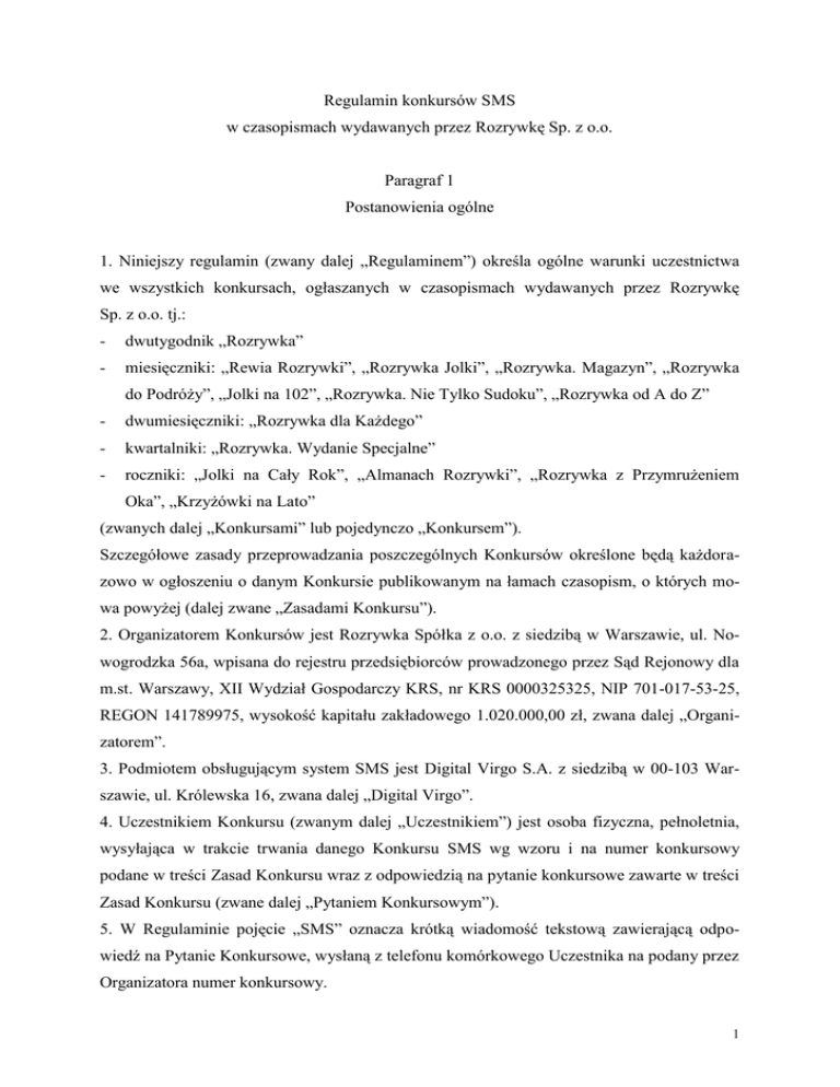 Regulamin konkursów SMS w czasopismach wydawanych przez Rozrywkę Sp. z o.o. Paragraf 1 Postanowienia ogólne 1. Niniejszy regulamin (zwany dalej „Regulaminem”) określa ogólne warunki uczestnictwa we wszystkich konkursach, ogłaszanych w czasopismach wydawanych przez Rozrywkę Sp. z o.o. tj.: - dwutygodnik „Rozrywka” - miesięczniki: „Rewia Rozrywki”, „Rozrywka Jolki”, „Rozrywka. Magazyn”, „Rozrywka do Podróży”, „Jolki na 102”, „Rozrywka. Nie Tylko Sudoku”, „Rozrywka od A do Z” - dwumiesięczniki: „Rozrywka dla Każdego” - kwartalniki: „Rozrywka. Wydanie Specjalne” - roczniki: „Jolki na Cały Rok”, „Almanach Rozrywki”, „Rozrywka z Przymrużeniem Oka”, „Krzyżówki na Lato” (zwanych dalej „Konkursami” lub pojedynczo „Konkursem”). Szczegółowe zasady przeprowadzania poszczególnych Konkursów określone będą każdorazowo w ogłoszeniu o danym Konkursie publikowanym na łamach czasopism, o których mowa powyżej (dalej zwane „Zasadami Konkursu”). 2. Organizatorem Konkursów jest Rozrywka Spółka z o.o. z siedzibą w Warszawie, ul. Nowogrodzka 56a, wpisana do rejestru przedsiębiorców prowadzonego przez Sąd Rejonowy dla m.st. Warszawy, XII Wydział Gospodarczy KRS, nr KRS 0000325325, NIP 701-017-53-25, REGON 141789975, wysokość kapitału zakładowego 1.020.000,00 zł, zwana dalej „Organizatorem”. 3. Podmiotem obsługującym system SMS jest Digital Virgo S.A. z siedzibą w 00-103 Warszawie, ul. Królewska 16, zwana dalej „Digital Virgo”. 4. Uczestnikiem Konkursu (zwanym dalej „Uczestnikiem”) jest osoba fizyczna, pełnoletnia, wysyłająca w trakcie trwania danego Konkursu SMS wg wzoru i na numer konkursowy podane w treści Zasad Konkursu wraz z odpowiedzią na pytanie konkursowe zawarte w treści Zasad Konkursu (zwane dalej „Pytaniem Konkursowym”). 5. W Regulaminie pojęcie „SMS” oznacza krótką wiadomość tekstową zawierającą odpowiedź na Pytanie Konkursowe, wysłaną z telefonu komórkowego Uczestnika na podany przez Organizatora numer konkursowy. 1 6. Nagrodami w Konkursach (zwane dalej „Nagrodami”) będą świadczenia, każdorazowo określane przy ogłaszaniu Konkursu wraz z treścią Zasad Konkursu. 7. Zwycięzcą Konkursu (zwanym dalej „Zwycięzcą”) jest Uczestnik, który zgłosił udział w danym Konkursie w okresie trwania tego Konkursu, spełnił warunki, o których mowa w ust. 3 paragrafu 2, i został poinformowany o powyższym fakcie telefonicznie przez Organizatora. 8. Terminy przyjmowania odpowiedzi na Pytania Konkursowe będą każdorazowo ogłaszane wraz z treścią Zasad Konkursu. Paragraf 2 Zasady uczestnictwa w Konkursach 1. Uczestnictwo w Konkursach polega na wysłaniu wiadomości SMS na numer podany w treści Zasad Konkursu z odpowiedzią na Pytanie Konkursowe, wg wzoru podawanego każdorazowo przy ogłaszaniu Konkursu wraz z treścią Zasad Konkursu. 2. Po wysłaniu SMS z poprawną odpowiedzią na Pytanie Konkursowe zawarte w ogłoszeniu Konkursu Uczestnik otrzyma od Organizatora wiadomość zwrotną potwierdzającą przesłanie zgłoszenia. 3. Zwycięzca zostanie wyłoniony spośród Uczestników, którzy spełnią łącznie następujące warunki: 3.1. Wyślą w trakcie trwanie danego Konkursu SMS na podany numer konkursowy zgodnie z postanowieniami Regulaminu. 3.2. Udzielą poprawnej odpowiedzi na Pytanie Konkursowe zgodnie z wzorem zamieszczonym w ogłoszeniu Konkursu. 3.3 Uczestnik udzielający poprawnej odpowiedzi na Pytanie Konkursowe będzie brał udział w losowaniu nagród podanych każdorazowo w ogłoszeniu o danym Konkursie. 3.4 Zwycięzca Konkursu zostanie poinformowany o wygranej telefonicznie (rozmowa telefoniczna) na numer telefonu komórkowego, z którego Uczestnik wysłał SMS. Powiadomienie nastąpi w dniu losowania podawanym każdorazowo przy ogłoszeniu Konkursu. Jeżeli Zwycięzca nie odbierze trzech kolejnych powiadomień o Nagrodzie, realizowanych w godzinach 2 od 9.00 do 14.00, traci prawo do Nagrody, a Nagroda zostanie przyznana kolejnemu Uczestnikowi. 4. Liczba oraz rodzaj Nagród w Konkursach będzie każdorazowo podana w ogłoszeniu o danym Konkursie. 5. Nagroda zostanie przekazana Zwycięzcy najpóźniej do końca miesiąca, w którym ukazał się numer czasopisma z listą Zwycięzców, zgodnie z datą wydawniczą podawaną na okładce. Lista Zwycięzców będzie zawierała następujące dane: imię i nazwisko, miejscowość. 6. Wygrana w Konkursie podlega opodatkowaniu z tytuły wygranej na podstawie ustawy o podatku dochodowym od osób fizycznych z dnia 26 lipca 2011 r. (Dz.U. z 2002, Nr 14 poz. 176 z póź.zm.). Organizator przed wydaniem nagród zwycięzcom Konkursu obliczy, pobierze od nich i odprowadzi do właściwego Urzędu Skarbowego zryczałtowany podatek dochodowy od wartości nagród w wysokości 10%, chyba że nagrody podlegają zwolnieniu z podatku. 7. Uczestnictwo w Konkursach jest dobrowolne, a Uczestnik może wysłać dowolną liczbę SMS-ów. 8. W Konkursie nie mogą brać udziału pracownicy Organizatora i Digital Virgo oraz członkowie ich najbliższych rodzin. Paragraf 3 Dane osobowe 1. W celu otrzymania Nagrody Zwycięzcy powinni podać swoje dane osobowe. Podanie danych osobowych powinno nastąpić podczas rozmowy telefonicznej. 2. Podanie danych osobowych jest dobrowolne, jednak niepodanie danych uniemożliwi dostarczenie Nagrody. W związku z tym Organizator zastrzega sobie prawo do odmowy wydania Nagrody w przypadku braku podania danych i przyznanie nagrody następnemu Uczestnikowi Konkursu. 3. Dane osobowe uzyskane od uczestników Konkursu zgodnie z postanowieniami niniejszego Regulaminu będą przechowywane w bazie danych. Dane osobowe będą przetwarzane dla celów związanych z realizacją opisywanych Konkursów, w tym rozpatrywaniem reklamacji przez Organizatora. Każdy uczestnik ma prawo wglądu w swoje dane, ich poprawiania, zmiany lub usunięcia. 4. Administratorem danych osobowych przetwarza